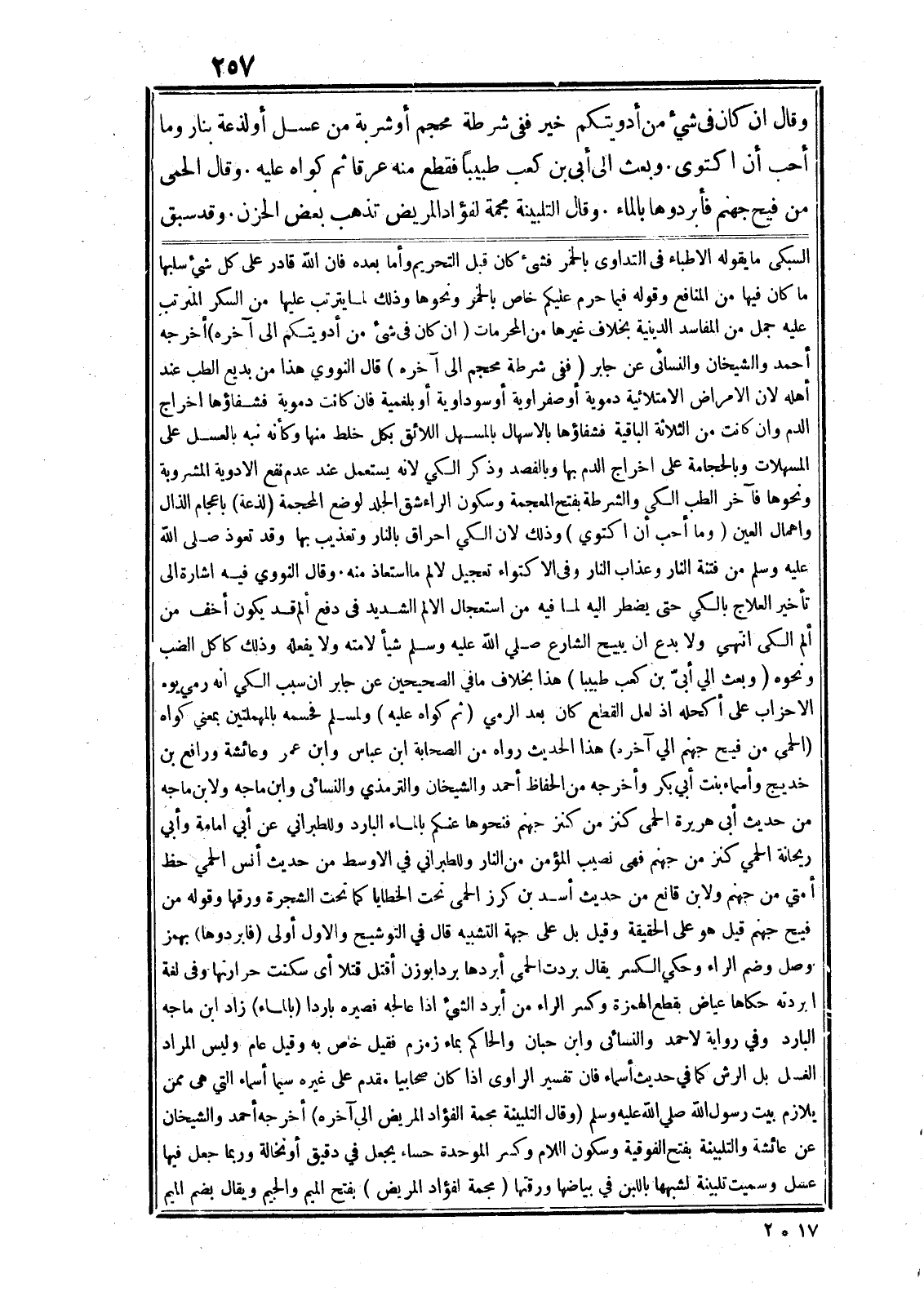 وقال ان كان في شيء من أدويتكم خير ففي شرطة محجم أو شربة من عسل أو لذعة بنار وما أحب أن اكتوى. وبعث الى أبى بن كعب طبيبا فقطع منه عرقا ثم كواه عليه. وقال الحمى من فيخ جهنم فأبردوها بالماء. وقال التلبينة مجمة لفؤاد المريض تذهب بعض الحزن. وقد سبق السبكى ما يقوله الاطباء في التداوى بالخمر فشيء كان قبل التحريم وأما بعده فان الله قادر على كل شيء سلبها ما كان فيها من المنافع وقوله فيما حرم عليكم خاص بالخمر ونحوها وذلك لما يترتب عليها من السكر المترتب عليه جمل من المفاسد الدينية بخلاف غيرها من المحرمات (ان كان في شيء من أدويتكم الى آخره) أخرجه أحمد والشيخان والنسائى عن جابر (ففي شرطة محجم الى آخره) قال النووي هذا من بديع الطب عند أهله لان الامراض الامتلائية دموية أو صفراوية أو سوداوية أو بلغمية فان كانت دموية فشفاؤها اخراج الدم وان كانت من الثلاثة الباقية فشفاؤها بالاسهال بالمسهل اللائق بكل خلط منها وكأنه نبه بالعسل على المسهلات وبالحجامة على اخراج الدم بها وبالفصد وذكر الكي لانه يستعمل عند عدم نفع الادوية المشروبة ونحوها فآخر الطب الكى والشرطة بفتح المعجمة وسكون الراء شق الجلد لوضع المحجمة (لذعة) باعجام الذال واهمال العين (وما أحب أن اكتوي) وذلك لان الكي احراق بالنار وتعذيب بها وقد تعوذ صلى الله عليه وسلم من فتنة النار وعذاب النار وفي الاكتواء تعجيل لالم ما استعاذ منه. وقال النووي فيه اشارة الى تأخير العلاج بالكي حتى يضطر اليه لما فيه من استعجال الالم الشديد في دفع ألم قد يكون أخف من ألم الكى انتهي ولا بدع ان يبيح الشارع صلى الله عليه وسلم شيأ لامته ولا يفعله وذلك كاكل الضب ونحوه (وبعث الي أبيّ بن كعب طبيبا) هذا بخلاف ما في الصحيحين عن جابر ان سبب الكي انه رمي يوم الاحزاب على أكحله اذ لعل القطع كان بعد الرمي (ثم كواه عليه) ولمسلم فحسمه بالمهملتين بمعني كواه (الحمى من فيح جهنم الي آخره) هذا الحديث رواه من الصحابة ابن عباس وابن عمر وعائشة ورافع بن خديج وأسماء بنت أبي بكر وأخرجه من الحفاظ أحمد والشيخان والترمذي والنسائى وابن ماجه ولابن ماجه من حديث أبى هريرة الحمى كنز من كنز جهنم فنحوها عنكم بالماء البارد وللطبراني عن أبي امامة وأبي ريحانة الحمي كنز من جهنم فهى نصيب المؤمن من النار وللطبراني في الاوسط من حديث أنس الحمي حظ أمتي من جهنم ولابن قانع من حديث أسد بن كرز الحمى تحت الخطايا كما تحت الشجرة ورقها وقوله من فيح جهنم قيل هو على الحقيقة وقيل بل على جهة التشبيه قال في التوشيح والاول أولى (فابردوها) بهمز وصل وضم الراء وحكي الكسر يقال بردت الحمى أبردها بردا بوزن أقتل قتلا أى سكنت حرارتها وفي لغة ابردته حكاها عياض بقطع الهمزة وكسر الراء من أبرد الشيء اذا عالجه فصيره باردا (بالماء) زاد ابن ماجه البارد وفي رواية لاحمد والنسائى وابن حبان والحاكم بماء زمزم فقيل خاص به وقيل عام وليس المراد الغسل بل الرش كما في حديث أسماء فان تفسير الراوى اذا كان صحابيا مقدم على غيره سيما أسماء التي هى ممن يلازم بيت رسول الله صلى الله عليه وسلم (وقال التلبينة مجمة الفؤاد المريض الى آخره) أخرجه أحمد والشيخان عن عائشة والتلبينة بفتح الفوقية وسكون اللام وكسر الموحدة حساء يجعل في دقيق أو نخالة وربما جعل فيها عسل وسميت تلبينة لشبهها باللبن في بياضها ورقتها (مجمة لفؤاد المريض) بفتح الميم والجيم ويقال بضم الميم
