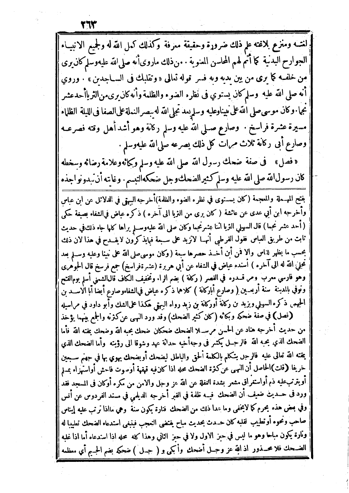 (فصل) في صفة ضحكه وبكائه (كان كثير الضحك) وقد ورد النهى عن كثرته والجمع بينهما يؤخذ من حديث أخرجه هناد عن الحسن مرسلا الضحك ضحكان ضحك يحبه الله وضحك يمقته الله فأما الضحك الذي يحبه الله فالرجل يكشر في وجه أخيه حداثة عهد وشوقا الى رؤيته وأما الضحك الذي يمقته الله تعالى عليه فالرجل يتكلم بالكلمة ألحق والباطل ليضحك أو يضحك يهوي بها في جهنم سبعين خريفا (قلت) الحاصل أن النهى عن كثرة الضحك محله اذا كان فيه قهقهة أو صوت فاحش أو استهزاء بمسلم أو يترتب عليه ذم أو استغراق مشعر بشدة الغفلة عن الله عز وجل والامن من مكره أو كان في المسجد فقد ورد في حديث ضعيف أن الضحك فيه ظلمة في القبر أخرجه الديلمي في مسند الفردوس عن أنس وفي بعض هذه يحرم كما لا يخفي وما عدا ذلك من الضحك فتارة يكون سنة وهي ما اذا ترتب عليه إيناس صاحب ونحوه أو تطييب لقلبه كان حدث بحديث مباح يقتضى التعجب فينبغى استدعاء الضحك تطييبا له وتارة يكون مباحا وهو ما ليس في حيز الاول ولا في حيز الثاني وهذا كله محله اذا استدعاه أما اذا غلبه الضحك فلا محذور اذ الله عز وجل أضحك وأبكى و (جل) ضحكه بضم الجيم أي معظمه