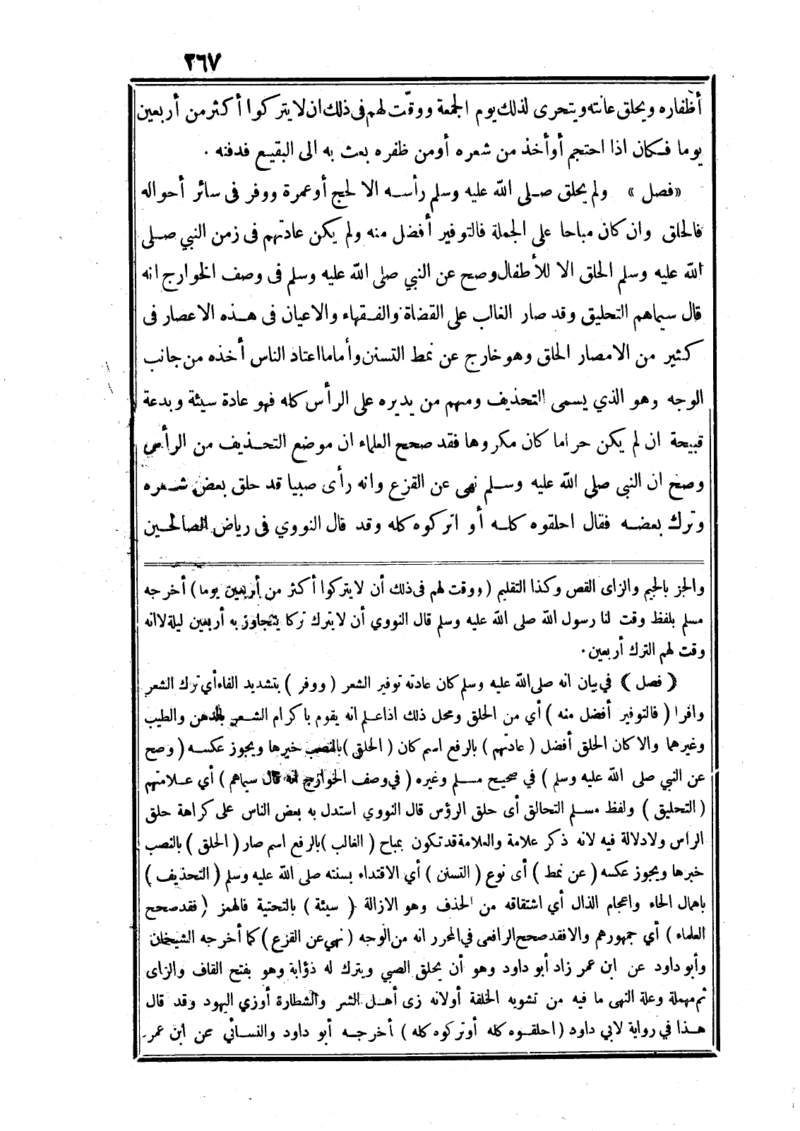 «فصل» ولم يحلق صلى الله عليه وسلم رأسه الا لحج أو عمرة ووفر في سائر أحواله فالحلق وان كان مباحا على الجملة فالتوفير أفضل منه ولم يكن عادتهم في زمن النبي صلى الله عليه وسلم الحلق الا للأطفال وصح عن النبي صلى الله عليه وسلم في وصف الخوارج انه قال سيماهم التحليق وقد صار الغالب على القضاة والفقهاء والاعيان في هذه الاعصار في كثير من الامصار الحلق وهو خارج عن نمط التسنن وأما ما اعتاد الناس أخذه من جانب الوجه وهو الذي يسمى التحذيف ومنهم من يديره على الرأس كله فهو عادة سيئة وبدعة قبيحة ان لم يكن حراما كان مكروها فقد صحح العلماء ان موضع التحذيف من الرأس وصح ان النبى صلى الله عليه وسلم نهى عن القزع وانه رأى صبيا قد حلق بعض شعره وترك بعضه فقال احلقوه كله أو اتركوه كله وقد قال النووي في رياض الصالحين والجز بالجيم والزاى القص وكذا التقليم (ووقت لهم في ذلك أن لا يتركوا أكثر من أربعين يوما) أخرجه مسلم بلفظ وقت لنا رسول الله صلى الله عليه وسلم قال النووي أن لا يترك تركا يتجاوز به أربعين ليلة لا انه وقت لهم الترك أربعين.