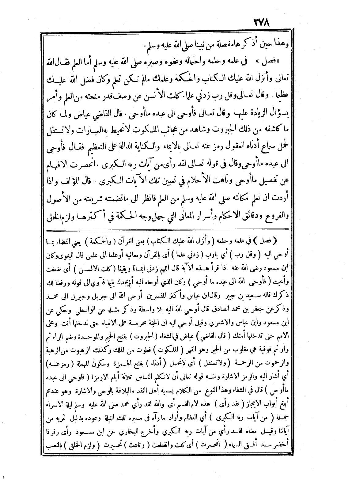 وقال في قوله تعالى لَقَدْ رَأى مِنْ آياتِ رَبِّهِ الْكُبْرى. انحصرت الافهام عن تفصيل ما أوحى وتاهت الأحلام في تعيين تلك الآيات الكبرى. قال المؤلف واذا أردت ان تعلم مكانته صلى الله عليه وسلم من العلم فانظر الى ما تضمنته شريعته من الأصول والفروع ودقائق الاحكام وأسرار المعانى التي جهل وجه الحكمة في أكثرها ولزم الخلق (فصل) في علمه وحلمه (وَأَنْزَلَ اللَّهُ عَلَيْكَ الْكِتابَ) يعنى القرآن (وَالْحِكْمَةَ) يعني القضاء بما أوحي اليه (وَقُلْ رَبِّ) أي يا رب (زِدْنِي عِلْماً) أى بالقرآن ومعانيه أو علما الى علمى قال البغوى وكان ابن مسعود رضى الله عنه اذا قرأ هذه الآية قال اللهم زدنى ايمانا ويقينا (كلت الالسن) أى ضعفت وأعيت (فَأَوْحى إِلى عَبْدِهِ ما أَوْحى) وكان الذي أوحاه اليه أَلَمْ يَجِدْكَ يَتِيماً فَآوى الى قوله وَرَفَعْنا لَكَ ذِكْرَكَ قاله سعيد بن جبير وقال ابن عباس وأكثر المفسرين أوحى الله الى جبريل وجبريل الى محمد وذكر عن جعفر بن محمد الصادق قال أوحي الله اليه بلا واسطة وذكر مثله عن الواسطي وحكي عن ابن مسعود وابن عباس والاشعري وقيل أوحي اليه ان الجنة محرمة على الانبياء حتى تدخلها أنت وعلى الامم حتى تدخلها أمتك (قال القاضي) عياض في الشفاء (الجبروت) بفتح الجيم والموحدة وضم الراء ثم واو ثم فوقية هي مقلوب من الجبر وهو القهر (الملكوت) فعلوت من الملك وكذلك الرهبوت من الرهبة والرحموت من الرحمة (ولا تستقل) أى لا تحمل (أدناه) بفتح الهمزة وسكون المهملة (رمز عنه) أي أشار اليه والرمز الاشارة ومنه قوله تعالى أَلَّا تُكَلِّمَ النَّاسَ ثَلاثَةَ أَيَّامٍ إِلَّا رَمْزاً (فَأَوْحى إِلى عَبْدِهِ ما أَوْحى) قال في الشفاء وهذا النوع من الكلام يسميه أهل النقد والبلاغة بالوحي والاشارة وهو عندهم أبلغ أبواب الايجاز (لَقَدْ رَأى) هذه لام القسم أى والله لقد رأي محمد صلى الله عليه وسلم ليلة الاسراء جملة (مِنْ آياتِ رَبِّهِ الْكُبْرى) أي العظام وأراد ما رآه في مسيره تلك الليلة وعوده بدليل لنريه من آياتنا وقيل معناه لقد رأي من آيات ربه الكبري وأخرج البخاري عن ابن مسعود رأى رفرفا أخضر سد أفق السماء (انحسرت) أى كلت وانقطعت (وتاهت) تحيرت (ولزم الخلق) بالنصب