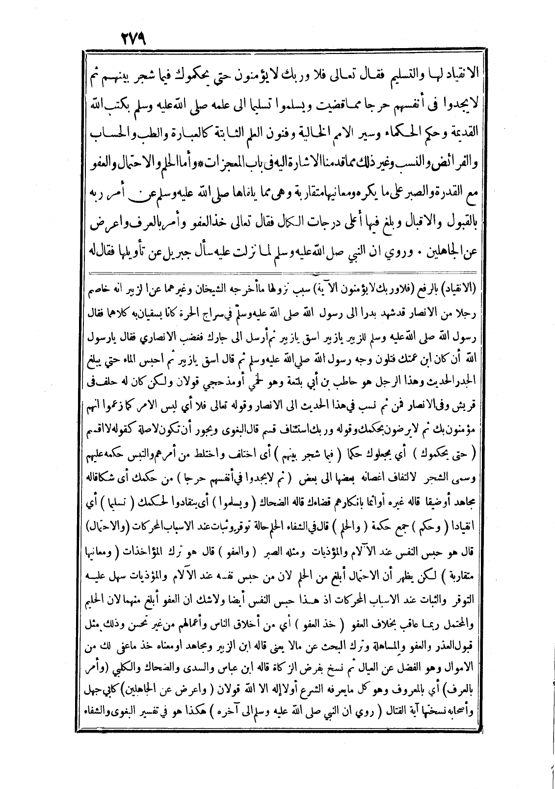 الانقياد لها والتسليم فقال تعالى فَلا وَرَبِّكَ لا يُؤْمِنُونَ حَتَّى يُحَكِّمُوكَ فِيما شَجَرَ بَيْنَهُمْ ثُمَّ لا يَجِدُوا فِي أَنْفُسِهِمْ حَرَجاً مِمَّا قَضَيْتَ وَيُسَلِّمُوا تَسْلِيماً الى علمه صلى الله عليه وسلم بكتب الله القديمة وحكم الحكماء وسير الامم الخالية وفنون العلم الثابتة كالعبارة والطب والحساب والفرائض والنسب وغير ذلك مما قدمنا الاشارة اليه في باب المعجزات* وأما الحلم والاحتمال والعفو مع القدرة والصبر على ما يكره ومعانيها متقاربة وهى مما يلقاها صلى الله عليه وسلم عن أمر ربه بالقبول والاقبال وبلغ فيها أعلى درجات الكمال فقال تعالى خُذِ الْعَفْوَ وَأْمُرْ بِالْعُرْفِ وَأَعْرِضْ عَنِ الْجاهِلِينَ. وروي ان النبي صلى الله عليه وسلم لما نزلت عليه سأل جبريل عن تأويلها فقال له (الانقياد) بالرفع (فَلا وَرَبِّكَ لا يُؤْمِنُونَ الآية) سبب نزولها ما أخرجه الشيخان وغيرهما عن الزبير انه خاصم رجلا من الانصار قد شهد بدرا الى رسول الله صلى الله عليه وسلم في سراج الحرة كانا يسقيان به كلاهما فقال رسول الله صلى الله عليه وسلم للزبير يا زبير اسق يا زبير ثم أرسل الى جارك فغضب الانصاري فقال يا رسول الله أن كان ابن عمتك فتلون وجه رسول الله صلى الله عليه وسلم ثم قال اسق يا زبير ثم احبس الماء حتى يبلغ الجدر الحديث وهذا الرجل هو حاطب بن أبي بلتعة وهو لخمي أو مذحجي قولان ولكن كان له حلف في قريش وفي الانصار فمن ثم نسب في هذا الحديث الى الانصار وقوله تعالى فَلا أي ليس الامر كما زعموا انهم مؤمنون بك ثم لا يرضون بحكمك وقوله وَرَبِّكَ استئناف قسم قال البغوى ويجوز أن تكون لا صلة كقوله لا أُقْسِمُ (حَتَّى يُحَكِّمُوكَ) أي يجعلوك حكما (فِيما شَجَرَ بَيْنَهُمْ) أى اختلف واختلط من أمرهم والتبس حكمه عليهم وسمى الشجر لالتفاف اغصانه بعضها الى بعض (ثُمَّ لا يَجِدُوا فِي أَنْفُسِهِمْ حَرَجاً) من حكمك أى شكا قاله مجاهد أو ضيقا قاله غيره أو اثما بانكارهم قضاءك قاله الضحاك (وَيُسَلِّمُوا) أى ينقادوا الحكمك (تَسْلِيماً) أي انقيادا (وحكم) جمع حكمة (والحلم) قال في الشفاء الحلم حالة توقر وثبات عند الاسباب المحركات (والاحتمال) قال هو حبس النفس عند الآلام والمؤذيات ومثله الصبر (والعفو) قال هو ترك المؤاخذات (ومعانيها متقاربة) لكن يظهر أن الاحتمال أبلغ من الحلم لان من حبس نفسه عند الآلام والمؤذيات سهل عليه التوقر والثبات عند الاسباب المحركات اذ هذا حبس النفس أيضا ولا شك ان العفو أبلغ منهما لان الحليم والمحتمل ربما عاقب بخلاف العفو (خُذِ الْعَفْوَ) أي من أخلاق الناس وأعمالهم من غير تحسن وذلك مثل قبول العذر والعفو والمساهلة وترك البحث عن مالا يعنى قاله ابن الزبير ومجاهد او معناه خذ ما عفي لك من الاموال وهو الفضل عن العيال ثم نسخ بفرض الزكاة قاله ابن عباس والسدى والضحاك والكلبي (وَأْمُرْ بِالْعُرْفِ) أي بالمعروف وهو كل ما يعرفه الشرع أو لا إله الا الله قولان (وَأَعْرِضْ عَنِ الْجاهِلِينَ) كابي جهل وأصحابه نسختها آية القتال (روي ان النبي صلى الله عليه وسلم الى آخره) هكذا هو في تفسير البغوى والشفاء