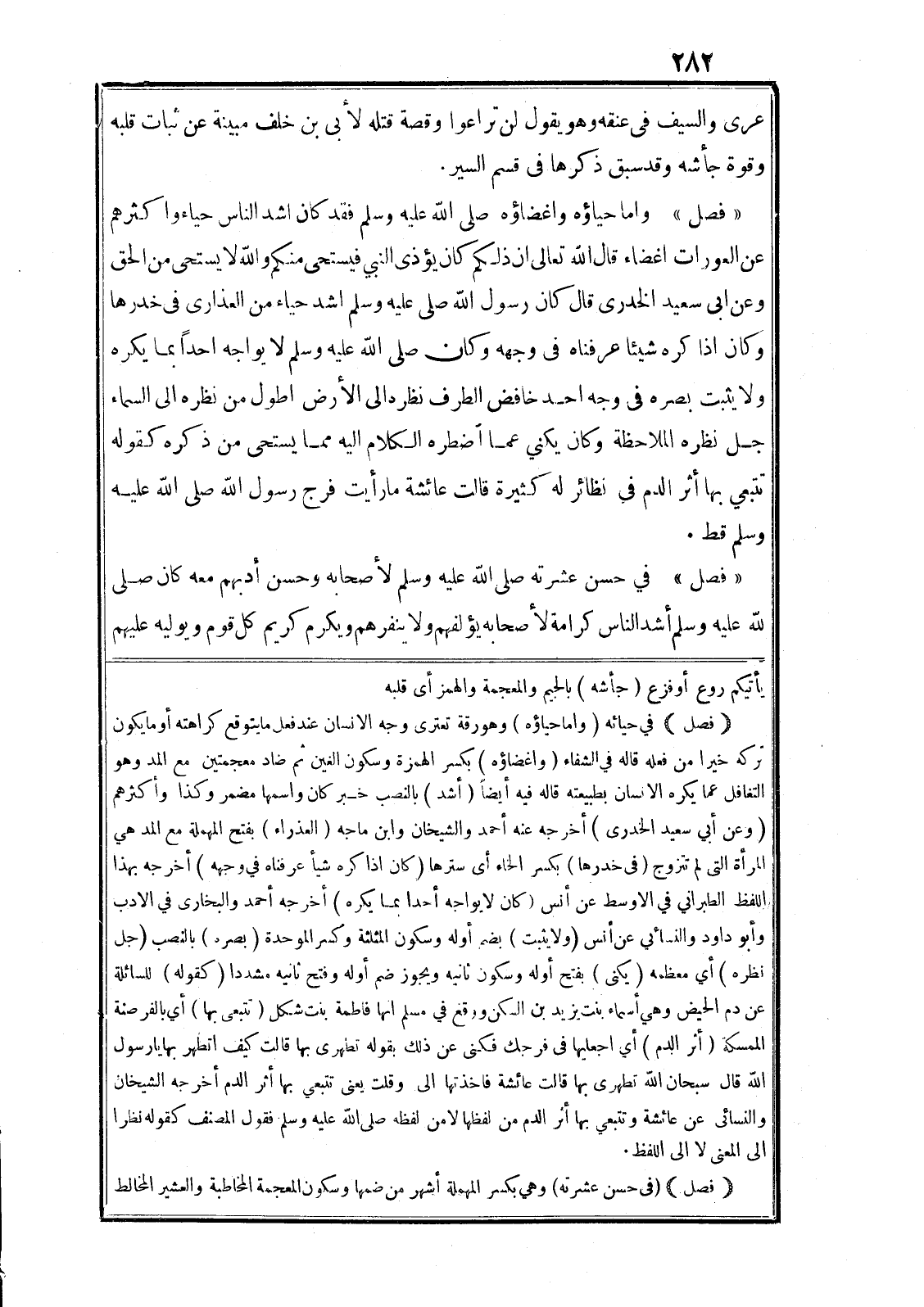 (فصل) في حياته (واما حياؤه) وهو رقة تعترى وجه الانسان عند فعل ما يتوقع كراهته أو ما يكون تركه خيرا من فعله قاله في الشفاء (واغضاؤه) بكسر الهمزة وسكون الغين ثم ضاد معجمتين مع المد وهو التغافل عما يكره الانسان بطبيعته قاله فيه أيضا (أشد) بالنصب خبر كان واسمها مضمر وكذا وأكثرهم (وعن أبي سعيد الخدرى) أخرجه عنه أحمد والشيخان وابن ماجه (العذراء) بفتح المهملة مع المد هي المرأة التى لم تتزوج (في خدرها) بكسر الخاء أى سترها (كان اذا كره شيأ عرفناه في وجهه) أخرجه بهذا اللفظ الطبراني في الاوسط عن أنس (كان لا يواجه أحدا بما يكره) أخرجه أحمد والبخارى في الادب وأبو داود والنسائي عن أنس (ولا يثبت) بضم أوله وسكون المثلثة وكسر الموحدة (بصره) بالنصب (جل نظره) أي معظمه (يكنى) بفتح أوله وسكون ثانيه ويجوز ضم أوله وفتح ثانيه مشددا (كقوله) للسائلة عن دم الحيض وهي أسماء بنت يزيد بن السكن ووقع في مسلم انها فاطمة بنت شكل (تتبعى بها) أي بالفرضة الممسكة (أثر الدم) أي اجعليها في فرجك فكنى عن ذلك بقوله تطهرى بها قالت كيف اتطهر بها يا رسول الله قال سبحان الله تطهرى بها قالت عائشة فاخذتها الى وقلت يعنى تتبعي بها أثر الدم أخرجه الشيخان والنسائى عن عائشة وتتبعي بها أثر الدم من لفظها لا من لفظه صلى الله عليه وسلم فقول المصنف كقوله نظرا الى المعنى لا الى اللفظ.