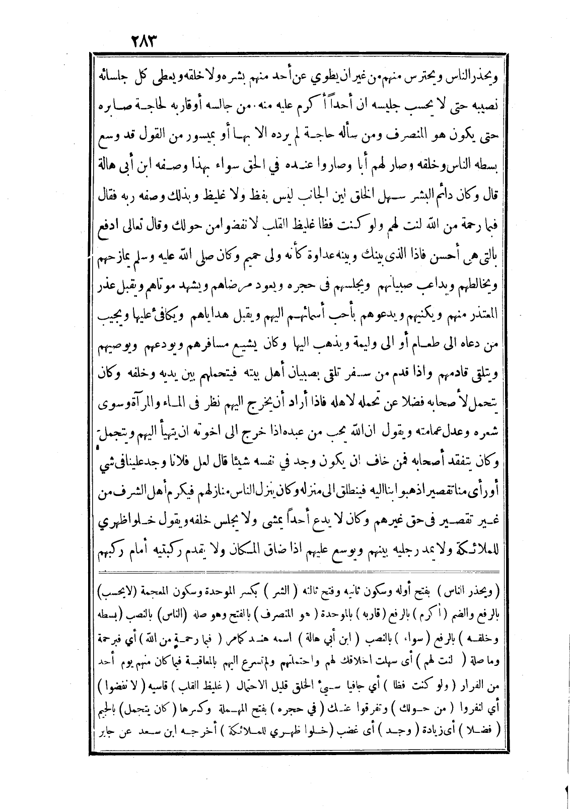 ويحذر الناس ويحترس منهم من غير ان يطوي عن أحد منهم بشره ولا خلقه ويعطى كل جلسائه نصيبه حتى لا يحسب جليسه ان أحدا أكرم عليه منه. من جالسه أو قاربه لحاجة صابره حتى يكون هو المنصرف ومن سأله حاجة لم يرده الا بها أو بميسور من القول قد وسع بسطه الناس وخلقه وصار لهم أبا وصاروا عنده في الحق سواء بهذا وصفه ابن أبى هالة قال وكان دائم البشر سهل الخلق لين الجانب ليس بفظ ولا غليظ وبذلك وصفه ربه فقال فيما رحمة من الله لنت لهم ولو كنت فظا غليظ القلب لانفضوا من حولك وقال تعالى ادْفَعْ بِالَّتِي هِيَ أَحْسَنُ فَإِذَا الَّذِي بَيْنَكَ وَبَيْنَهُ عَداوَةٌ كَأَنَّهُ وَلِيٌّ حَمِيمٌ وكان صلى الله عليه وسلم يمازحهم ويخالطهم ويداعب صبيانهم ويجلسهم في حجره ويعود مرضاهم ويشهد موتاهم ويقبل عذر المعتذر منهم ويكنيهم ويدعوهم بأحب أسمائهم اليهم ويقبل هداياهم ويكافئ عليها ويجيب من دعاه الى طعام أو الى وليمة ويذهب اليها وكان يشيع مسافرهم ويودعهم ويوصيهم ويتلقى قادمهم واذا قدم من سفر تلقى بصبيان أهل بيته فيتحملهم بين يديه وخلفه وكان يتحمل لأصحابه فضلا عن تحمله لاهله فاذا أراد أن يخرج اليهم نظر في الماء والمرآة وسوى شعره وعدل عمامته ويقول ان الله يحب من عبده اذا خرج الى اخوته ان يتهيأ اليهم ويتجمل وكان يتفقد أصحابه فمن خاف ان يكون وجد في نفسه شيئا قال لعل فلانا وجد علينا في شي أو رأى منا تقصير اذهبوا بنا اليه فينطلق الى منزله وكان ينزل الناس منازلهم فيكرم أهل الشرف من غير تقصير في حق غيرهم وكان لا يدع أحدا يمشى ولا يجلس خلفه ويقول خلوا ظهري للملائكة ولا يمد رجليه بينهم ويوسع عليهم اذا ضاق المكان ولا يقدم ركبتيه أمام ركبهم (ويحذر الناس) بفتح أوله وسكون ثانيه وفتح ثالثه (الشر) بكسر الموحدة وسكون المعجمة (لا يحسب) بالرفع والضم (أكرم) بالرفع (قاربه) بالموحدة (هو المنصرف) بالفتح وهو صلة (الناس) بالنصب (بسطه وخلقه) بالرفع (سواء) بالنصب (ابن أبي هالة) اسمه هند كما مر (فيما رحمة من الله) أي فبرحمة وما صلة (لنت لهم) أى سهلت اخلاقك لهم واحتملتهم ولم تسرع اليهم بالمعاقبة فيما كان منهم يوم أحد من الفرار (ولو كنت فظا) أي جافيا سيء الخلق قليل الاحتمال (غليظ القلب) قاسيه (لانفضوا) أي لنفروا (من حولك) وتفرقوا عنك (في حجره) بفتح المهملة وكسرها (كان يتجمل) بالجيم (فضلا) أى زيادة (وجد) أى غضب (خلوا ظهري للملائكة) أخرجه ابن سعد عن جابر