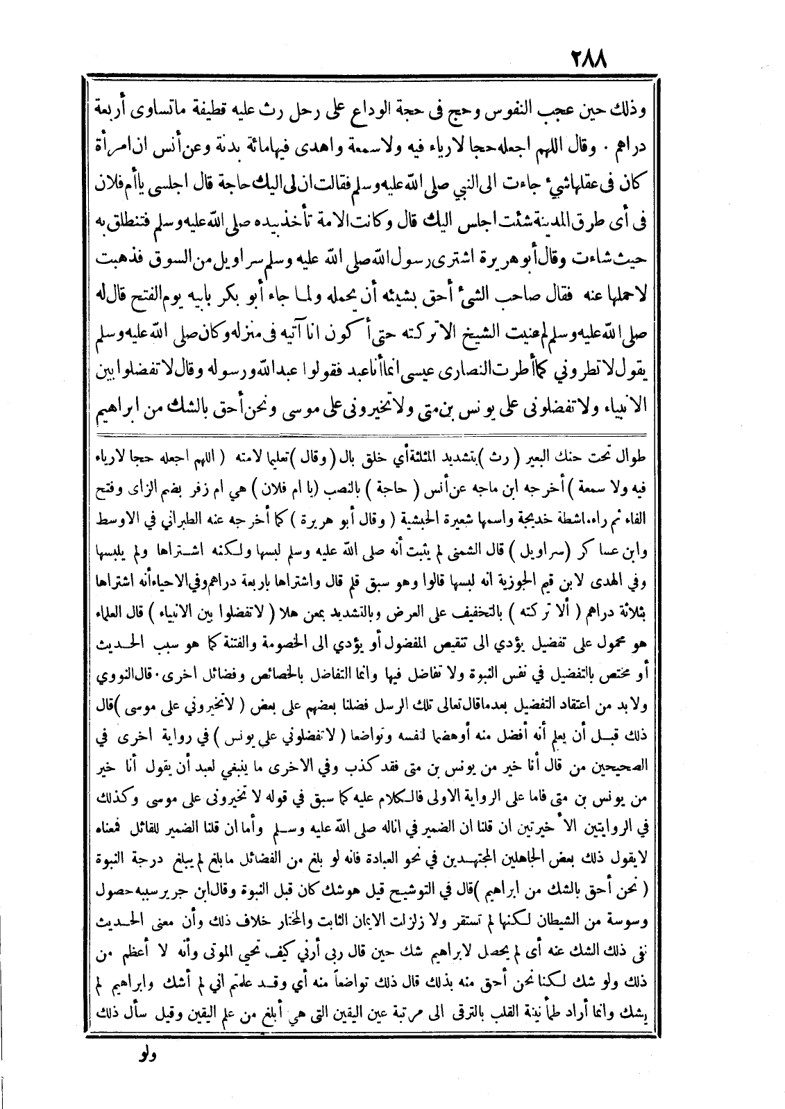وذلك حين عجب النفوس وحج في حجة الوداع على رحل رث عليه قطيفة ما تساوى أربعة دراهم. وقال اللهم اجعله حجا لا رياء فيه ولا سمعة واهدى فيها مائة بدنة وعن أنس ان امرأة كان في عقلها شيء جاءت الى النبي صلى الله عليه وسلم فقالت ان لى اليك حاجة قال اجلسى يا أم فلان في أى طرق المدينة شئت اجلس اليك قال وكانت الامة تأخذ بيده صلى الله عليه وسلم فتنطلق به حيث شاءت وقال أبو هريرة اشترى رسول الله صلى الله عليه وسلم سراويل من السوق فذهبت لاحملها عنه فقال صاحب الشيء أحق بشيئه أن يحمله ولما جاء أبو بكر بابيه يوم الفتح قال له صلى الله عليه وسلم لم عنيت الشيخ الا تركته حتى أكون انا آتيه في منزله وكان صلى الله عليه وسلم يقول لا تطروني كما أطرت النصارى عيسى انما أنا عبد فقولوا عبد الله ورسوله وقال لا تفضلوا بين الانبياء ولا تفضلونى على يونس بن متى ولا تخيرونى على موسى ونحن أحق بالشك من ابراهيم طوال تحت حنك البعير (رث) بتشديد المثلثة أي خلق بال (وقال) تعليما لامته (اللهم اجعله حجا لا رياء فيه ولا سمعة) أخرجه ابن ماجه عن أنس (حاجة) بالنصب (يا ام فلان) هي ام زفر بضم الزاى وفتح الفاء ثم راء ماشطة خديجة واسمها شعيرة الحبشية (وقال أبو هريرة) كما أخرجه عنه الطبراني في الاوسط وابن عساكر (سراويل) قال الشمنى لم يثبت أنه صلى الله عليه وسلم لبسها ولكنه اشتراها ولم يلبسها وفي الهدى لابن قيم الجوزية انه لبسها قالوا وهو سبق قلم قال واشتراها باربعة دراهم وفي الاحياء أنه اشتراها بثلاثة دراهم (ألا تركته) بالتخفيف على العرض وبالتشديد بمعن هلا (لا تفضلوا بين الانبياء) قال العلماء هو محمول على تفضيل يؤدي الى تنقيص المفضول أو يؤدي الى الخصومة والفتنة كما هو سبب الحديث أو مختص بالتفضيل في نفس النبوة ولا تفاضل فيها وانما التفاضل بالخصائص وفضائل اخرى. قال النووي ولا بد من اعتقاد التفضيل بعد ما قال تعالى تِلْكَ الرُّسُلُ فَضَّلْنا بَعْضَهُمْ عَلى بَعْضٍ (لا تخيروني على موسى) قال ذلك قبل أن يعلم أنه أفضل منه أو هضما لنفسه وتواضعا (لا تفضلوني على يونس) في رواية اخرى في الصحيحين من قال أنا خير من يونس بن متى فقد كذب وفي الاخرى ما ينبغي لعبد أن يقول أنا خير من يونس بن متى فاما على الرواية الاولى فالكلام عليه كما سبق في قوله لا تخيرونى على موسى وكذلك في الروايتين الأخيرتين ان قلنا ان الضمير في اناله صلى الله عليه وسلم وأما ان قلنا الضمير للقائل فمعناه لا يقول ذلك بعض الجاهلين المجتهدين في نحو العبادة فانه لو بلغ من الفضائل ما بلغ لم يبلغ درجة النبوة (نحن أحق بالشك من ابراهيم) قال في التوشيح قيل هو شك كان قبل النبوة وقال ابن جرير سببه حصول وسوسة من الشيطان لكنها لم تستقر ولا زلزلت الايمان الثابت والمختار خلاف ذلك وأن معنى الحديث نفي ذلك الشك عنه أى لم يحصل لابراهيم شك حين قال ربى أرني كيف تحيى الموتى وأنه لا أعظم من ذلك ولو شك لكنا نحن أحق منه بذلك قال ذلك تواضعا منه أي وقد علمتم اني لم أشك وابراهيم لم يشك وانما أراد طمأنينة القلب بالترقى الى مرتبة عين اليقين التى هي أبلغ من علم اليقين وقيل سأل ذلك
