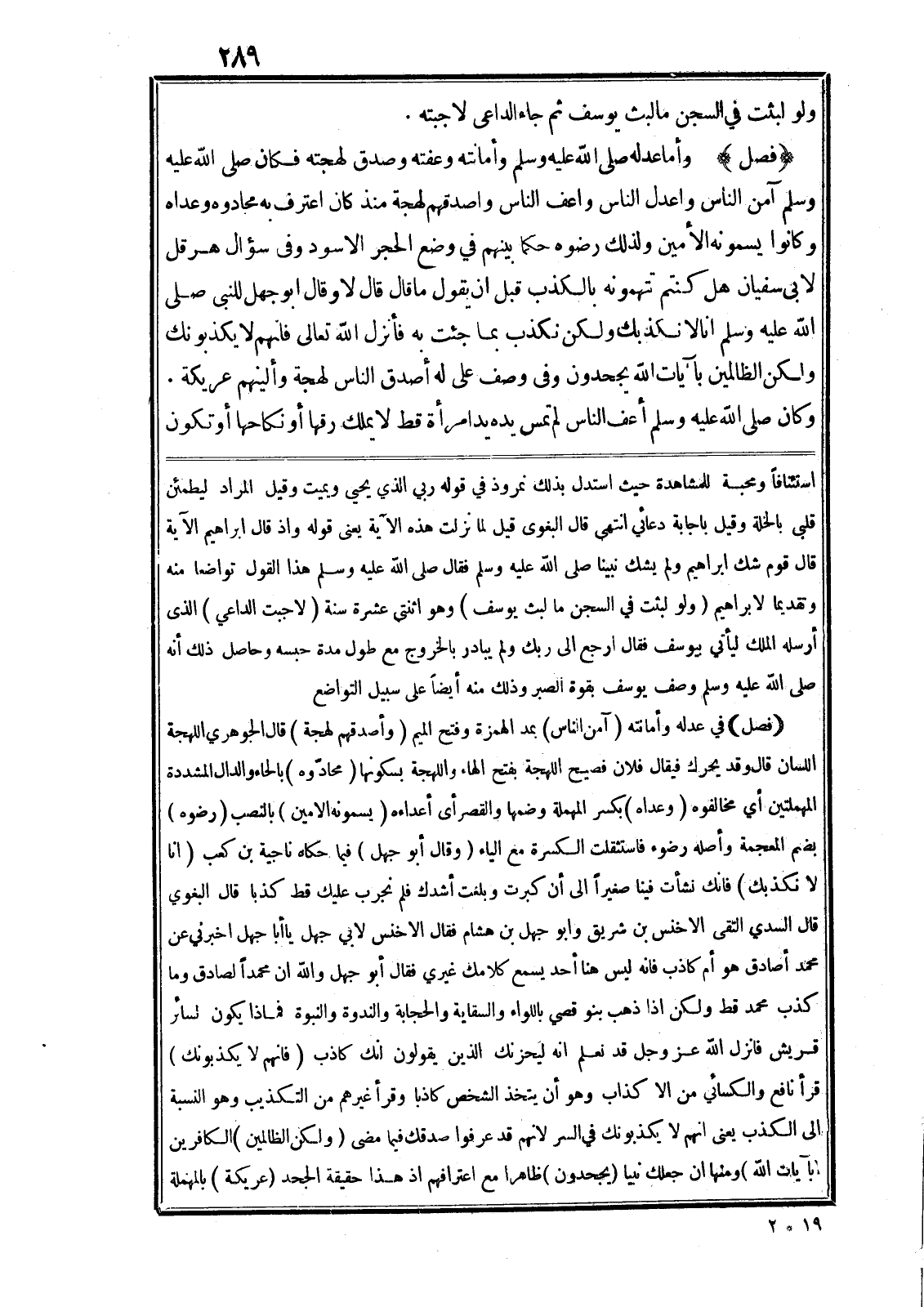 (فصل) في عدله وأمانته (آمن الناس) بمد الهمزة وفتح الميم (وأصدقهم لهجة) قال الجوهري اللهجة اللسان قال وقد يحرك فيقال فلان فصيح اللهجة بفتح الهاء واللهجة بسكونها (محادّوه) بالحاء والدال المشددة المهملتين أي مخالفوه (وعداه) بكسر المهملة وضمها والقصر أى أعداءه (يسمونه الامين) بالنصب (رضوه) بضم المعجمة وأصله رضوء فاستثقلت الكسرة مع الياء (وقال أبو جهل) فيما حكاه ناجية بن كعب (انا لا نكذبك) فانك نشأت فينا صغيرا الى أن كبرت وبلغت أشدك فلم نجرب عليك قط كذبا قال البغوي قال السدي التقى الاخنس بن شريق وابو جهل بن هشام فقال الاخنس لابي جهل يا أبا جهل اخبرني عن محمد أصادق هو أم كاذب فانه ليس هنا أحد يسمع كلامك غيري فقال أبو جهل والله ان محمدا لصادق وما كذب محمد قط ولكن اذا ذهب بنو قصي باللواء والسقاية والحجابة والندوة والنبوة فماذا يكون لسائر قريش فانزل الله عز وجل قَدْ نَعْلَمُ إِنَّهُ لَيَحْزُنُكَ الَّذِي يَقُولُونَ انك كاذب (فَإِنَّهُمْ لا يُكَذِّبُونَكَ) قرأ نافع والكسائي من الاكذاب وهو أن يتخذ الشخص كاذبا وقرأ غيرهم من التكذيب وهو النسبة الى الكذب يعنى انهم لا يكذبونك في السر لانهم قد عرفوا صدقك فيما مضى (وَلكِنَّ الظَّالِمِينَ) الكافرين (بِآياتِ اللَّهِ) ومنها ان جعلك نبيا (يَجْحَدُونَ) ظاهرا مع اعترافهم اذ هذا حقيقة الجحد (عريكة) بالمهملة