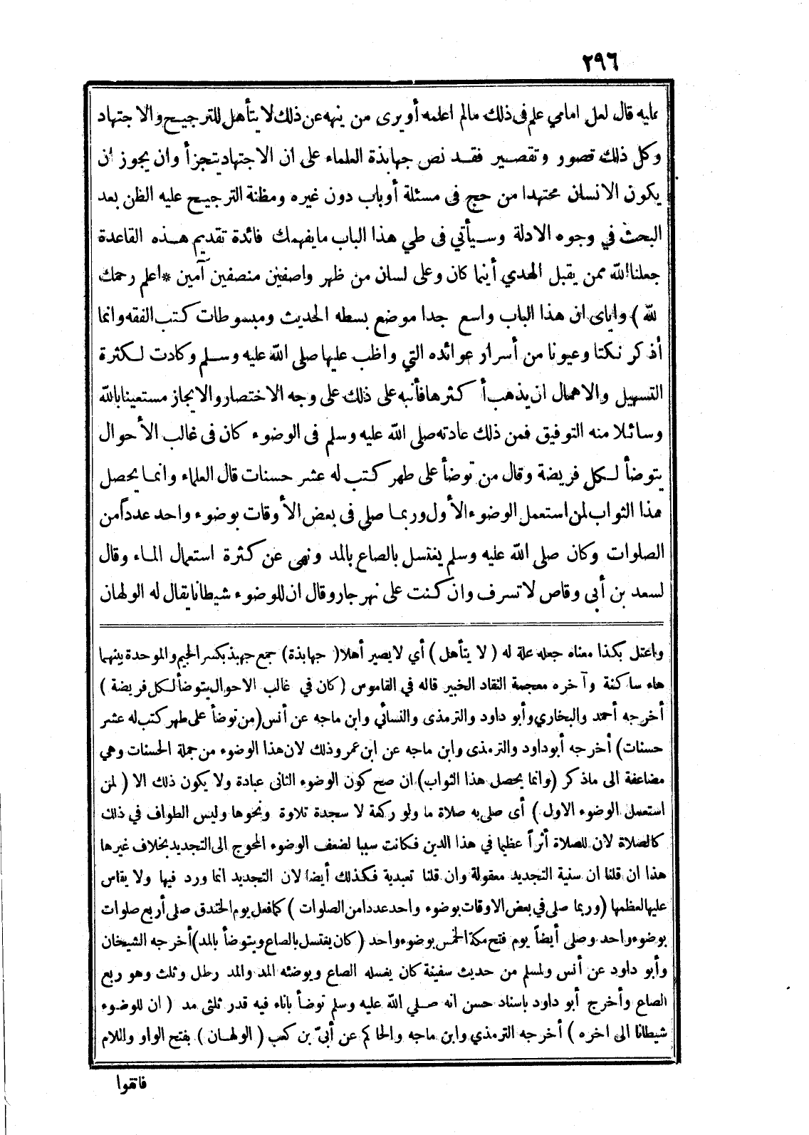 فمن ذلك عادته صلى الله عليه وسلم في الوضوء كان في غالب الأحوال يتوضأ لكل فريضة وقال من توضأ على طهر كتب له عشر حسنات قال العلماء وانما يحصل هذا الثواب لمن استعمل الوضوء الأول وربما صلى في بعض الأوقات بوضوء واحد عددا من الصلوات وكان صلى الله عليه وسلم يغتسل بالصاع بالمد ونهى عن كثرة استعمال الماء وقال لسعد بن أبى وقاص لا تسرف وان كنت على نهر جار وقال ان للوضوء شيطانا يقال له الولهان واعتل بكذا معناه جعله علة له (لا يتأهل) أي لا يصير أهلا (جهابذة) جمع جهبذ بكسر الجيم والموحدة بينهما هاء ساكنة وآخره معجمة النقاد الخبير قاله في القاموس (كان في غالب الاحوال يتوضأ لكل فريضة) أخرجه أحمد والبخاري وأبو داود والترمذى والنسائي وابن ماجه عن أنس (من توضأ على طهر كتب له عشر حسنات) أخرجه أبو داود والترمذى وابن ماجه عن ابن عمرو ذلك لان هذا الوضوء من جملة الحسنات وهي مضاعفة الى ما ذكر (وانما يحصل هذا الثواب) ان صح كون الوضوء الثانى عبادة ولا يكون ذلك الا (لمن استعمل الوضوء الاول) أى صلى به صلاة ما ولو ركعة لا سجدة تلاوة ونحوها وليس الطواف في ذلك كالصلاة لان للصلاة أثرا عظيما في هذا الدين فكانت سببا لضعف الوضوء المحوج الى التجديد بخلاف غيرها هذا ان قلنا ان سنية التجديد معقولة وان قلنا تعبدية فكذلك أيضا لان التجديد انما ورد فيها ولا يقاس عليها العظمها (وربما صلى في بعض الاوقات بوضوء واحد عددا من الصلوات) كما فعل يوم الخندق صلى أربع صلوات بوضوء واحد وصلى أيضا يوم فتح مكة الخمس بوضوء واحد (كان يغتسل بالصاع ويتوضأ بالمد) أخرجه الشيخان وأبو داود عن أنس ولمسلم من حديث سفينة كان يغسله الصاع ويوضئه المد والمد رطل وثلث وهو ربع الصاع وأخرج أبو داود باسناد حسن انه صلى الله عليه وسلم توضأ باناء فيه قدر ثلثى مد (ان للوضوء شيطانا الى اخره) أخرجه الترمذي وابن ماجه والحاكم عن أبىّ بن كعب (الولهان) بفتح الواو واللام