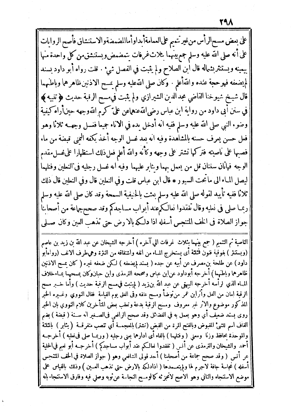 على بعض مسح الرأس من غير تتميم على العمامة أبدا وأما المضمضة والاستنشاق فأصح الروايات على أنه صلى الله عليه وسلم جمع بينهما بثلاث غرفات يتمضمض ويستنشق من كل واحدة منها بيمينه ويستنثر بشماله قال ابن الصلاح ولم يثبت في الفصل شيء. قلت رواه أبو داود بسند لم يضعفه فهو حجة عنده والله أعلم. وكان صلى الله عليه وسلم يمسح الاذنين ظاهرهما وباطنهما قال شيخ شيوخنا القاضي مجد الدين الشيرازي ولم يثبت في مسح الرقبة حديث (تنبيه) في سنن أبى داود من رواية ابن عباس رضى الله عنهما عن علىّ كرم الله وجهه حين أراه كيفية وضوء النبي صلى الله عليه وسلم ففيه انه أدخل يده في الاناء جميعا فغسل وجهه ثلاثا وهو فعل حسن يعرف حسنه بالمشاهدة وفيه انه بعد غسل الوجه أخذ بكفه اليمنى قبضة من ماء فصبها على ناصيته فتركها تشتر على وجهه وكأنه والله أعلم فعل ذلك استظهارا على غسل مقدم الوجه فهاتان سنتان قل من يعمل بهما ويثابر عليهما وفيه انه غسل رجليه في النعلين وفتلهما ليصل الماء الى ما تحت السيور* قال ابن عباس قلت وفي النعلين قال وفي النعلين قال ذلك ثلاثا ففيه تأييد لقوله صلى الله عليه وسلم بعثت بالحنيفية السمحة وقد كان صلى الله عليه وسلم ربما صلى في نعليه وقال تفقدوا نعالكم عند أبواب مساجدكم وقد صحح جماعة من أصحابنا جواز الصلاة في الخف المتنجس أسفله اذا دلكه بالارض حتى تذهب العين وكان صلى الناصية ثم التتميم (جمع بينهما بثلاث غرفات الي آخره) أخرجه الشيخان عن عبد الله بن زيد بن عاصم (ويستنثر) بفوقية فنون فمثلثة أى يستخرج الماء من انفه واشتقاقه من النثرة وهي طرف الانف (رواه أبو داود) عن طلحة بن مصرف عن أبيه عن جده (بسند لم يضعفه) لكن ضعفه غيره (كان يمسح الاذنين ظاهرهما وباطنهما) أخرجه أبو داود عن ابن عباس وصححه الترمذى وابن حبان وكان يمسحهما بماء خلاف الماء الذي لرأسه أخرجه البيهقى عن عبد الله بن زيد (لم يثبت في مسح الرقبة حديث) وأما خبر مسح الرقبة امان من الغل وأثر ابن عمر من توضأ ومسح عنقه وقى الغلى يوم القيامة فقال النووي وغيره الخبر المذكور موضوع والاثر غير معروف ومسح الرقبة بدعة وتعقب بعض المتأخرين كلام النووي بان الخبر روى بسند ضعيف أي وهو يعمل به في الفضائل وقد صحح الرافعي في الصغير انه سنة (قبضة) بضم القاف اسم للشيء المقبوض وبالفتح المرة من القبض (تشتر) بالمعجمة أي تنصب متفرقة (يثابر) بالمثلثة والموحدة يحافظ وزنا ومعني (وفتلهما) بالفاء أى ادارهما يعنى رجليه (وربما صلى في نعليه) أخرجه أحمد والشيخان والترمذى عن أنس (تفقدوا نعالكم عند أبواب مساجدكم) أخرجه أبو نعيم في الحلية عر أنس (وقد صحح جماعة من أصحابنا) أحد قولى الشافعي وهو (جواز الصلاة في الخف المتنجس أسفله) نجاسة جافة لا جرم لها ولم يتعمدها (اذا دلكه بالارض حتى تذهب العين) وذلك بالقياس على موضع الاستنجاء والثاني وهو الاصح لا تجزئه كما لو مسح النجاسة عن ثوبه وصلى فيه وفارق الاستنجاء بانه