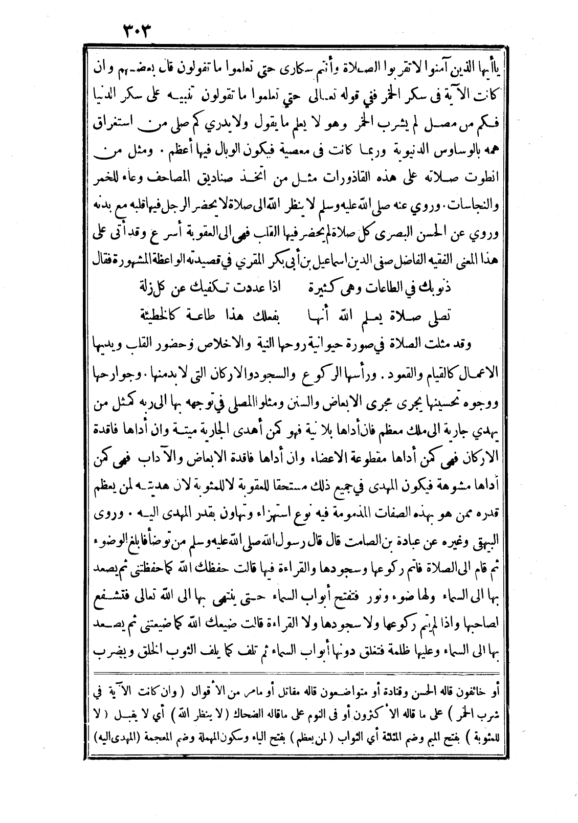 يا أَيُّهَا الَّذِينَ آمَنُوا لا تَقْرَبُوا الصَّلاةَ وَأَنْتُمْ سُكارى حَتَّى تَعْلَمُوا ما تَقُولُونَ قال بعضهم وان كانت الآية في سكر الخمر ففي قوله تعالى حَتَّى تَعْلَمُوا ما تَقُولُونَ تنبيه على سكر الدنيا فكم من مصل لم يشرب الخمر وهو لا يعلم ما يقول ولا يدري كم صلى من استغراق همه بالوساوس الدنيوية وربما كانت في معصية فيكون الوبال فيها أعظم. ومثل من انطوت صلاته على هذه القاذورات مثل من اتخذ صناديق المصاحف وعاء للخمر والنجاسات. وروي عنه صلى الله عليه وسلم لا ينظر الله الى صلاة لا يحضر الرجل فيها قلبه مع بدنه وروي عن الحسن البصرى كل صلاة لم يحضر فيها القلب فهى الى العقوبة أسرع وقد أتى على هذا المعنى الفقيه الفاضل صفي الدين اسماعيل بن أبى بكر المقري في قصيدته الواعظة المشهورة فقال