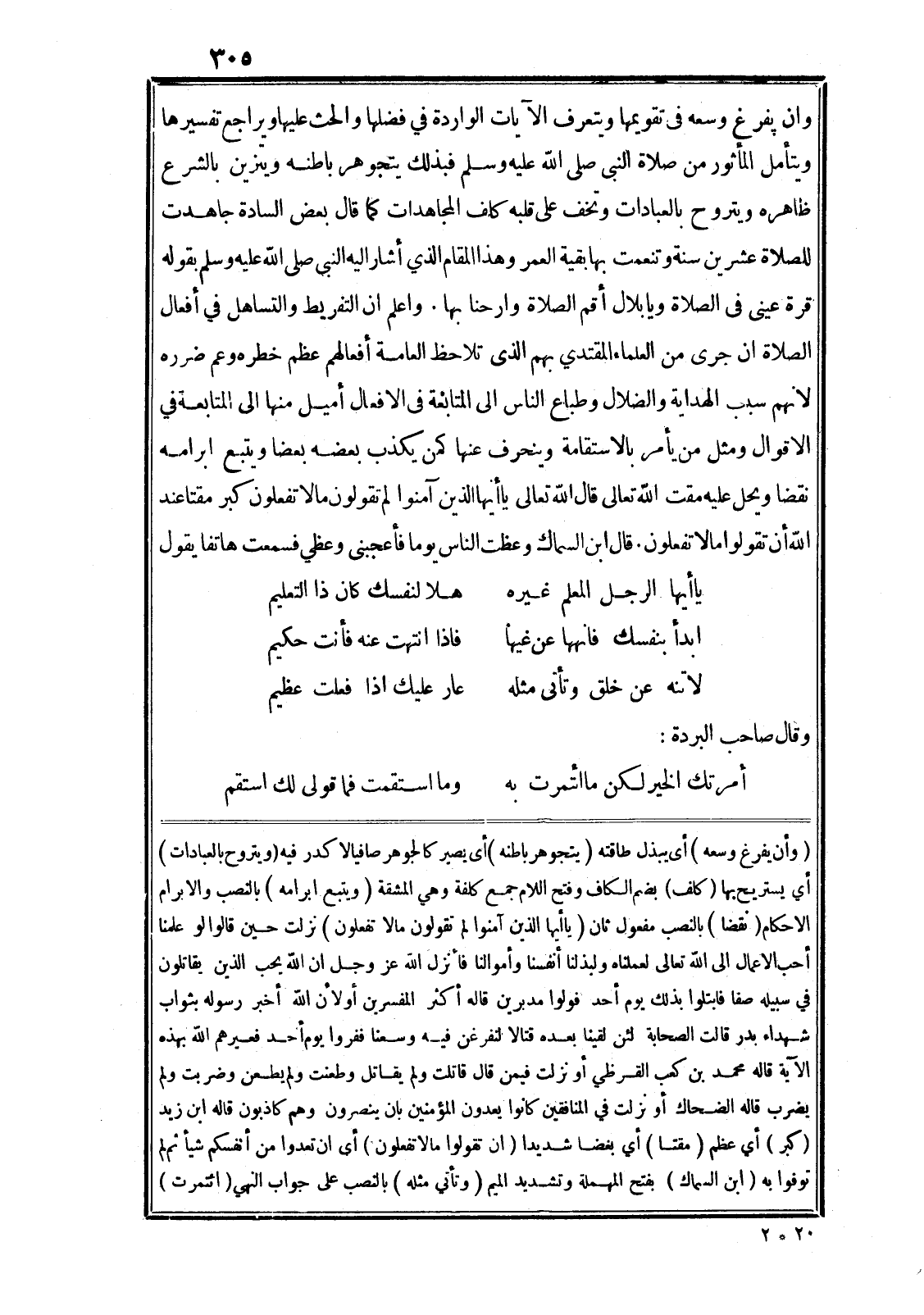 وان يفرغ وسعه في تقويمها ويتعرف الآيات الواردة في فضلها والحث عليها ويراجع تفسيرها ويتأمل المأثور من صلاة النبى صلى الله عليه وسلم فبذلك يتجوهر باطنه ويتزين بالشرع ظاهره ويتروح بالعبادات وتخف على قلبه كلف المجاهدات كما قال بعض السادة جاهدت للصلاة عشرين سنة وتنعمت بها بقية العمر وهذا المقام الذي أشار اليه النبى صلى الله عليه وسلم بقوله قرة عينى في الصلاة ويا بلال أقم الصلاة وارحنا بها. واعلم ان التفريط والتساهل في أفعال الصلاة ان جرى من العلماء المقتدي بهم الذى تلاحظ العامة أفعالهم عظم خطره وعم ضرره لانهم سبب الهداية والضلال وطباع الناس الى المتابعة في الافعال أميل منها الى المتابعة في الاقوال ومثل من يأمر بالاستقامة وينحرف عنها كمن يكذب بعضه بعضا ويتبع ابرامه نقضا ويحل عليه مقت الله تعالى قال الله تعالى يا أَيُّهَا الَّذِينَ آمَنُوا لِمَ تَقُولُونَ ما لا تَفْعَلُونَ كَبُرَ مَقْتاً عِنْدَ اللَّهِ أَنْ تَقُولُوا ما لا تَفْعَلُونَ. قال ابن السماك وعظت الناس يوما فأعجبنى وعظي فسمعت هاتفا يقول