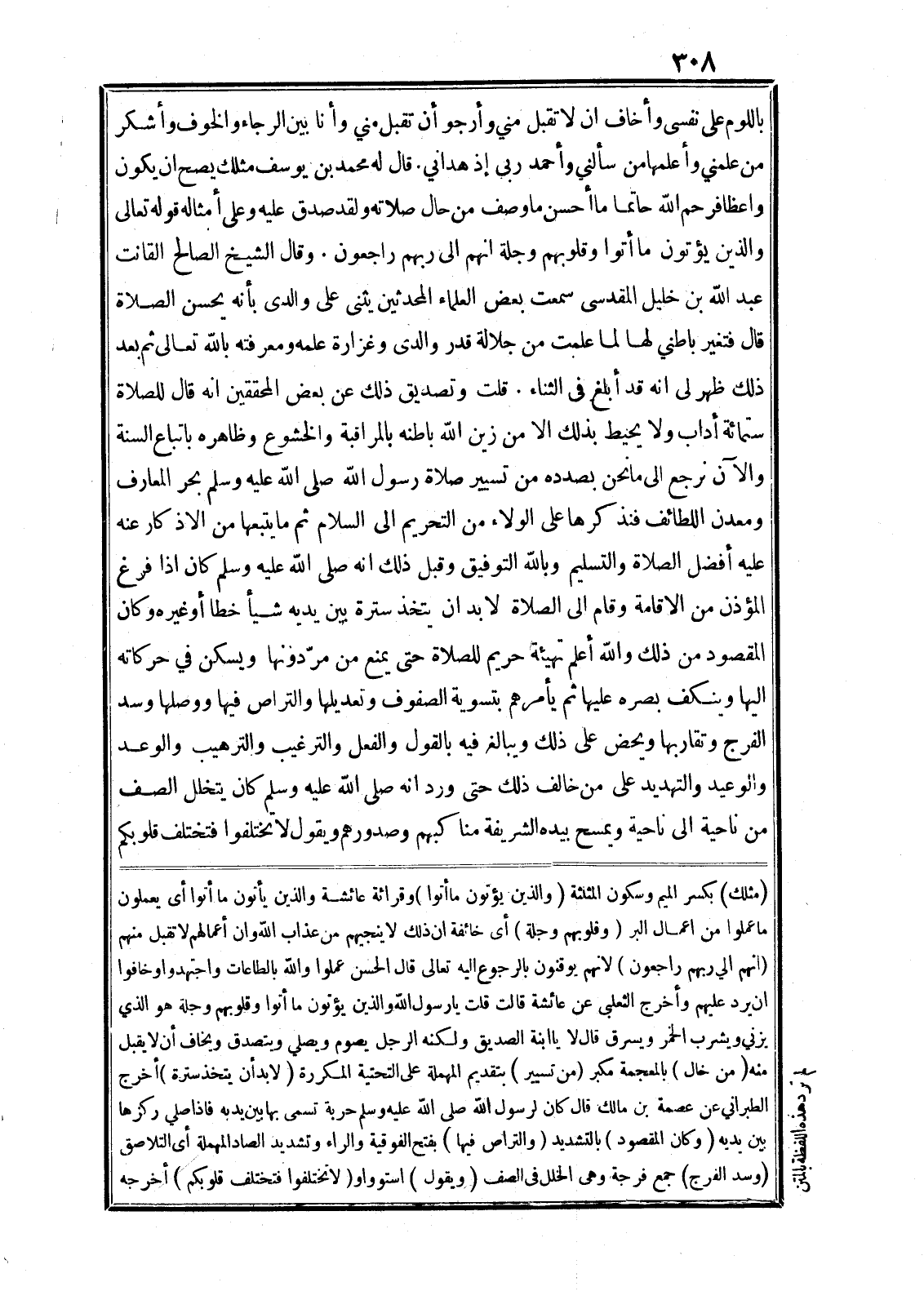 باللوم على نفسى وأخاف ان لا تقبل مني وأرجو أن تقبل مني وأنا بين الرجاء والخوف وأشكر من علمني وأعلمها من سألني وأحمد ربى إذ هداني. قال له محمد بن يوسف مثلك يصح ان يكون واعظا فرحم الله حاتما ما أحسن ما وصف من حال صلاته ولقد صدق عليه وعلى أمثاله قوله تعالى وَالَّذِينَ يُؤْتُونَ ما آتَوْا وَقُلُوبُهُمْ وَجِلَةٌ أَنَّهُمْ إِلى رَبِّهِمْ راجِعُونَ. وقال الشيخ الصالح القانت عبد الله بن خليل المقدسى سمعت بعض العلماء المحدثين يثنى على والدى بأنه يحسن الصلاة قال فتغير باطني لها لما علمت من جلالة قدر والدى وغزارة علمه ومعرفته بالله تعالى ثم بعد ذلك ظهر لى انه قد أبلغ في الثناء. قلت وتصديق ذلك عن بعض المحققين انه قال للصلاة ستمائة أداب ولا يحيط بذلك الا من زين الله باطنه بالمراقبة والخشوع وظاهره باتباع السنة والآن نرجع الى ما نحن بصدده من تسيير صلاة رسول الله صلى الله عليه وسلم بحر المعارف ومعدن اللطائف فنذكرها على الولاء من التحريم الى السلام ثم ما يتبعها من الاذكار عنه عليه أفضل الصلاة والتسليم وبالله التوفيق وقبل ذلك انه صلى الله عليه وسلم كان اذا فرغ المؤذن من الاقامة وقام الى الصلاة لا بد ان يتخذ سترة بين يديه شيأ خطا أو غيره وكان المقصود من ذلك والله أعلم تهيئة حريم للصلاة حتى يمنع من مرّ دونها ويسكن في حركاته اليها وينكف بصره عليها ثم يأمرهم بتسوية الصفوف وتعديلها والتراص فيها ووصلها وسد الفرج وتقاربها ويحض على ذلك ويبالغ فيه بالقول والفعل والترغيب والترهيب والوعد والوعيد والتهديد على من خالف ذلك حتى ورد انه صلى الله عليه وسلم كان يتخلل الصف من ناحية الى ناحية ويمسح بيده الشريفة مناكبهم وصدورهم ويقول لا تختلفوا فتختلف قلوبكم (مثلك) بكسر الميم وسكون المثلثة (والذين يؤتون ما أتوا) وقرائة عائشة والذين يأتون ما أتوا أى يعملون ما عملوا من اعمال البر (وقلوبهم وجلة) أى خائفة ان ذلك لا ينجيهم من عذاب الله وان أعمالهم لا تقبل منهم (انهم الي ربهم راجعون) لانهم يوقنون بالرجوع اليه تعالى قال الحسن عملوا والله بالطاعات واجتهدوا وخافوا ان يرد عليهم وأخرج الثعلبى عن عائشة قالت قلت يا رسول الله والذين يؤتون ما أتوا وقلوبهم وجلة هو الذي يزني ويشرب الخمر ويسرق قال لا يا ابنة الصديق ولكنه الرجل يصوم ويصلي ويتصدق ويخاف أن لا يقبل منه (من خال) بالمعجمة مكبر (من تسيير) بتقديم المهملة على التحتية المكررة (لا بد أن يتخذ سترة) أخرج الطبراني عن عصمة بن مالك قال كان لرسول الله صلى الله عليه وسلم حربة تسمى بها بين يديه فاذا صلى ركزها بين يديه (وكان المقصود) بالتشديد (والتراص فيها) بفتح الفوقية والراء وتشديد الصاد المهملة أى التلاصق (وسد الفرج) جمع فرجة وهى الخلل في الصف (ويقول) استوواو (لا تختلفوا فتختلف قلوبكم) أخرجه