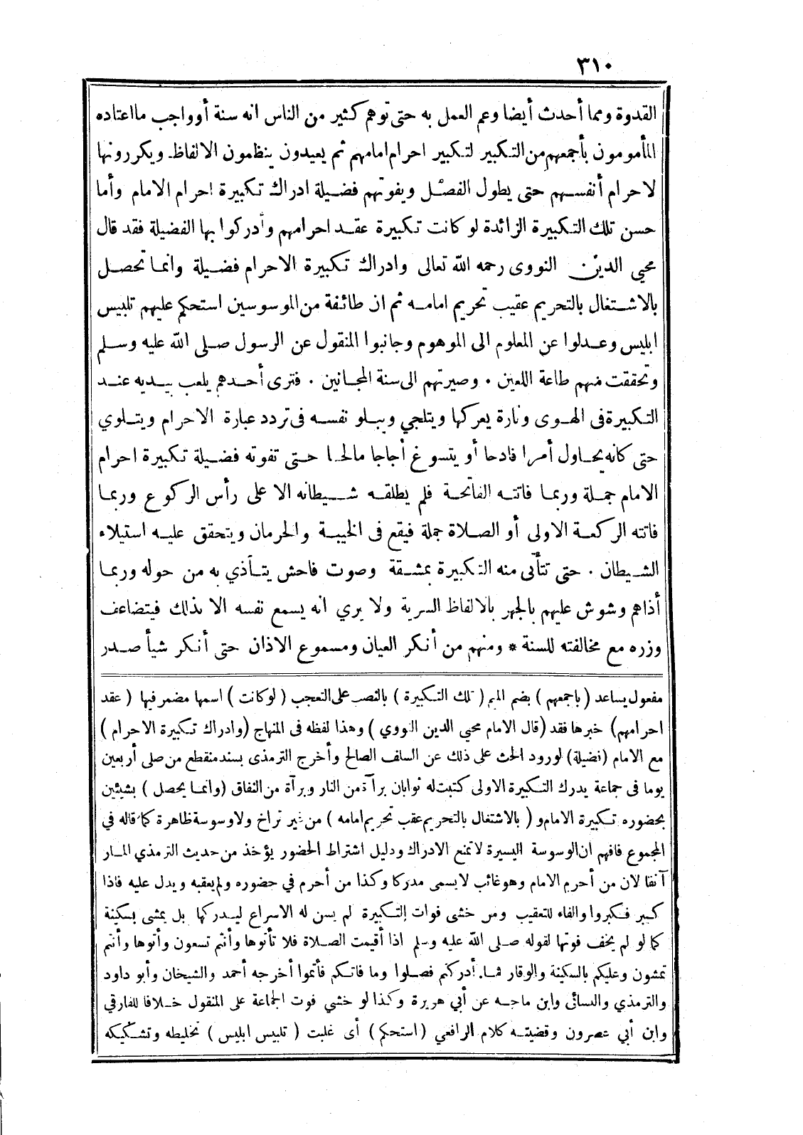القدوة ومما أحدث أيضا وعم العمل به حتى توهم كثير من الناس انه سنة أو واجب ما اعتاده المأمومون بأجمعهم من التكبير لتكبير احرام امامهم ثم يعيدون ينظمون الالفاظ ويكررونها لا حرام أنفسهم حتى يطول الفصل ويفوتهم فضيلة ادراك تكبيرة احرام الامام وأما حسن تلك التكبيرة الزائدة لو كانت تكبيرة عقد احرامهم وادركوا بها الفضيلة فقد قال محيى الدين النووى رحمه الله تعالى وادراك تكبيرة الاحرام فضيلة وانما تحصل بالاشتغال بالتحريم عقيب تحريم امامه