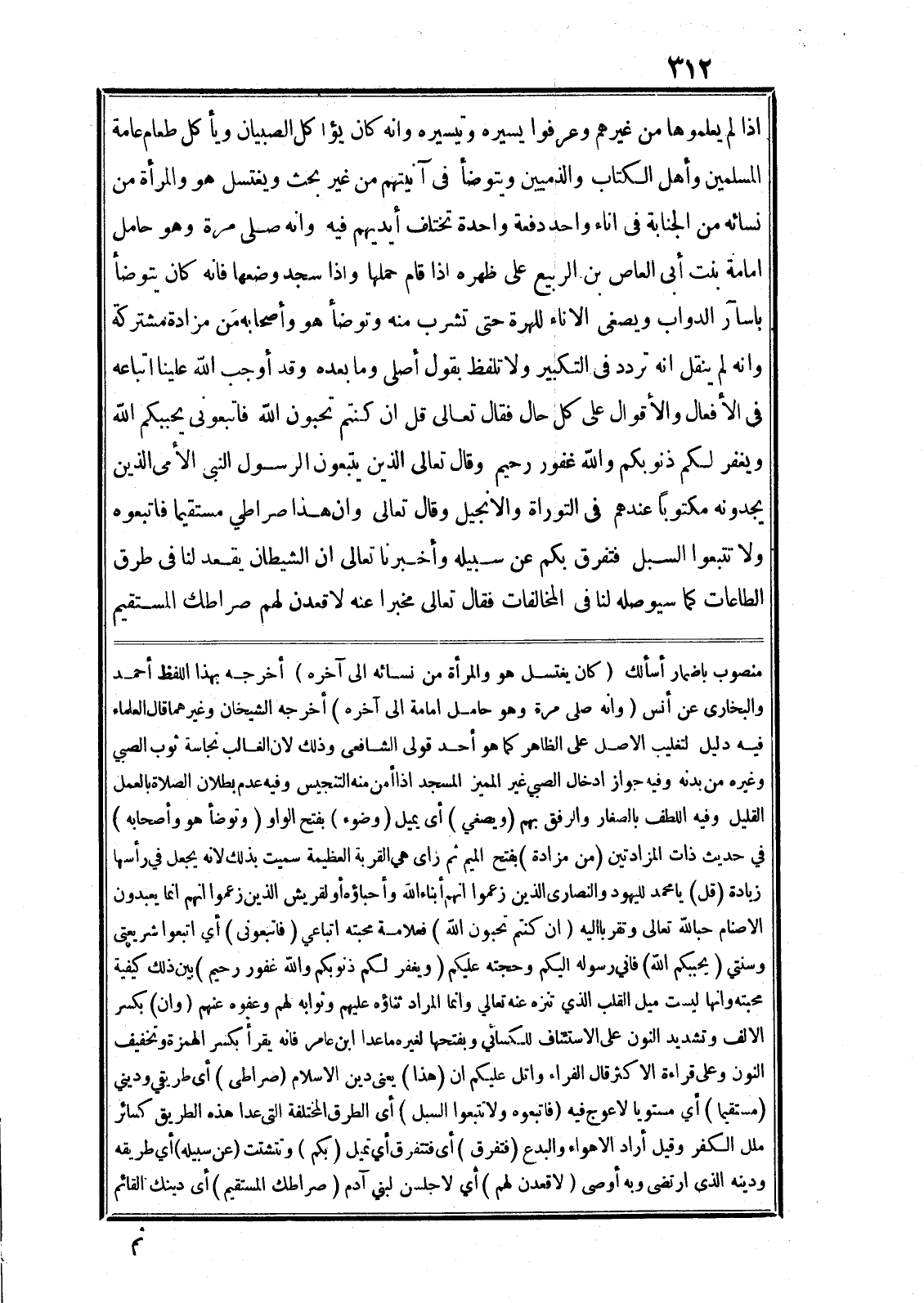 اذا لم يعلموها من غيرهم وعرفوا يسيره وتيسيره وانه كان يؤاكل الصبيان ويأكل طعام عامة المسلمين وأهل الكتاب والذميين ويتوضأ في آنيتهم من غير بحث ويغتسل هو والمرأة من نسائه من الجنابة في اناء واحد دفعة واحدة تختلف أيديهم فيه وانه صلى مرة وهو حامل امامة بنت أبى العاص بن الربيع على ظهره اذا قام حملها واذا سجد وضعها فانه كان يتوضأ باسار الدواب ويصغى الاناء للهرة حتى تشرب منه وتوضأ هو وأصحابه من مزادة مشتركة وانه لم ينقل انه تردد في التكبير ولا تلفظ بقول أصلى وما بعده وقد أوجب الله علينا اتباعه في الأفعال والأقوال على كل حال فقال تعالى قُلْ إِنْ كُنْتُمْ تُحِبُّونَ اللَّهَ فَاتَّبِعُونِي يُحْبِبْكُمُ اللَّهُ وَيَغْفِرْ لَكُمْ ذُنُوبَكُمْ وَاللَّهُ غَفُورٌ رَحِيمٌ وقال تعالى الَّذِينَ يَتَّبِعُونَ الرَّسُولَ النَّبِيَّ الْأُمِّيَّ الَّذِي يَجِدُونَهُ مَكْتُوباً عِنْدَهُمْ فِي التَّوْراةِ وَالْإِنْجِيلِ وقال تعالى وَأَنَّ هذا صِراطِي مُسْتَقِيماً فَاتَّبِعُوهُ وَلا تَتَّبِعُوا السُّبُلَ فَتَفَرَّقَ بِكُمْ عَنْ سَبِيلِهِ وأخبرنا تعالى ان الشيطان يقعد لنا في طرق الطاعات كما سيوصله لنا في المخالفات فقال تعالى مخبرا عنه لاقعدن لهم صراطك المستقيم منصوب باضمار أسألك (كان يغتسل هو والمرأة من نسائه الى آخره) أخرجه بهذا اللفظ أحمد والبخارى عن أنس (وانه صلى مرة وهو حامل امامة الى آخره) أخرجه الشيخان وغير هما قال العلماء فيه دليل لتغليب الاصل على الظاهر كما هو أحد قولى الشافعى وذلك لان الغالب نجاسة ثوب الصبي وغيره من بدنه وفيه جواز ادخال الصبي غير المميز المسجد اذا أمن منه التنجيس وفيه عدم بطلان الصلاة بالعمل القليل وفيه اللطف بالصغار والرفق بهم (ويصغي) أى يميل (وضوء) بفتح الواو (وتوضأ هو وأصحابه) في حديث ذات المزادتين (من مزادة) بفتح الميم ثم زاى هي القربة العظيمة سميت بذلك لانه يجعل في رأسها زيادة (قُلْ) يا محمد لليهود والنصارى الذين زعموا انهم أبناء الله وأحباؤه أو لقريش الذين زعموا انهم انما يعبدون الاصنام حبا لله تعالى وتقربا اليه (إِنْ كُنْتُمْ تُحِبُّونَ اللَّهَ) فعلامة محبته اتباعي (فَاتَّبِعُونِي) أي اتبعوا شريعتى وسنتي (يُحْبِبْكُمُ اللَّهُ) فاني رسوله اليكم وحجته عليكم (وَيَغْفِرْ لَكُمْ ذُنُوبَكُمْ وَاللَّهُ غَفُورٌ رَحِيمٌ) بين ذلك كيفية محبته وانها ليست ميل القلب الذي تنزه عنه تعالي وانما المراد ثناؤه عليهم وثوابه لهم وعفوه عنهم (وَأَنَّ) بكسر الالف وتشديد النون على الاستئناف للكسائي وبفتحها لغيره ما عدا ابن عامر فانه يقرأ بكسر الهمزة وتخفيف النون وعلى قراءة الاكثر قال الفراء واتل عليكم ان (هذا) يعنى دين الاسلام (صِراطِي) أى طريقي وديني (مُسْتَقِيماً) أي مستويا لا عوج فيه (فَاتَّبِعُوهُ وَلا تَتَّبِعُوا السُّبُلَ) أى الطرق المختلفة التى عدا هذه الطريق كسائر ملل الكفر وقيل أراد الاهواء والبدع (فَتَفَرَّقَ) أى فتتفرق أي تميل (بِكُمْ) وتتشتت (عَنْ سَبِيلِهِ) أي طريقه ودينه الذى ارتضى وبه أوصى (لَأَقْعُدَنَّ لَهُمْ) أي لا جلسن لبني آدم (صِراطَكَ الْمُسْتَقِيمَ) أى دينك القائم