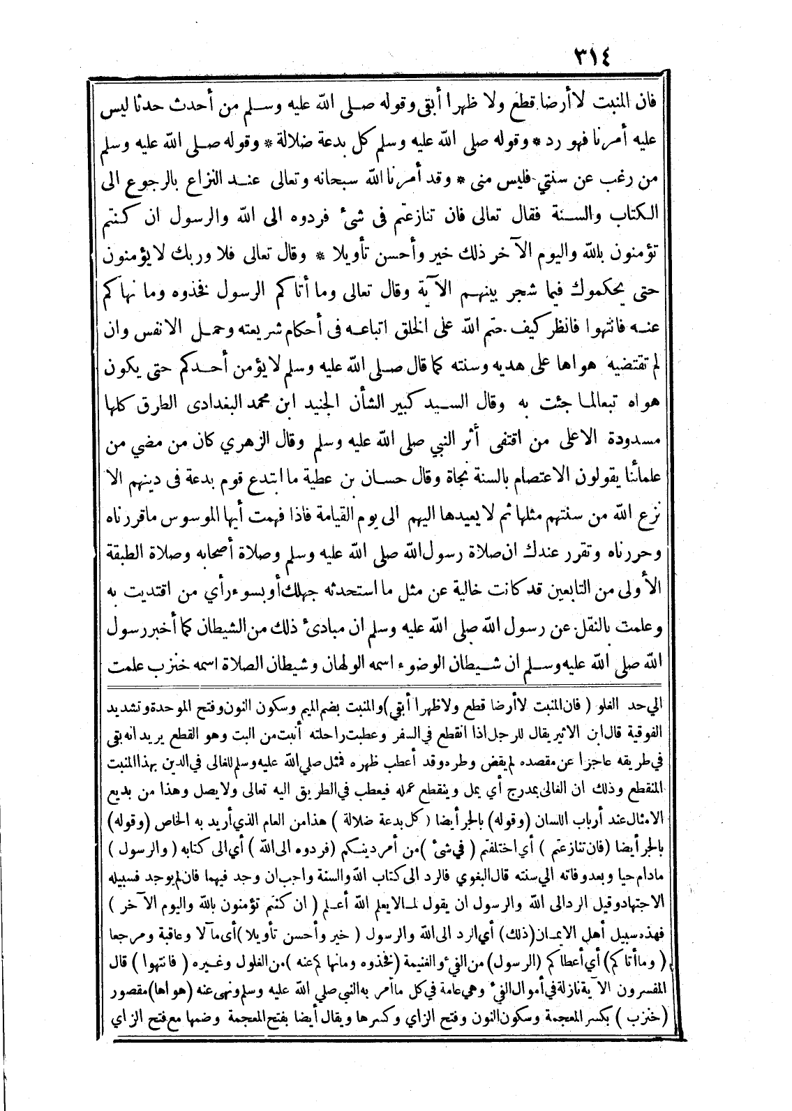 فان المنبت لا أرضا قطع ولا ظهرا أبقى وقوله صلى الله عليه وسلم من أحدث حدثا ليس عليه أمرنا فهو رد* وقوله صلى الله عليه وسلم كل بدعة ضلالة* وقوله صلى الله عليه وسلم من رغب عن سنتي فليس منى* وقد أمرنا الله سبحانه وتعالى عند النزاع بالرجوع الى الكتاب والسنة فقال تعالى فَإِنْ تَنازَعْتُمْ فِي شَيْءٍ فَرُدُّوهُ إِلَى اللَّهِ وَالرَّسُولِ إِنْ كُنْتُمْ تُؤْمِنُونَ بِاللَّهِ وَالْيَوْمِ الْآخِرِ ذلِكَ خَيْرٌ وَأَحْسَنُ تَأْوِيلًا* وقال تعالى فَلا وَرَبِّكَ لا يُؤْمِنُونَ حَتَّى يُحَكِّمُوكَ فِيما شَجَرَ بَيْنَهُمْ الآية وقال تعالى وَما آتاكُمُ الرَّسُولُ فَخُذُوهُ وَما نَهاكُمْ عَنْهُ فَانْتَهُوا فانظر كيف حتم الله على الخلق اتباعه في أحكام شريعته وحمل الانفس وان لم تقتضيه هواها على هديه وسنته كما قال صلى الله عليه وسلم لا يؤمن أحدكم حتى يكون هواه تبعا لما جئت به وقال السيد كبير الشأن الجنيد ابن محمد البغدادى الطرق كلها مسدودة الاعلى من اقتفى أثر النبي صلى الله عليه وسلم وقال الزهري كان من مضي من علمائنا يقولون الاعتصام بالسنة نجاة وقال حسان بن عطية ما ابتدع قوم بدعة في دينهم الا نزع الله من سنتهم مثلها ثم لا يعيدها اليهم الى يوم القيامة فاذا فهمت أيها الموسوس ما قررناه وحررناه وتقرر عندك ان صلاة رسول الله صلى الله عليه وسلم وصلاة أصحابه وصلاة الطبقة الأولى من التابعين قد كانت خالية عن مثل ما استحدثه جهلك أو بسوء رأي من اقتديت به وعلمت بالنقل عن رسول الله صلى الله عليه وسلم ان مبادئ ذلك من الشيطان كما أخبر رسول الله صلى الله عليه وسلم ان شيطان الوضوء اسمه الولهان وشيطان الصلاة اسمه خنزب علمت الي حد الغلو (فان المنبت لا أرضا قطع ولا ظهرا أبقي) والمنبت بضم الميم وسكون النون وفتح الموحدة وتشديد الفوقية قال ابن الاثير يقال للرجل اذا انقطع في السفر وعطبت راحلته أنبت من البت وهو القطع يريد انه بقى في طريقه عاجزا عن مقصده لم يقض وطره وقد أعطب ظهره فمثل صلى الله عليه وسلم للغالى في الدين بهذا المنبت المنقطع وذلك ان الغالى بمدرج أي يمل وينقطع عمله فيعطب في الطريق اليه تعالى ولا يصل وهذا من بديع الامثال عند أرباب اللسان (وقوله) بالجر أيضا (كل بدعة ضلالة) هذا من العام الذي أريد به الخاص (وقوله) بالجر أيضا (فَإِنْ تَنازَعْتُمْ) أي اختلفتم (فِي شَيْءٍ) من أمر دينكم (فَرُدُّوهُ إِلَى اللَّهِ) أي الى كتابه (وَالرَّسُولِ) مادام حيا وبعد وفاته الي سنته قال البغوي فالرد الى كتاب الله والسنة واجب ان وجد فيهما فان لم يوجد فسبيله الاجتهاد وقيل الرد الى الله والرسول ان يقول لما لا يعلم الله أعلم (إِنْ كُنْتُمْ تُؤْمِنُونَ بِاللَّهِ وَالْيَوْمِ الْآخِرِ) فهذه سبيل أهل الايمان (ذلِكَ) أي الرد الى الله والرسول (خَيْرٌ وَأَحْسَنُ تَأْوِيلًا) أى مآلا وعاقبة ومرجعا (وَما آتاكُمُ) أي أعطاكم (الرَّسُولُ) من الفيء والغنيمة (فَخُذُوهُ وَما نَهاكُمْ عَنْهُ) من الغلول وغيره (فَانْتَهُوا) قال المفسرون الآية نازلة في أموال الفيء وهي عامة في كل ما أمر به النبي صلى الله عليه وسلم ونهى عنه (هواها) مقصور (خنزب) بكسر المعجمة وسكون النون وفتح الزاي وكسرها ويقال أيضا بفتح المعجمة وضمها مع فتح الزاي