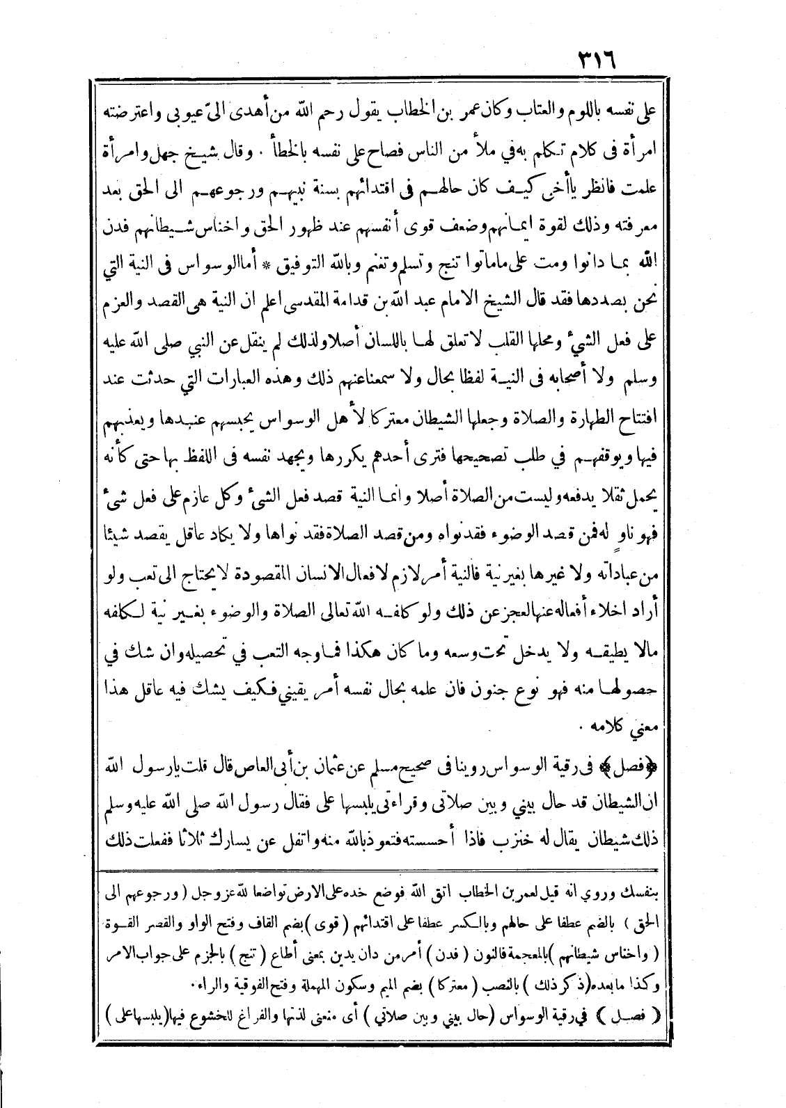 على نفسه باللوم والعتاب وكان عمر بن الخطاب يقول رحم الله من أهدى الىّ عيوبى واعترضته امرأة في كلام تكلم به في ملأ من الناس فصاح على نفسه بالخطأ. وقال شيخ جهل وامرأة علمت فانظر يا أخى كيف كان حالهم في اقتدائهم بسنة نبيهم ورجوعهم الى الحق بعد معرفته وذلك لقوة ايمانهم وضعف قوى أنفسهم عند ظهور الحق واخناس شيطانهم فدن الله بما دانوا ومت على ما ماتوا تنج وتسلم وتغنم وبالله التوفيق* أما الوسواس في النية التي نحن بصددها فقد قال الشيخ الامام عبد الله بن قدامة المقدسى اعلم ان النية هى القصد والعزم على فعل الشيء ومحلها القلب لا تعلق لها باللسان أصلا ولذلك لم ينقل عن النبي صلى الله عليه وسلم ولا أصحابه في النية لفظا بحال ولا سمعنا عنهم ذلك وهذه العبارات التي حدثت عند افتتاح الطهارة والصلاة وجعلها الشيطان معتركا لأهل الوسواس يحبسهم عندها ويعذبهم فيها ويوقفهم في طلب تصحيحها فترى أحدهم يكررها ويجهد نفسه في اللفظ بها حتى كأنه يحمل ثقلا يدفعه وليست من الصلاة أصلا وانما النية قصد فعل الشيء وكل عازم على فعل شيء فهو ناوله فمن قصد الوضوء فقد نواه ومن قصد الصلاة فقد نواها ولا يكاد عاقل يقصد شيئا من عباداته ولا غيرها بغير نية فالنية أمر لازم لافعال الانسان المقصودة لا يحتاج الى تعب ولو أراد اخلاء أفعاله عنها لعجز عن ذلك ولو كلفه الله تعالى الصلاة والوضوء بغير نية لكلفه ما لا يطيقه ولا يدخل تحت وسعه وما كان هكذا فما وجه التعب في تحصيله وان شك في حصولها منه فهو نوع جنون فان علمه بحال نفسه أمر يقيني فكيف يشك فيه عاقل هذا معني كلامه.