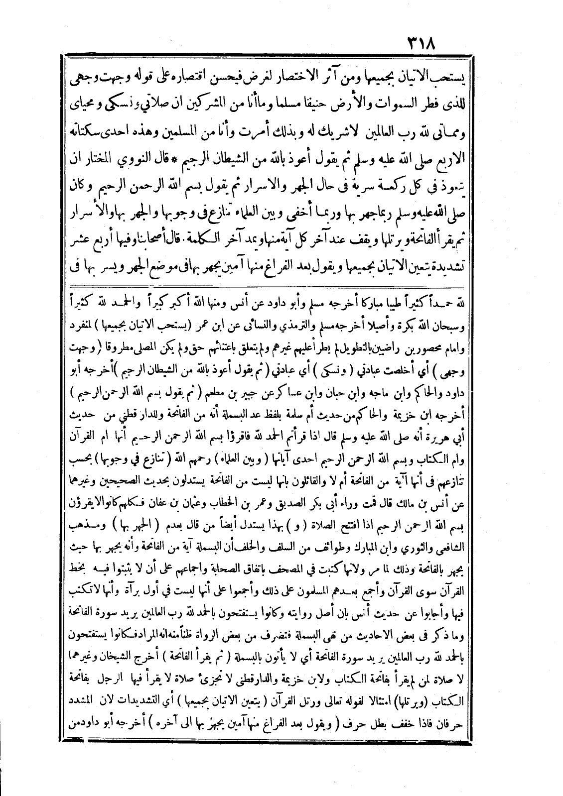 يستحب الاتيان بجميعها ومن آثر الاختصار لغرض فيحسن اقتصاره على قوله وَجَّهْتُ وَجْهِيَ لِلَّذِي فَطَرَ السَّماواتِ وَالْأَرْضَ حَنِيفاً وَما أَنَا مِنَ الْمُشْرِكِينَ إِنَّ صَلاتِي وَنُسُكِي وَمَحْيايَ وَمَماتِي لِلَّهِ رَبِّ الْعالَمِينَ لا شَرِيكَ لَهُ وَبِذلِكَ أُمِرْتُ وَأَنَا أَوَّلُ الْمُسْلِمِينَ وهذه احدى سكتاته الاربع صلى الله عليه وسلم ثم يقول أعوذ بالله من الشيطان الرجيم* قال النووي المختار ان يتعوذ في كل ركعة سرية في حال الجهر والاسرار ثم يقول بسم الله الرحمن الرحيم وكان صلى الله عليه وسلم ربما جهر بها وربما أخفي وبين العلماء تنازع في وجوبها والجهر بها والأسرار ثم يقرأ الفاتحة ويرتلها ويقف عند آخر كل آية منها ويمد آخر الكلمة. قال أصحابنا وفيها أربع عشر تشديدة يتعين الاتيان بجميعها ويقول بعد الفراغ منها آمين يجهر بها في موضع الجهر ويسر بها في لله حمدا كثيرا طيبا مباركا أخرجه مسلم وأبو داود عن أنس ومنها الله أكبر كبيرا والحمد لله كثيرا وسبحان الله بكرة وأصيلا أخرجه مسلم والترمذي والنسائى عن ابن عمر (يستحب الاتيان بجميعها) لمنفرد وامام محصورين راضيين بالتطويل لم يطرأ عليهم غيرهم ولم يتعلق باعتنائهم حق ولم يكن المصلى مطروقا (وجهت وجهى) أي أخلصت عبادتي (ونسكى) أي عبادتي (ثم يقول أعوذ بالله من الشيطان الرجيم) أخرجه أبو داود والحاكم وابن ماجه وابن حبان وابن عساكر عن جبير بن مطعم (ثم يقول بسم الله الرحمن الرحيم) أخرجه ابن خزيمة والحاكم من حديث أم سلمة بلفظ عد البسملة أنه من الفاتحة وللدار قطني من حديث أبي هريرة أنه صلى الله عليه وسلم قال اذا قرأتم الْحَمْدُ لِلَّهِ فاقرؤا بِسْمِ اللَّهِ الرَّحْمنِ الرَّحِيمِ أنها ام القرآن وام الكتاب وبِسْمِ اللَّهِ الرَّحْمنِ الرَّحِيمِ احدى آياتها (وبين العلماء) رحمهم الله (تنازع في وجوبها) بحسب تنازعهم في أنها آية من الفاتحة أم لا والقائلون بانها ليست من الفاتحة يستدلون بحديث الصحيحين وغيرهما عن أنس بن مالك قال قمت وراء أبى بكر الصديق وعمر بن الخطاب وعثمان بن عفان فكلهم كانوا لا يقرؤن بسم الله الرحمن الرحيم اذا افتتح الصلاة (و) بهذا يستدل أيضا من قال بعدم (الجهر بها) ومذهب الشافعى والثوري وابن المبارك وطوائف من السلف والخلف أن البسملة آية من الفاتحة وأنه يجهر بها حيث يجهر بالفاتحة وذلك لما مر ولانها كتبت في المصحف باتفاق الصحابة واجماعهم على أن لا يثبتوا فيه بخط القرآن سوى القرآن وأجمع بعدهم المسلمون على ذلك وأجمعوا على أنها ليست في أول برآة وأنها لا تكتب فيها وأجابوا عن حديث أنس بان أصل روايته وكانوا يستفتحون بالحمد لله رب العالمين يريد سورة الفاتحة وما ذكر في بعض الاحاديث من نفي البسملة فتضرف من بعض الرواة ظنا منه انه المراد فكانوا يستفتحون بالحمد لله رب العالمين يريد سورة الفاتحة أي لا يأتون بالبسملة (ثم يقرأ الفاتحة) أخرج الشيخان وغيرهما لا صلاة لمن لم يقرأ بفاتحة الكتاب ولابن خزيمة والدار قطنى لا تجزئ صلاة لا يقرأ فيها الرجل بفاتحة الكتاب (ويرتلها) امتثالا لقوله تعالى وَرَتِّلِ الْقُرْآنَ (يتعين الاتيان بجميعها) أي التشديدات لان المشدد حرفان فاذا خفف بطل حرف (ويقول بعد الفراغ منها آمين يجهر بها الى آخره) أخرجه أبو داود من