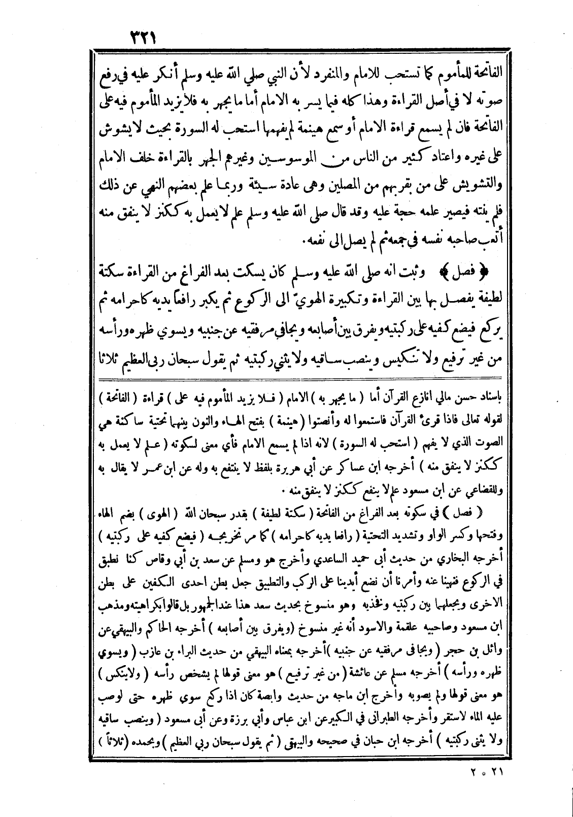 (فصل) وثبت انه صلى الله عليه وسلم كان يسكت بعد الفراغ من القراءة سكتة لطيفة يفصل بها بين القراءة وتكبيرة الهويّ الى الركوع ثم يكبر رافعا يديه كاحرامه ثم يركع فيضع كفيه على ركبتيه ويفرق بين أصابعه ويجافي مرفقيه عن جنبيه ويسوي ظهره ورأسه من غير ترفيع ولا تنكيس وينصب ساقيه ولا يثني ركبتيه ثم يقول سبحان ربى العظيم ثلاثا باسناد حسن مالي انازع القرآن أما (ما يجهر به) الامام (فلا يزيد المأموم فيه على) قراءة (الفاتحة) لقوله تعالى وَإِذا قُرِئَ الْقُرْآنُ فَاسْتَمِعُوا لَهُ وَأَنْصِتُوا (هينمة) بفتح الهاء والنون بينهما تحتية ساكنة هي الصوت الذي لا يفهم (استحب له السورة) لانه اذا لم يسمع الامام فأي معنى لسكوته (علم لا يعمل به ككنز لا ينفق منه) أخرجه ابن عساكر عن أبي هريرة بلفظ لا ينتفع به وله عن ابن عمر لا يقال به وللقضاعي عن ابن مسعود علم لا ينفع ككنز لا ينفق منه.