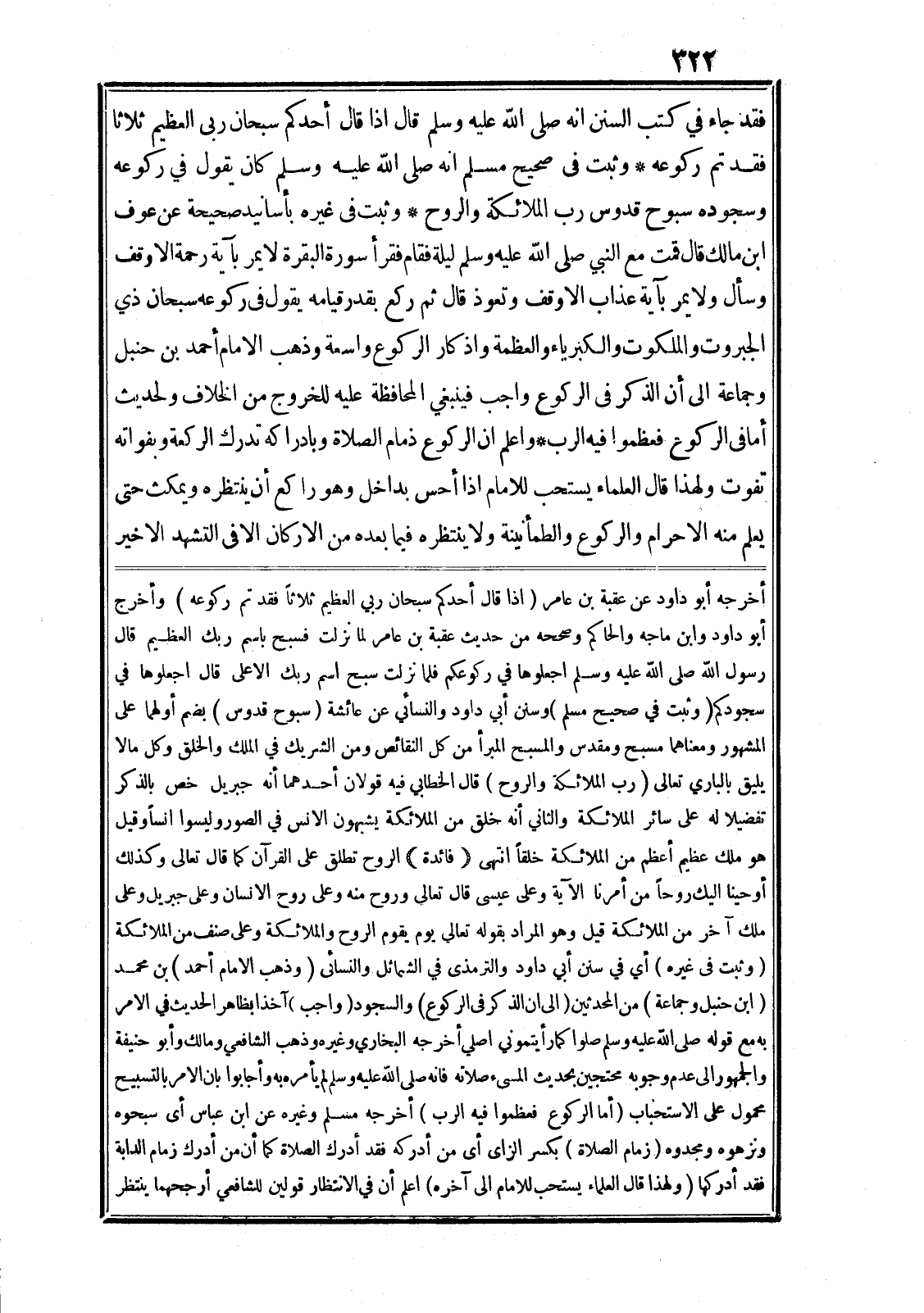 فقد جاء في كتب السنن انه صلى الله عليه وسلم قال اذا قال أحدكم سبحان ربى العظيم ثلاثا فقد تم ركوعه* وثبت في صحيح مسلم انه صلى الله عليه وسلم كان يقول في ركوعه وسجوده سبوح قدوس رب الملائكة والروح* وثبت في غيره بأسانيد صحيحة عن عوف ابن مالك قال قمت مع النبي صلى الله عليه وسلم ليلة فقام فقرأ سورة البقرة لا يمر بآية رحمة الا وقف وسأل ولا يمر بآية عذاب الا وقف وتعوذ قال ثم ركع بقدر قيامه يقول في ركوعه سبحان ذي الجبروت والملكوت والكبرياء والعظمة واذكار الركوع واسعة وذهب الامام أحمد بن حنبل وجماعة الى أن الذكر في الركوع واجب فينبغي المحافظة عليه للخروج من الخلاف ولحديث أما في الركوع فعظموا فيه الرب* واعلم ان الركوع ذمام الصلاة وبادراكه تدرك الركعة وبفواته تفوت ولهذا قال العلماء يستحب للامام اذا أحس بداخل وهو راكع أن ينتظره ويمكث حتى يعلم منه الاحرام والركوع والطمأنينة ولا ينتظره فيما بعده من الاركان الا في التشهد الاخير أخرجه أبو داود عن عقبة بن عامر (اذا قال أحدكم سبحان ربي العظيم ثلاثا فقد تم ركوعه) وأخرج أبو داود وابن ماجه والحاكم وصححه من حديث عقبة بن عامر لما نزلت فسبح باسم ربك العظيم قال رسول الله صلى الله عليه وسلم اجعلوها في ركوعكم فلما نزلت سبح اسم ربك الاعلى قال اجعلوها في سجودكم (وثبت في صحيح مسلم) وسنن أبي داود والنسائي عن عائشة (سبوح قدوس) بضم أولهما على المشهور ومعناهما مسبح ومقدس والمسبح المبرأ من كل النقائص ومن الشريك في الملك والخلق وكل مالا يليق بالباري تعالى (رب الملائكة والروح) قال الخطابي فيه قولان أحدهما أنه جبريل خص بالذكر تفضيلا له على سائر الملائكة والثاني أنه خلق من الملائكة يشبهون الانس في الصور وليسوا انسا وقيل هو ملك عظيم أعظم من الملائكة خلقا انتهى (فائدة) الروح تطلق على القرآن كما قال تعالى وَكَذلِكَ أَوْحَيْنا إِلَيْكَ رُوحاً مِنْ أَمْرِنا الآية وعلى عيسى قال تعالى وَرُوحٌ مِنْهُ وعلى روح الانسان وعلى جبريل وعلى ملك آخر من الملائكة قيل وهو المراد بقوله تعالى يَوْمَ يَقُومُ الرُّوحُ وَالْمَلائِكَةُ وعلى صنف من الملائكة (وثبت في غيره) أي في سنن أبي داود والترمذي في الشمائل والنسائى (وذهب الامام أحمد) بن محمد (ابن حنبل وجماعة) من المحدثين (الى ان الذكر في الركوع) والسجود (واجب) آخذا بظاهر الحديث في الامر به مع قوله صلى الله عليه وسلم صلوا كما رأيتموني اصلي أخرجه البخاري وغيره وذهب الشافعي ومالك وأبو حنيفة والجمهور الى عدم وجوبه محتجين بحديث المسىء صلاته فانه صلى الله عليه وسلم لم يأمره به وأجابوا بان الامر بالتسبيح محمول على الاستحباب (أما الركوع فعظموا فيه الرب) أخرجه مسلم وغيره عن ابن عباس أى سبحوه ونزهوه ومجدوه (زمام الصلاة) بكسر الزاى أى من أدركه فقد أدرك الصلاة كما أن من أدرك زمام الدابة فقد أدركها (ولهذا قال العلماء يستحب للامام الى آخره) اعلم أن في الانتظار قولين للشافعي أرجحهما ينتظر