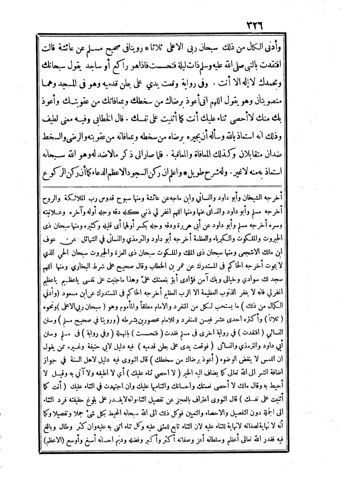 وأدنى الكمال من ذلك سبحان ربى الاعلى ثلاثا* روينا في صحيح مسلم عن عائشة قالت افتقدت بالنبي صلى الله عليه وسلم ذات ليلة فتحسست فاذا هو راكع أو ساجد يقول سبحانك وبحمدك لا إله الا أنت. وفي رواية وقعت يدي على بطن قدميه وهو في المسجد وهما منصوبتان وهو يقول اللهم انى أعوذ برضاك من سخطك وبمعافاتك من عقوبتك وأعوذ بك منك لا أحصى ثناء عليك أنت كما أثنيت على نفسك. قال الخطابى وفيه معنى لطيف وذلك انه استعاذ بالله وسأله أن يجيره برضاه من سخطه وبمعافاته من عقوبته والرضى والسخط ضدان متقابلان وكذلك المعافاة والمعاقبة. فلما صار الى ذكر ما لا ضد له وهو الله سبحانه استعاذ به منه لا غير. وله شرح طويل* واعلم ان ركن السجود الاعظم الدعاء كما أن ركن الركوع أخرجه الشيخان وأبو داود والنسائي وابن ماجه عن عائشة ومنها سبوح قدوس رب الملائكة والروح أخرجه مسلم وأبو داود والنسائى عنها ومنها اللهم اغفر لي ذنبي كله دقه وجله أوله وآخره وعلانيته وسره أخرجه مسلم وأبو داود عن أبى هريرة ودقه وجله بكسر أولهما أى قليله وكثيره ومنها سبحان ذى الجبروت والملكوت والكبرياء والعظمة أخرجه أبو داود والترمذي والنسائى في الشمائل عن عوف ابن مالك الاشجعى ومنها سبحان ذى الملك والملكوت سبحان ذى العزة والجبروت سبحان الحي الذي لا يموت أخرجه الحاكم في المستدرك عن عمر بن الخطاب وقال صحيح على شرط البخاري ومنها اللهم سجد لك سوادي وخيالى وبك آمن فؤادى أبؤ بنعمتك علىّ وهذا ما جنيت على نفسى يا عظيم يا عظيم اغفر لي فانه لا يغفر الذنوب العظيمة الا الرب العظيم أخرجه الحاكم في المستدرك عن ابن مسعود (وأدني الكمال من ذلك) ما يستحب لكل من المنفرد والامام مطلقا والمأموم وهو (سبحان ربي الاعلى) ونحوه (ثلاثا) وأكثره احدى عشر فيسن للمنفرد وللامام محصورين بشرطه (وروينا في صحيح مسلم) وسنن النسائي (افتقدت) في رواية اخرى في مسلم فقدت (فتحسست) بالمهملة (وفي رواية) في مسلم وسنن أبي داود والترمذي والنسائي (فوقعت يدى على بطن قدميه) فيه دليل لابي حنيفة وغيره ممن يقول ان اللمس لا ينقض الوضوء (أعوذ برضاك من سخطك) قال النووى فيه دليل لاهل السنة في جواز اضافة الشر الى الله تعالى كما يضاف اليه الخير (لا احصي ثناء عليك) أي لا اطيقه ولا آتي به وقيل لا أحيط به وقال مالك لا أحصى نعمتك واحسانك والثناء بها عليك وان اجتهدت في الثناء عليك (أنت كما أثنيت على نفسك) قال النووى اعتراف بالعجز عن تفصيل الثناء وانه لا يقدر على بلوغ حقيقته فرد الثناء الى الجملة دون التفصيل والاحصاء والتعيين فوكل ذلك الى الله سبحانه المحيط بكل شيء جملا وتفصيلا وكما أنه لا نهاية لصفاته لا نهاية للثناء عليه لان الثناء تابع للمثنى عليه وكل ثناء اثنى به عليه وان كثر وطال وبالغ فيه فقدر الله تعالى أعظم وسلطانه أعز وصفاته أكثر وأكبر وفضله وديم احسانه أسبغ وأوسع (الاعظم)