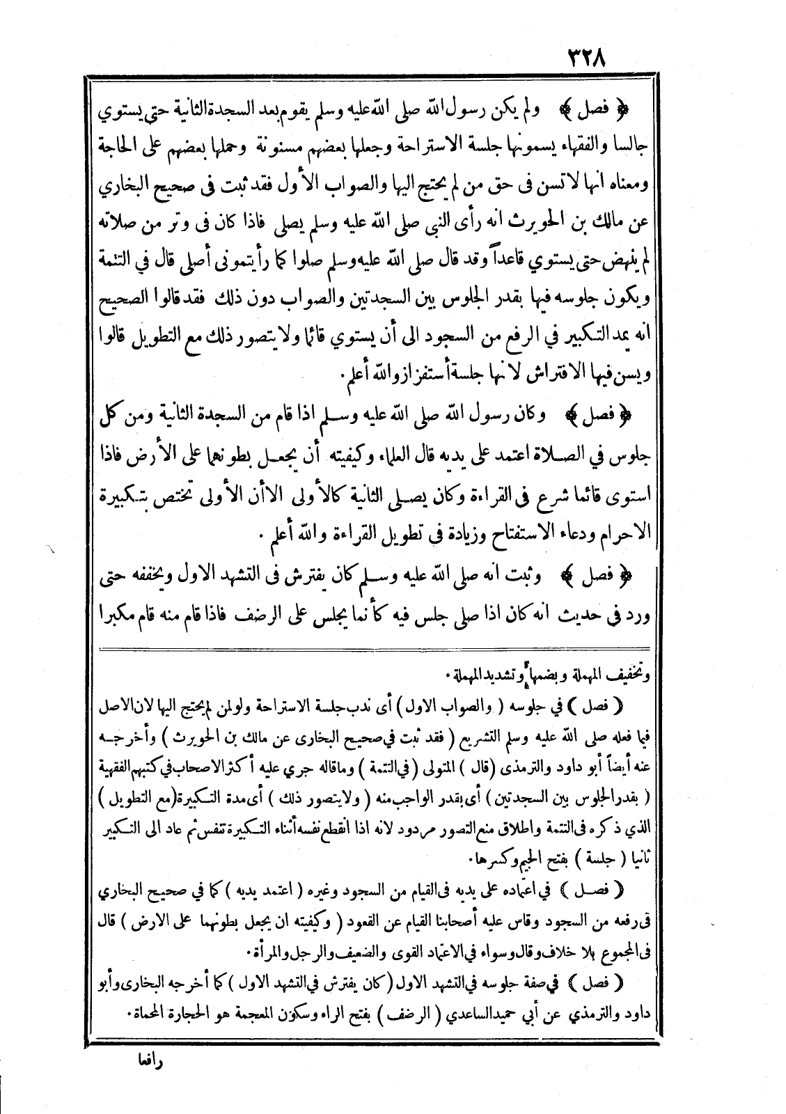 (فصل) في صفة جلوسه في التشهد الاول (كان يفترش في التشهد الاول) كما أخرجه البخارى وأبو داود والترمذي عن أبي حميد الساعدي (الرضف) بفتح الراء وسكون المعجمة هو الحجارة المحماة.