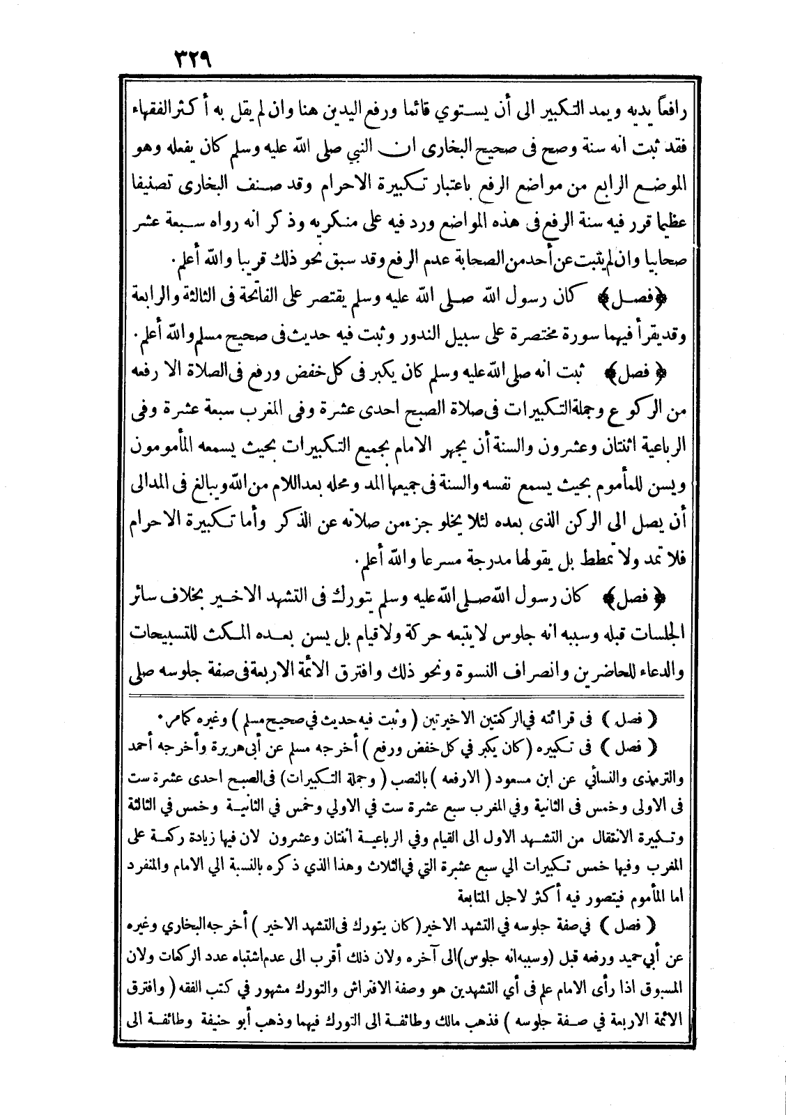 (فصل) في تكبيره (كان يكبر في كل خفض ورفع) أخرجه مسلم عن أبى هريرة وأخرجه أحمد والترمذى والنسائي عن ابن مسعود (الارفعه) بالنصب (وجملة التكبيرات) في الصبح احدى عشرة ست في الاولى وخمس في الثانية وفي المغرب سبع عشرة ست في الاولي وخمس في الثانية وخمس في الثالثة وتكبيرة الانتقال من التشهد الاول الى القيام وفي الرباعية اثنتان وعشرون لان فيها زيادة ركعة على المغرب وفيها خمس تكبيرات الي سبع عشرة التي في الثلاث وهذا الذي ذكره بالنسبة الي الامام والمنفرد اما المأموم فيتصور فيه أكثر لاجل المتابعة.