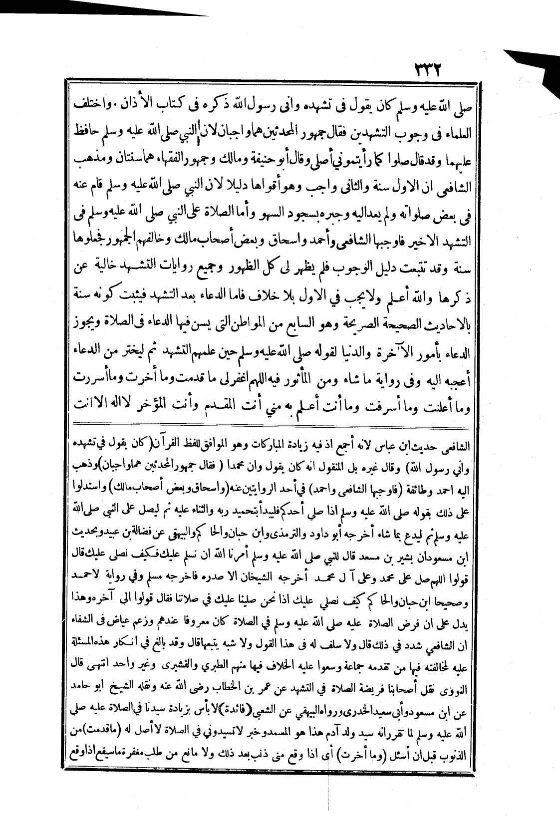 صلى الله عليه وسلم كان يقول في تشهده وانى رسول الله ذكره في كتاب الأذان. واختلف العلماء في وجوب التشهدين فقال جمهور المحدثين هما واجبان لان النبي صلى الله عليه وسلم حافظ عليهما وقد قال صلوا كما رأيتموني أصلى وقال أبو حنيفة ومالك وجمهور الفقهاء هما سنتان ومذهب الشافعي ان الاول سنة والثانى واجب وهو أقواها دليلا لان النبي صلى الله عليه وسلم قام عنه في بعض صلواته ولم يعد اليه وجبره بسجود السهو وأما الصلاة على النبي صلى الله عليه وسلم في التشهد الاخير فاوجبها الشافعى وأحمد واسحاق وبعض أصحاب مالك وخالفهم الجمهور فجعلوها سنة وقد تتبعت دليل الوجوب فلم يظهر لى كل الظهور وجميع روايات التشهد خالية عن ذكرها والله أعلم ولا يجب في الاول بلا خلاف فاما الدعاء بعد التشهد فيثبت كونه سنة بالاحاديث الصحيحة الصريحة وهو السابع من المواطن التى يسن فيها الدعاء في الصلاة ويجوز الدعاء بأمور الآخرة والدنيا لقوله صلى الله عليه وسلم حين علمهم التشهد ثم ليختر من الدعاء أعجبه اليه وفي رواية ما شاء ومن المأثور فيه اللهم اغفر لى ما قدمت وما أخرت وما أسررت وما أعلنت وما أسرفت وما أنت أعلم به مني أنت المقدم وأنت المؤخر لا اله الا انت الشافعى حديث ابن عباس لانه أجمع اذ فيه زيادة المباركات وهو الموافق للفظ القرآن (كان يقول في تشهده واني رسول الله) وقال غيره بل المنقول انه كان يقول وان محمدا (فقال جمهور المحدثين هما واجبان) وذهب اليه احمد وطائفة (فاوجبها الشافعى واحمد) في أحد الروايتين عنه (واسحاق وبعض أصحاب مالك) واستدلوا على ذلك بقوله صلى الله عليه وسلم اذا صلى أحدكم فليبدأ بتحميد ربه والثناء عليه ثم ليصل على النبى صلى الله عليه وسلم ثم ليدع بما شاء أخرجه أبو داود والترمذى وابن حبان والحاكم والبيهقى عن فضالة بن عبيد وبحديث ابن مسعودان بشير بن مسعد قال للنبي صلى الله عليه وسلم أمرنا الله ان نسلم عليك فكيف نصلى عليك قال قولوا اللهم صلى على محمد وعلى آل محمد أخرجه الشيخان الا صدره فاخرجه مسلم وفي رواية لاحمد وصحيحا ابن حبان والحاكم كيف نصلي عليك اذا نحن صلينا عليك في صلاتنا فقال قولوا الى آخره وهذا يدل على ان فرض الصلاة عليه صلى الله عليه وسلم في الصلاة كان معروفا عندهم وزعم عياض في الشفاء ان الشافعي شدد في ذلك قال ولا سلف له في هذا القول ولا شبه يتبعها قال وقد بالغ في انكار هذه المسئلة عليه لمخالفته فيها من تقدمه جماعة وسعوا عليه الخلاف فيها منهم الطبري والقشيرى وغير واحد انتهى قال النووى نقل أصحابنا فريضة الصلاة في التشهد عن عمر بن الخطاب رضى الله عنه ونقله الشيخ ابو حامد عن ابن مسعود وأبى سعيد الخدرى ورواه البيهقي عن الشعبى (فائدة) لا بأس بزيادة سيدنا في الصلاة عليه صلى الله عليه وسلم لما تقرر انه سيد ولد آدم هذا هو المعتمد وخبر لا تسيدوني في الصلاة لا أصل له (ما قدمت) من الذنوب قبل ان أسئل (وما أخرت) أى اذا وقع منى ذنب بعد ذلك ولا مانع من طلب مغفرة ما سيقع اذا وقع