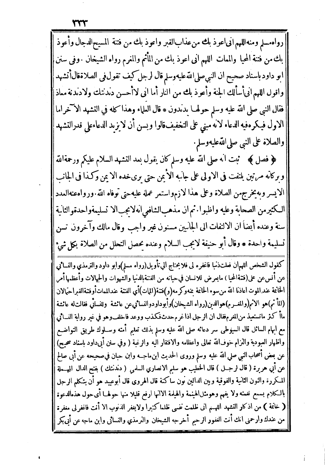 (فصل) ثبت انه صلى الله عليه وسلم كان يقول بعد التشهد السلام عليكم ورحمة الله وبركاته مرتين يلتفت في الاولى على جانبه الأيمن حتى يرى خده الايمن وكذا في الجانب الايسر وبه يخرج من الصلاة وعلى هذا لازم واستمر عمله عليه حتى توفاه الله. ورواه عنه العدد الكثير من الصحابة وعليه واظبوا. ثم ان مذهب الشافعي انه لا يجب الا تسليمة واحدة والثانية سنة وعنده أيضا ان الالتفات الى الجانبين مسنون غير واجب وقال مالك وآخرون تسن تسليمة واحدة* وقال أبو حنيفة لا يجب السلام وعنده يحصل التحلل من الصلاة بكل شيء كقول الشخص اللهم ان فعلت ذنبا فاغفره لى فلا يحتاج الي تأويل (رواه مسلم) وابو داود والترمذي والنسائي عن أنس عن على (فتنة المحيا) ما يعرض للانسان في حياته من الفتنة بالدنيا والشهوات والجهالات وأعظمها أمر الخاتمة عند الموت اعاذنا الله من سوء الخاتمة بمنه وكرمه (و) فتنة (الممات) أي الفتنة عند الممات أو فتنة القبر احتمالان (المأثم) هو الاثم (والمغرم) هو الدين (رواه الشيخان) وأبو داود والنسائي عن عائشة وللنسائي فقالت له عائشة ما أكثر ما تستعيذ من المغرم فقال ان الرجل اذا غرم حدث فكذب ووعد فاخلف وهو في غير رواية النسائي مع ابهام السائل قال السيوطى سر دعائه صلى الله عليه وسلم بذلك تعليم أمته وسلوك طريق التواضع واظهار العبودية والتزام خوف الله تعالى واعظامه والافتقار اليه والرغبة (وفي سنن أبى داود باسناد صحيح) عن بعض أصحاب النبي صلى الله عليه وسلم وروى الحديث ابن ماجه وابن حبان في صحيحه عن أبى صالح عن أبي هريرة (قال لرجل) قال الخطيب هو سليم الانصاري السلمي (دندنتك) بفتح الدال المهملة المكررة والنون الثانية والفوقية وبين الدالين نون ساكنة قال الهروى قال أبو عبيد هو أن يتكلم الرجل بالكلام يسمع نغمته ولا يفهم وهو مثل الهينمة والهيلمة الا انها ارفع قليلا منها حولها أى حول هذه الدعوة (خاتمة) من اذكار التشهد اللهم انى ظلمت نفسى ظلما كثيرا ولا يغفر الذنوب الا أنت فاغفر لى مغفرة من عندك وارحمنى انك أنت الغفور الرحيم أخرجه الشيخان والترمذي والنسائى وابن ماجه عن أبى بكر