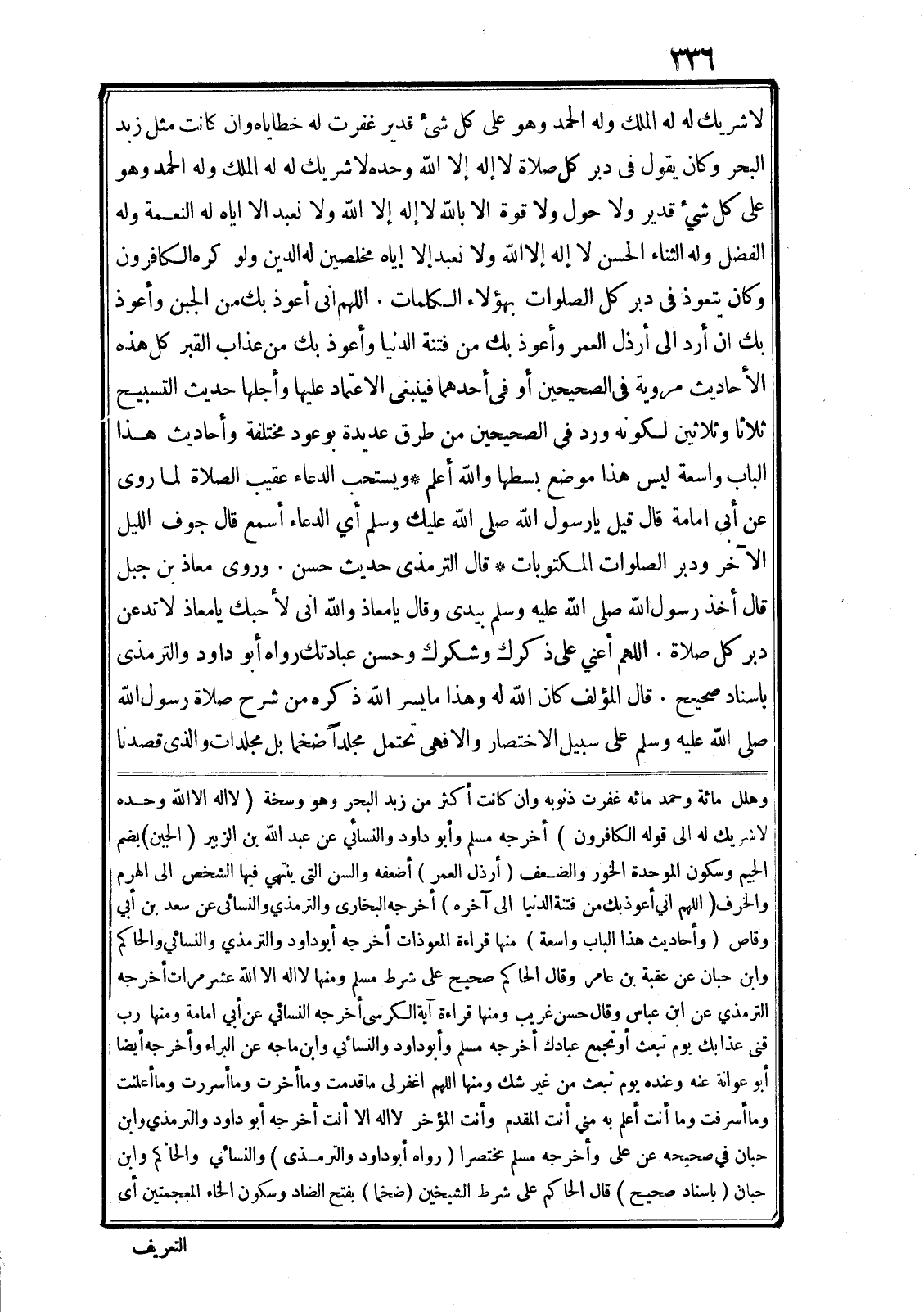 لا شريك له له الملك وله الحمد وهو على كل شيء قدير غفرت له خطاياه وان كانت مثل زبد البحر وكان يقول في دبر كل صلاة لا إله إلا الله وحده لا شريك له له الملك وله الحمد وهو على كل شيء قدير ولا حول ولا قوة الا بالله لا إله إلا الله ولا نعبد الا اياه له النعمة وله الفضل وله الثناء الحسن لا إله إلا الله ولا نعبد إلا إياه مخلصين له الدين ولو كره الكافرون وكان يتعوذ في دبر كل الصلوات بهؤلاء الكلمات. اللهم انى أعوذ بك من الجبن وأعوذ بك ان أرد الى أرذل العمر وأعوذ بك من فتنة الدنيا وأعوذ بك من عذاب القبر كل هذه الأحاديث مروية في الصحيحين أو في أحدهما فينبغى الاعتماد عليها وأجلها حديث التسبيح ثلاثا وثلاثين لكونه ورد في الصحيحين من طرق عديدة بوعود مختلفة وأحاديث هذا الباب واسعة ليس هذا موضع بسطها والله أعلم* ويستحب الدعاء عقيب الصلاة لما روى عن أبى امامة قال قيل يا رسول الله صلى الله عليك وسلم أي الدعاء أسمع قال جوف الليل الآخر ودبر الصلوات المكتوبات* قال الترمذى حديث حسن. وروى معاذ بن جبل قال أخذ رسول الله صلى الله عليه وسلم بيدى وقال يا معاذ والله انى لأحبك يا معاذ لا تدعن دبر كل صلاة. اللهم أعني على ذكرك وشكرك وحسن عبادتك رواه أبو داود والترمذى باسناد صحيح. قال المؤلف كان الله له وهذا ما يسر الله ذكره من شرح صلاة رسول الله صلى الله عليه وسلم على سبيل الاختصار والافهى تحتمل مجلدا ضخما بل مجلدات والذى قصدنا وهلل مائة وحمد مائه غفرت ذنوبه وان كانت أكثر من زبد البحر وهو وسخة (لا اله الا الله وحده لا شريك له الى قوله الكافرون) أخرجه مسلم وأبو داود والنسائي عن عبد الله بن الزبير (الجبن) بضم الجيم وسكون الموحدة الخور والضعف (أرذل العمر) أضعفه والسن التى ينتهي فيها الشخص الى الهرم والخرف (اللهم اني أعوذ بك من فتنة الدنيا الى آخره) أخرجه البخارى والترمذي والنسائى عن سعد بن أبي وقاص (وأحاديث هذا الباب واسعة) منها قراءة المعوذات أخرجه أبو داود والترمذي والنسائي والحاكم وابن حبان عن عقبة بن عامر وقال الحاكم صحيح على شرط مسلم ومنها لا اله الا الله عشر مرات أخرجه الترمذي عن ابن عباس وقال حسن غريب ومنها قراءة آية الكرسى أخرجه النسائي عن أبي امامة ومنها رب قنى عذابك يوم تبعث أو تجمع عبادك أخرجه مسلم وأبو داود والنسائي وابن ماجه عن البراء وأخرجه أيضا أبو عوانة عنه وعنده يوم تبعث من غير شك ومنها اللهم اغفر لى ما قدمت وما أخرت وما أسررت وما أعلنت وما أسرفت وما أنت أعلم به مني أنت المقدم وأنت المؤخر لا اله الا أنت أخرجه أبو داود والترمذي وابن حبان في صحيحه عن على وأخرجه مسلم مختصرا (رواه أبو داود والترمذى) والنسائي والحاكم وابن حبان (باسناد صحيح) قال الحاكم على شرط الشيخين (ضخما) بفتح الضاد وسكون الخاء المعجمتين أى