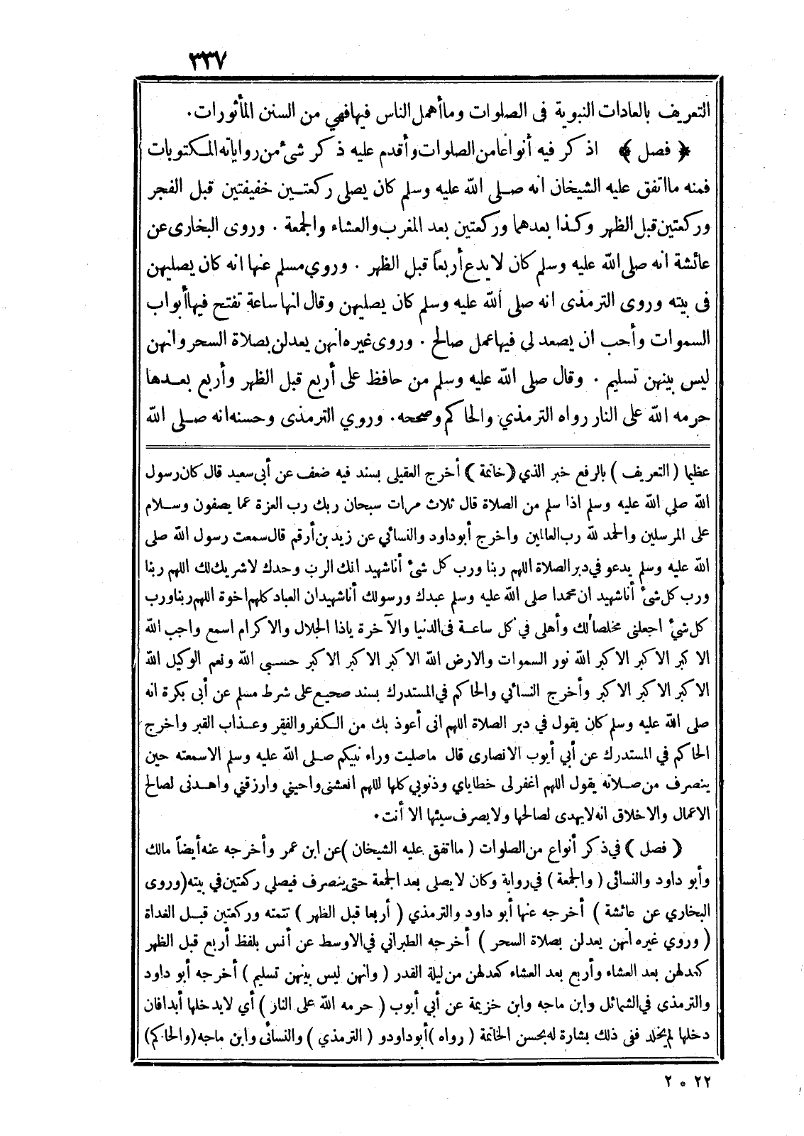 (فصل) اذكر فيه أنواعا من الصلوات وأقدم عليه ذكر شيء من رواياته المكتوبات فمنه ما اتفق عليه الشيخان انه صلى الله عليه وسلم كان يصلى ركعتين خفيفتين قبل الفجر وركعتين قبل الظهر وكذا بعدهما وركعتين بعد المغرب والعشاء والجمعة. وروى البخارى عن عائشة انه صلى الله عليه وسلم كان لا يدع أربعا قبل الظهر. وروى مسلم عنها انه كان يصليهن في بيته وروى الترمذى انه صلى الله عليه وسلم كان يصليهن وقال انها ساعة تفتح فيها أبواب السموات وأحب ان يصعد لى فيها عمل صالح. وروى غيره انهن يعدلن بصلاة السحر وانهن ليس بينهن تسليم. وقال صلى الله عليه وسلم من حافظ على أربع قبل الظهر وأربع بعدها حرمه الله على النار رواه الترمذي والحاكم وصححه. وروي الترمذى وحسنه انه صلى الله عظيما (التعريف) بالرفع خبر الذي (خاتمة) أخرج العقيلى بسند فيه ضعف عن أبى سعيد قال كان رسول الله صلى الله عليه وسلم اذا سلم من الصلاة قال ثلاث مرات سبحان ربك رب العزة عما يصفون وسلام على المرسلين والحمد لله رب العالمين واخرج أبو داود والنسائي عن زيد بن أرقم قال سمعت رسول الله صلى الله عليه وسلم يدعو في دبر الصلاة اللهم ربنا ورب كل شيء أنا شهيد انك الرب وحدك لا شريك لك اللهم ربنا ورب كل شيء أنا شهيد ان محمدا صلى الله عليه وسلم عبدك ورسولك أنا شهيد ان العباد كلهم اخوة اللهم ربنا ورب كل شيء اجعلنى مخلصا لك وأهلى في كل ساعة في الدنيا والآخرة يا ذا الجلال والاكرام اسمع واجب الله الاكبر الاكبر الاكبر الله نور السموات والارض الله الاكبر الاكبر الاكبر حسبى الله ونعم الوكيل الله الاكبر الاكبر الاكبر وأخرج النسائي والحاكم في المستدرك بسند صحيح على شرط مسلم عن أبى بكرة انه صلى الله عليه وسلم كان يقول في دبر الصلاة اللهم انى أعوذ بك من الكفر والفقر وعذاب القبر واخرج الحاكم في المستدرك عن أبي أيوب الانصارى قال ما صليت وراء نبيكم صلى الله عليه وسلم الا سمعته حين ينصرف من صلاته يقول اللهم اغفر لى خطاياي وذنوبي كلها اللهم العشنى واحيني وارزقني واهدنى لصالح الاعمال والاخلاق انه لا يهدى لصالحها ولا يصرف سيئها الا أنت.