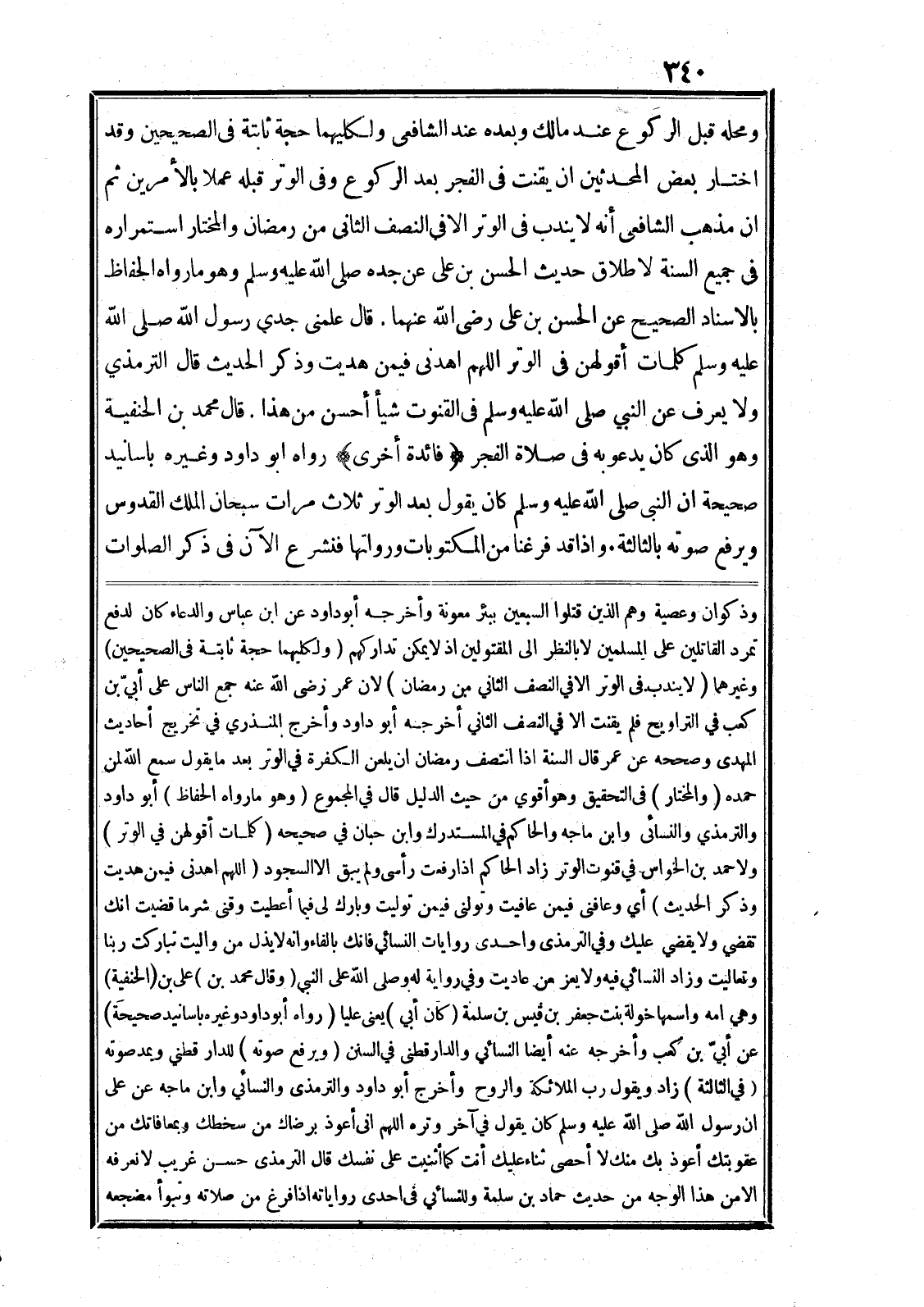 (فائدة أخرى) رواه ابو داود وغيره باسانيد صحيحة ان النبى صلى الله عليه وسلم كان يقول بعد الوتر ثلاث مرات سبحان الملك القدوس ويرفع صوته بالثالثة. واذا قد فرغنا من المكتوبات ورواتها فنشرع الآن في ذكر الصلوات وذكوان وعصية وهم الذين قتلوا السبعين ببئر معونة وأخرجه أبو داود عن ابن عباس والدعاء كان لدفع تمرد القاتلين على المسلمين لا بالنظر الى المقتولين اذ لا يمكن تداركهم (ولكليهما حجة ثابتة في الصحيحين) وغيرهما (لا يندب في الوتر الا في النصف الثاني من رمضان) لان عمر رضى الله عنه جمع الناس على أبيّ بن كعب في التراويح فلم يقنت الا في النصف الثاني أخرجه أبو داود وأخرج المنذري في تخريج أحاديث المهدى وصححه عن عمر قال السنة اذا انتصف رمضان ان يلعن الكفرة في الوتر بعد ما يقول سمع الله لمن حمده (والمختار) في التحقيق وهو أقوي من حيث الدليل قال في المجموع (وهو ما رواه الحفاظ) أبو داود والترمذي والنسائى وابن ماجه والحاكم في المستدرك وابن حبان في صحيحه (كلمات أقولهن في الوتر) ولاحمد بن الخواس في قنوت الوتر زاد الحاكم اذا رفعت رأسى ولم يبق الا السجود (اللهم اهدنى فيمن هديت وذكر الحديث) أي وعافنى فيمن عافيت وتولنى فيمن توليت وبارك لى فيما أعطيت وقنى شر ما قضيت انك تقضي ولا يقضي عليك وفي الترمذى واحدى روايات النسائي فانك بالفاء وانه لا يذل من واليت تباركت ربنا وتعاليت وزاد النسائي فيه ولا يعز من عاديت وفي رواية له وصلى الله على النبي (وقال محمد بن) على بن (الحنفية) وهي امه واسمها خولة بنت جعفر بن قيس بن سلمة (كان أبي) يعنى عليا (رواه أبو داود وغيره باسانيد صحيحة) عن أبيّ بن كعب وأخرجه عنه أيضا النسائي والدار قطنى في السنن (ويرفع صوته) للدار قطني ويمد صوته (في الثالثة) زاد ويقول رب الملائكة والروح وأخرج أبو داود والترمذى والنسائي وابن ماجه عن على ان رسول الله صلى الله عليه وسلم كان يقول في آخر وتره اللهم انى أعوذ برضاك من سخطك وبمعافاتك من عقوبتك أعوذ بك منك لا أحصى ثناء عليك أنت كما أثنيت على نفسك قال الترمذى حسن غريب لا نعرفه الا من هذا الوجه من حديث حماد بن سلمة وللنسائي في احدى رواياته اذا فرغ من صلاته وتبوأ مضجعه