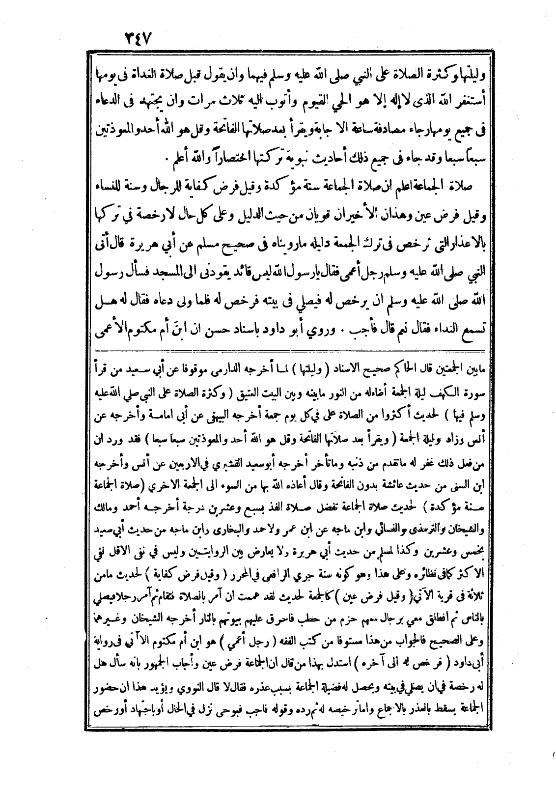 صلاة الجماعة اعلم ان صلاة الجماعة سنة مؤكدة وقيل فرض كفاية للرجال وسنة للنساء وقيل فرض عين وهذان الأخيران قويان من حيث الدليل وعلى كل حال لا رخصة في تركها بالاعذار التى ترخص في ترك الجمعة دليله ما رويناه في صحيح مسلم عن أبي هريرة قال أتى النبي صلى الله عليه وسلم رجل أعمى فقال يا رسول الله ليس قائد يقودنى الى المسجد فسأل رسول الله صلى الله عليه وسلم ان يرخص له فيصلي في بيته فرخص له فلما ولى دعاه فقال له هل تسمع النداء فقال نعم قال فأجب. وروي أبو داود باسناد حسن ان ابن أم مكتوم الأعمى ما بين الجمعتين قال الحاكم صحيح الاسناد (وليلتها) لما أخرجه الدارمى موقوفا عن أبي سعيد من قرأ سورة الكهف ليلة الجمعة أضاءله من النور ما بينه وبين البيت العتيق (وكثرة الصلاة على النبي صلى الله عليه وسلم فيها) لحديث أكثروا من الصلاة على في كل يوم جمعة أخرجه البيهقى عن أبى امامة وأخرجه عن أنس وزاد وليلة الجمعة (ويقرأ بعد صلاتها الفاتحة وقُلْ هُوَ اللَّهُ أَحَدٌ والمعوذتين سبعا سبعا) فقد ورد ان من فعل ذلك غفر له ما تقدم من ذنبه وما تأخر أخرجه أبو سعيد القشيري في الاربعين عن أنس وأخرجه ابن السنى من حديث عائشة بدون الفاتحة وقال أعاذه الله بها من السوء الى الجمعة الاخري (صلاة الجماعة سنة مؤكدة) لحديث صلاة الجماعة تفضل صلاة الفذ بسبع وعشرين درجة أخرجه أحمد ومالك والشيخان والترمذى والنسائي وابن ماجه عن ابن عمر ولاحمد والبخارى وابن ماجه من حديث أبي سعيد بخمس وعشرين وكذا لمسلم من حديث أبي هريرة ولا يعارض بين الروايتين وليس في نفي الاقل نفي الاكثر كما في نظائره وعلى هذا وهو كونه سنة جري الرافعى في المحرر (وقيل فرض كفاية) لحديث ما من ثلاثة في قرية الآتي (وقيل فرض عين) كالجمعة لحديث لقد هممت ان آمر بالصلاة فتقام ثم آمر رجلا فيصلي بالناس ثم انطلق معي برجال معهم حزم من حطب فاحرق عليهم بيوتهم بالنار أخرجه الشيخان وغيرهما وعلى الصحيح فالجواب من هذا مستوفا من كتب الفقه (رجل أعمي) هو ابن أم مكتوم الا آتى في رواية أبى داود (فرخص له الى آخره) استدل بهذا من قال ان الجماعة فرض عين وأجاب الجمهور بانه سأل هل له رخصة في ان يصلي في بيته ويحصل له فضيلة الجماعة بسبب عذره فقال لا قال النووي ويؤيد هذا ان حضور الجماعة يسقط بالعذر بالاجماع واما ترخيصه له ثم رده وقوله فاجب فبوحى نزل في الحال أو باجتهاد أو رخص