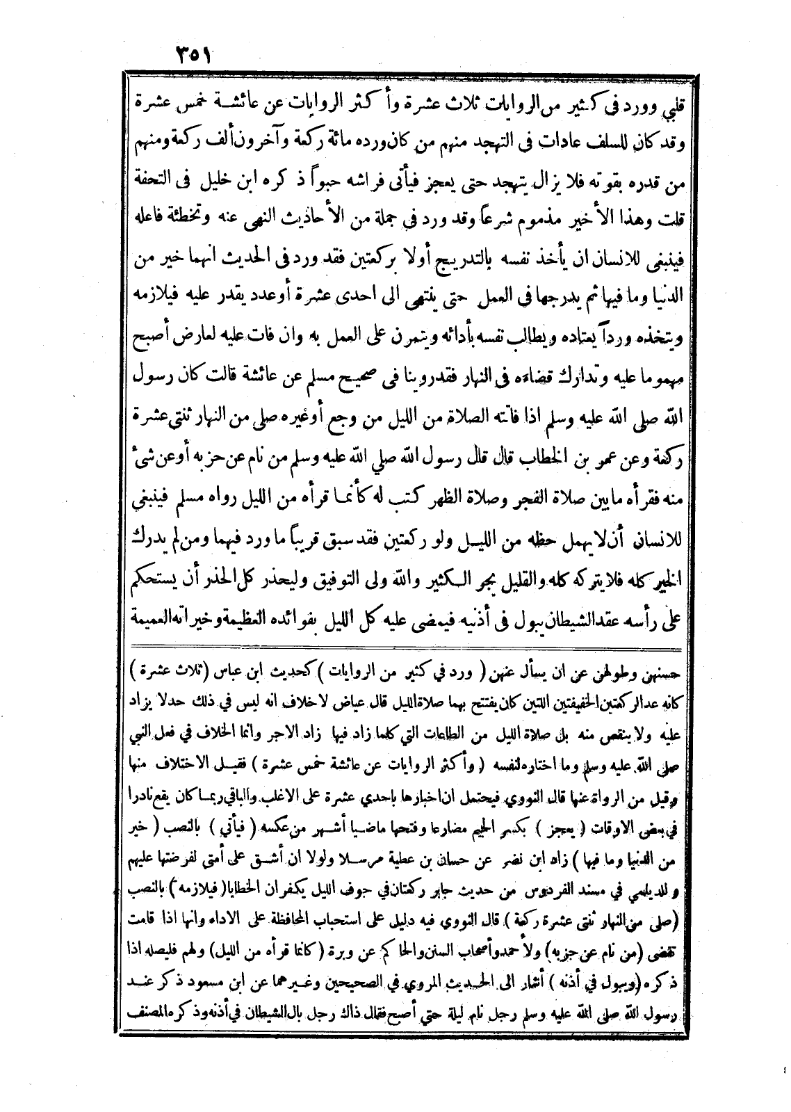 قلبي وورد في كثير من الروايات ثلاث عشرة وأكثر الروايات عن عائشة خمس عشرة وقد كان للسلف عادات في التهجد منهم من كان ورده مائة ركعة وآخرون ألف ركعة ومنهم من قدره بقوته فلا يزال يتهجد حتى يعجز فيأتى فراشه حبوا ذكره ابن خليل في التحفة قلت وهذا الأخير مذموم شرعا وقد ورد في جملة من الأحاديث النهى عنه وتخطئة فاعله فينبغى للانسان ان يأخذ نفسه بالتدريج أولا بركعتين فقد ورد في الحديث انهما خير من الدنيا وما فيها ثم يدرجها في العمل حتى ينتهى الى احدى عشرة أو عدد يقدر عليه فيلازمه ويتخذه وردا يعتاده ويطالب نفسه بأدائه ويتمرن على العمل به وان فات عليه لعارض أصبح مهموما عليه وتدارك قضاءه في النهار فقد روينا في صحيح مسلم عن عائشة قالت كان رسول الله صلى الله عليه وسلم اذا فاتته الصلاة من الليل من وجع أو غيره صلى من النهار ثنتى عشرة ركعة وعن عمر بن الخطاب قال قال رسول الله صلى الله عليه وسلم من نام عن حزبه أو عن شيء منه فقرأه ما بين صلاة الفجر وصلاة الظهر كتب له كأنما قرأه من الليل رواه مسلم فينبغي للانسان أن لا يهمل حظه من الليل ولو ركعتين فقد سبق قريبا ما ورد فيهما ومن لم يدرك الخير كله فلا يتركه كله والقليل يجر الكثير والله ولى التوفيق وليحذر كل الحذر أن يستحكم على رأسه عقد الشيطان يبول في أذنيه فيمضى عليه كل الليل بفوائده العظيمة وخيراته العميمة حسنهن وطولهن عن ان يسأل عنهن (ورد في كثير من الروايات) كحديث ابن عباس (ثلاث عشرة) كانه عد الركعتين الخفيفتين اللتين كان يفتتح بهما صلاة الليل قال عياض لا خلاف انه ليس في ذلك حد لا يزاد عليه ولا ينقص منه بل صلاة الليل من الطاعات التي كلما زاد فيها زاد الاجر وانما الخلاف في فعل النبي صلى الله عليه وسلم وما اختاره لنفسه (وأكثر الروايات عن عائشة خمس عشرة) فقيل الاختلاف منها وقيل من الرواة عنها قال النووي فيحتمل ان اخبارها باحدي عشرة على الاغلب والباقي ربما كان يقع نادرا في بعض الاوقات (يعجز) بكسر الجيم مضارعا وفتحها ماضيا أشهر من عكسه (فيأتي) بالنصب (خير من الدنيا وما فيها) زاد ابن نضر عن حسان بن عطية مرسلا ولولا ان أشق على أمتي لفرضتها عليهم وللديلمي في مسند الفردوس من حديث جابر ركعتان في جوف الليل يكفران الخطايا (فيلازمه) بالنصب (صلى من النهار ثنتى عشرة ركعة) قال النووى فيه دليل على استحباب المحافظة على الاداء وانها اذا قامت تقضى (من نام عن جزبه) ولأحمد وأصحاب السنن والحاكم عن وبرة (كانما قرأه من الليل) ولهم فليصله اذا ذكره (ويبول في أذنه) أشار الى الحديث المروي في الصحيحين وغيرهما عن ابن مسعود ذكر عند رسول الله صلى الله عليه وسلم رجل نام ليلة حتى أصبح فقال ذاك رجل بال الشيطان في أذنه وذكره المصنف