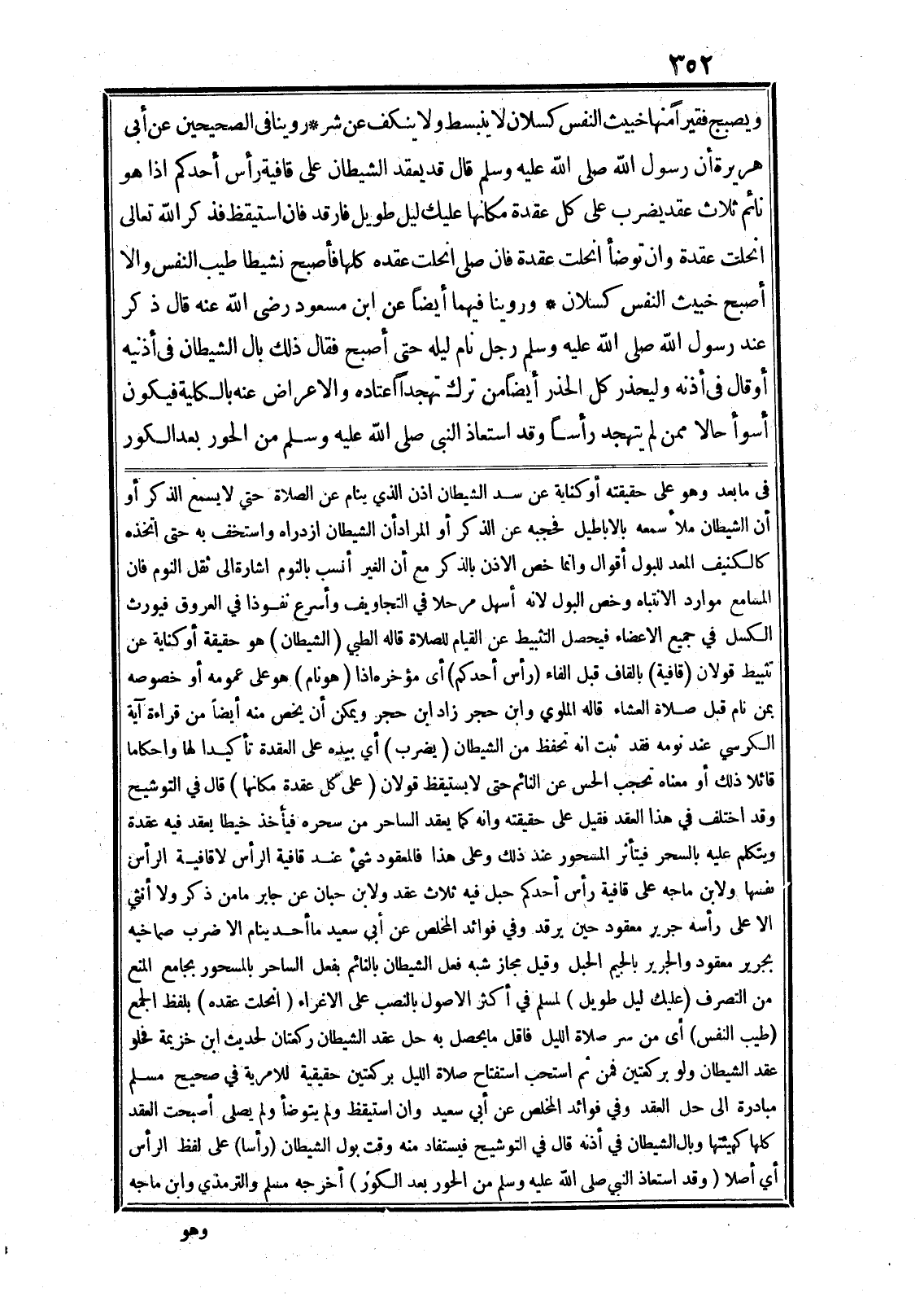 ويصبج فقيرا منها خبيث النفس كسلان لا ينبسط ولا ينكف عن شر* روينا في الصحيحين عن أبى هريرة أن رسول الله صلى الله عليه وسلم قال قد يعقد الشيطان على قافية رأس أحدكم اذا هو نائم ثلاث عقد يضرب على كل عقدة مكانها عليك ليل طويل فارقد فان استيقظ فذكر الله تعالى انحلت عقدة وان توضأ انحلت عقدة فان صلى انحلت عقده كلها فأصبح نشيطا طيب النفس والا أصبح خبيث النفس كسلان* وروينا فيهما أيضا عن ابن مسعود رضى الله عنه قال ذكر عند رسول الله صلى الله عليه وسلم رجل نام ليله حتى أصبح فقال ذلك بال الشيطان في أذنيه أو قال في أذنه وليحذر كل الحذر أيضا من ترك تهجدا اعتاده والاعراض عنه بالكلية فيكون أسوأ حالا ممن لم يتهجد رأسا وقد استعاذ النبي صلى الله عليه وسلم من الحور بعد الكور في ما بعد وهو على حقيقته أو كناية عن سد الشيطان اذن الذي ينام عن الصلاة حتى لا يسمع الذكر أو أن الشيطان ملأ سمعه بالاباطيل فحجبه عن الذكر أو المراد أن الشيطان ازدراه واستخف به حتى اتخذه كالكنيف المعد للبول أقوال وانما خص الاذن بالذكر مع أن الغير أنسب بالنوم اشارة الى ثقل النوم فان المسامع موارد الانتباه وخص البول لانه أسهل مرحلا في التجاويف وأسرع نفوذا في العروق فيورث الكسل في جميع الاعضاء فيحصل التثبيط عن القيام للصلاة قاله الطبي (الشيطان) هو حقيقة أو كناية عن تثبيط قولان (قافية) بالقاف قبل الفاء (رأس أحدكم) أى مؤخره اذا (هو نام) هو على عمومه أو خصوصه بمن نام قبل صلاة العشاء قاله الملوي وابن حجر زاد ابن حجر ويمكن أن يخص منه أيضا من قراءة آية الكرسي عند نومه فقد ثبت انه تحفظ من الشيطان (يضرب) أي بيده على العقدة تأكيدا لها واحكاما قائلا ذلك أو معناه تحجب الحس عن النائم حتى لا يستيقظ قولان (على كل عقدة مكانها) قال في التوشيح وقد اختلف في هذا العقد فقيل على حقيقته وانه كما يعقد الساحر من سحره فيأخذ خيطا يعقد فيه عقدة ويتكلم عليه بالسحر فيتأثر المسحور عند ذلك وعلى هذا فالمعقود شيء عند قافية الرأس لا قافية الرأس نفسها ولابن ماجه على قافية رأس أحدكم حبل فيه ثلاث عقد ولابن حبان عن جابر ما من ذكر ولا أنثي الا على رأسه جرير معقود حين يرقد وفي فوائد المخلص عن أبى سعيد ما أحد ينام الا ضرب صماخيه بجرير معقود والجرير بالجيم الحبل وقيل مجاز شبه فعل الشيطان بالنائم بفعل الساحر بالمسحور بجامع المنع من التصرف (عليك ليل طويل) لمسلم في أكثر الاصول بالنصب على الاغراء (انحلت عقده) بلفظ الجمع (طيب النفس) أى من سر صلاة الليل فاقل ما يحصل به حل عقد الشيطان ركعتان لحديث ابن خزيمة فحلو عقد الشيطان ولو بركعتين فمن ثم استحب استفتاح صلاة الليل بركعتين حقيقية للامرية في صحيح مسلم مبادرة الى حل العقد وفي فوائد المخلص عن أبي سعيد وان استيقظ ولم يتوضأ ولم يصلى أصبحت العقد كلها كهيئتها وبال الشيطان في أذنه قال في التوشيح فيستفاد منه وقت بول الشيطان (رأسا) على لفظ الرأس أي أصلا (وقد استعاذ النبي صلى الله عليه وسلم من الحور بعد الكور) أخرجه مسلم والترمذي وابن ماجه