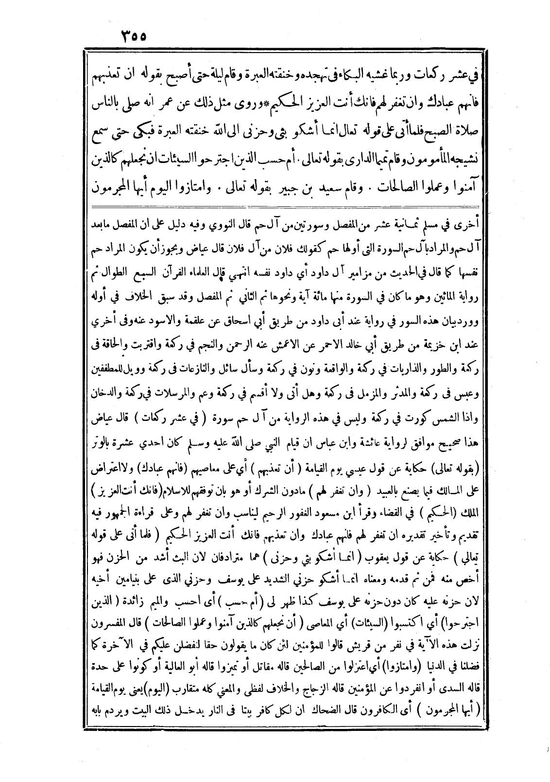 أخرى في مسلم ثمانية عشر من المفصل وسورتين من آل حم قال النووي وفيه دليل على ان المفصل ما بعد آل حم والمراد بآل حم السورة التى أولها حم كقولك فلان من آل فلان قال عياض ويجوز أن يكون المراد حم نفسها كما قال في الحديث من مزامير آل داود أي داود نفسه انتهي قال العلماء القرآن السبع الطوال ثم رواية المائين وهو ما كان في السورة منها مائة آية ونحوها ثم الثاني ثم المفصل وقد سبق الخلاف في أوله وورد بيان هذه السور في رواية عند أبى داود من طريق أبي اسحاق عن علقمة والاسود عنه وفي أخري عند ابن خزيمة من طريق أبي خالد الاحمر عن الاعمش عنه الرحمن والنجم في ركعة واقتربت والحاقة في ركعة والطور والذاريات في ركعة والواقعة ونون في ركعة وسأل سائل والنازعات في ركعة وويل للمطففين وعبس في ركعة والمدثر والمزمل في ركعة وهل أتى ولا أقسم في ركعة وعم والمرسلات في ركعة والدخان واذا الشمس كورت في ركعة وليس في هذه الرواية من آل حم سورة (في عشر ركعات) قال عياض هذا صحيح موافق لرواية عائشة وابن عباس ان قيام النبي صلى الله عليه وسلم كان احدي عشرة بالوتر (بقوله تعالى) حكاية عن قول عيسي يوم القيامة (إِنْ تُعَذِّبْهُمْ) أي على معاصيهم (فَإِنَّهُمْ عِبادُكَ) ولا اعتراض على المالك فيما يصنع بالعبيد (وَإِنْ تَغْفِرْ لَهُمْ) ما دون الشرك أو هو بان توفقهم للاسلام (فَإِنَّكَ أَنْتَ الْعَزِيزُ) الملك (الْحَكِيمُ) في القضاء وقرأ ابن مسعود الغفور الرحيم ليناسب وَإِنْ تَغْفِرْ لَهُمْ وعلى قراءة الجمهور فيه تقديم وتأخير تقديره إِنْ تُعَذِّبْهُمْ فَإِنَّهُمْ عِبادُكَ وَإِنْ تَغْفِرْ لَهُمْ فَإِنَّكَ أَنْتَ الْعَزِيزُ الْحَكِيمُ (فلما أتى على قوله تعالى) حكاية عن قول يعقوب (َّما أَشْكُوا بَثِّي وَحُزْنِي) هما مترادفان لان البث أشد من الحزن فهو أخص منه فمن ثم قدمه ومعناه انما أشكو حزني الشديد على يوسف وحزني الذى على بنيامين أخيه لان حزنه عليه كان دون حزنه على يوسف كذا ظهر لى (أَمْ حَسِبَ) أى احسب والميم زائدة (الَّذِينَ اجْتَرَحُوا) أي اكتسبوا (السَّيِّئاتِ) أي المعاصى (أَنْ نَجْعَلَهُمْ كَالَّذِينَ آمَنُوا وَعَمِلُوا الصَّالِحاتِ) قال المفسرون نزلت هذه الآية في نفر من قريش قالوا للمؤمنين لئن كان ما يقولون حقا لنفضلن عليكم في الآخرة كما فضلنا في الدنيا (وَامْتازُوا) أي اعتزلوا من الصالحين قاله مقاتل أو تميزوا قاله أبو العالية أو كونوا على حدة قاله السدى أو انفردوا عن المؤمنين قاله الزجاج والخلاف لفظى والمعني كله متقارب (الْيَوْمَ) يعنى يوم القيامة (أَيُّهَا الْمُجْرِمُونَ) أى الكافرون قال الضحاك ان لكل كافر بيتا في النار يدخل ذلك البيت ويردم بابه