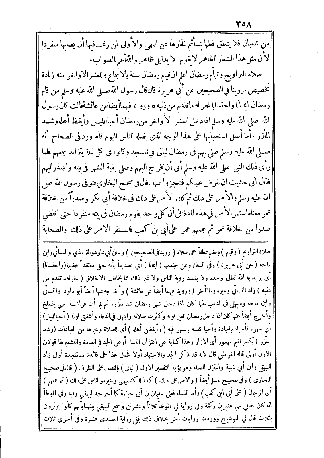 صلاة التراويح وقيام رمضان اعلم ان قيام رمضان سنة بالاجماع وللعشر الاواخر منه زيادة تخصيص. روينا في الصحيحين عن أبى هريرة قال قال رسول الله صلى الله عليه وسلم من قام رمضان ايمانا واحتسابا غفر له ما تقدم من ذنبه* وروينا فيهما أيضا عن عائشة قالت كان رسول الله صلى الله عليه وسلم اذا دخل العشر الأواخر من رمضان أحيا الليل وأيقظ أهله وشد المئزر. أما أصل استحبابها على هذا الوجه الذى يفعله الناس اليوم فانه ورد في الصحاح أنه صلى الله عليه وسلم صلى بهم في رمضان ليالى في المسجد وكانوا في كل ليلة يتزايد جمعهم فلما رأى ذلك النبى صلى الله عليه وسلم أبى أن يخرج اليهم وصلى بقية الشهر في بيته واعتذر اليهم فقال انى خشيت ان تفرض عليكم فتعجزوا عنها. قال في صحيح البخاري فتوفي رسول الله صلى الله عليه وسلم والأمر على ذلك ثم كان الأمر على ذلك في خلافة أبى بكر وصدرا من خلافة عمر معناه استمر الأمر في هذه المدة على أن كل واحد يقوم رمضان في بيته منفردا حتى انقضي صدرا من خلافة عمر ثم جمعهم عمر على أبى بن كعب فاستقر الامر على ذلك والصحابة صلاة التراويح (وقيام) بالضم عطفا على صلاة (روينا في الصحيحين) وسنن أبي داود والترمذي والنسائي وابن ماجه (عن أبى هريرة) وفي السنن وعن جندب (ايمانا) أي تصديقا بأنه حق معتقدا فضيلة (واحتسابا) أى يريد به الله تعالى وحده ولا يقصد روية الناس ولا غير ذلك مما يخالف الاخلاق (غفر له ما تقدم من ذنبه) زاد النسائي وغيره وما تأخر (وروينا فيهما أيضا عن عائشة) وأخرجه عنها أيضا أبو داود والنسائى وابن ماجه وللبيهقى في الشعب عنها كان اذا دخل شهر رمضان شد مئزره ثم لم يأت فراشه حتى ينسلخ وأخرج أيضا عنها كان اذا دخل رمضان تغير لونه وكثرت صلاته وابتهل في الدعاء وأشفق لونه (أحيا الليل) أي سهره فأحياه بالعبادة وأحيا نفسه بالسهر فيه (وأيقظن أهله) أى للصلاة وغيرها من العبادات (وشد المئزر) بكسر الميم مهموز أى الازار وهذا كناية عن اعتزال النسا أو عن الجد في العبادة والتشمير لها قولان الاول أولى قاله القرطبي قال لانه قد ذكر الجد والاجتهاد أولا فحمل هذا على فائدة مستنجدة أولى زاد البيهقى وابن أبي شيبة واعتزل النساء وهو يؤيد التفسير الاول (ليالى) بالنصب على الظرف (قال في صحيح البخارى) وفي صحيح مسلم أيضا (والامر على ذلك) كذا للكشميهنى ولغيره والناس على ذلك (ثم جمعهم) أى الرجال (على أبى ابن كعب) وأما النساء فعلى سليمان بن أبى خيثمة كما أخرجه البيهقي وفيه وفي الموطأ انه كان يصلي بهم عشرين ركعة وفي رواية في الموطأ ثلاثا وعشرين وجمع البيهقي بينهما بأنهم كانوا يوترون بثلاث قال في التوشيح ووردت روايات أخر بخلاف ذلك ففي رواية احدى عشرة وفي أخري ثلاث