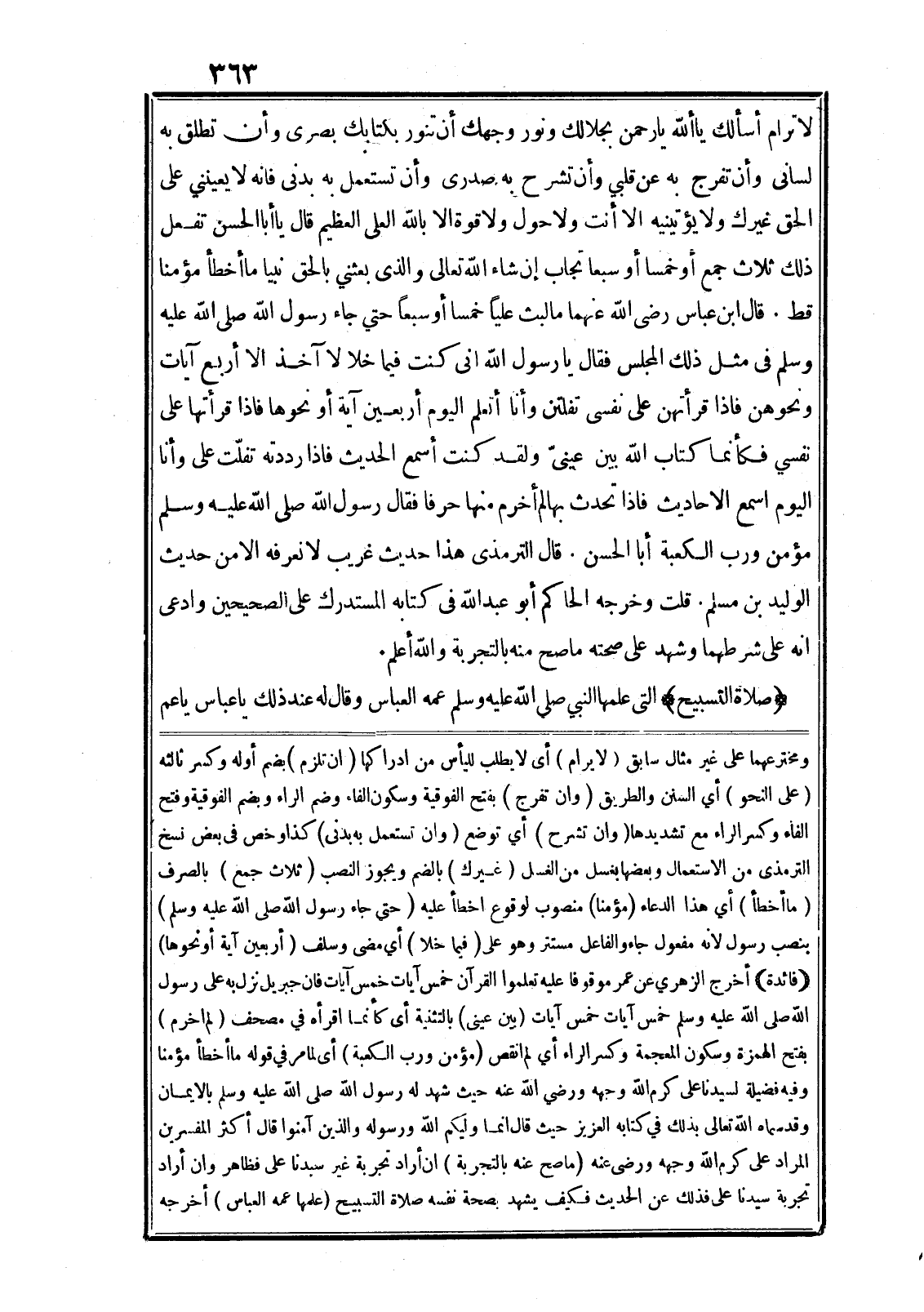 (صلاة التسبيح) التى علمها النبي صلى الله عليه وسلم عمه العباس وقال له عند ذلك يا عباس يا عم ومخترعهما على غير مثال سابق (لا يرام) أى لا يطلب لليأس من ادراكها (ان تلزم) بضم أوله وكسر ثالثه (على النحو) أي السنن والطريق (وان تفرج) بفتح الفوقية وسكون الفاء وضم الراء وبضم الفوقية وفتح الفاء وكسر الراء مع تشديدها (وان تشرح) أي توضع (وان تستعمل به بدنى) كذا وخص في بعض نسخ الترمذى من الاستعمال وبعضها بغسل من الغسل (غيرك) بالضم ويجوز النصب (ثلاث جمع) بالصرف (ما أخطأ) أي هذا الدعاء (مؤمنا) منصوب لوقوع اخطأ عليه (حتى جاء رسول الله صلى الله عليه وسلم) بنصب رسول لانه مفعول جاء والفاعل مستتر وهو على (فيما خلا) أي مضى وسلف (أربعين آية أو نحوها) (فائدة) أخرج الزهري عن عمر موقوفا عليه تعلموا القرآن خمس آيات خمس آيات فان جبريل نزل به على رسول الله صلى الله عليه وسلم خمس آيات خمس آيات (بين عينى) بالتثنية أى كأنما اقرأه في مصحف (لم اخرم) بفتح الهمزة وسكون المعجمة وكسر الراء أي لم انقص (مؤمن ورب الكعبة) أى لما مر في قوله ما أخطأ مؤمنا وفيه فضيلة لسيدنا على كرم الله وجهه ورضي الله عنه حيث شهد له رسول الله صلى الله عليه وسلم بالايمان وقد سماه الله تعالى بذلك في كتابه العزيز حيث قال إِنَّما وَلِيُّكُمُ اللَّهُ وَرَسُولُهُ وَالَّذِينَ آمَنُوا قال أكثر المفسرين المراد على كرم الله وجهه ورضى عنه (ما صح عنه بالتجربة) ان أراد تجربة غير سيدنا على فظاهر وان أراد تجربة سيدنا على فذلك عن الحديث فكيف يشهد بصحة نفسه صلاة التسبيح (علمها عمه العباس) أخرجه