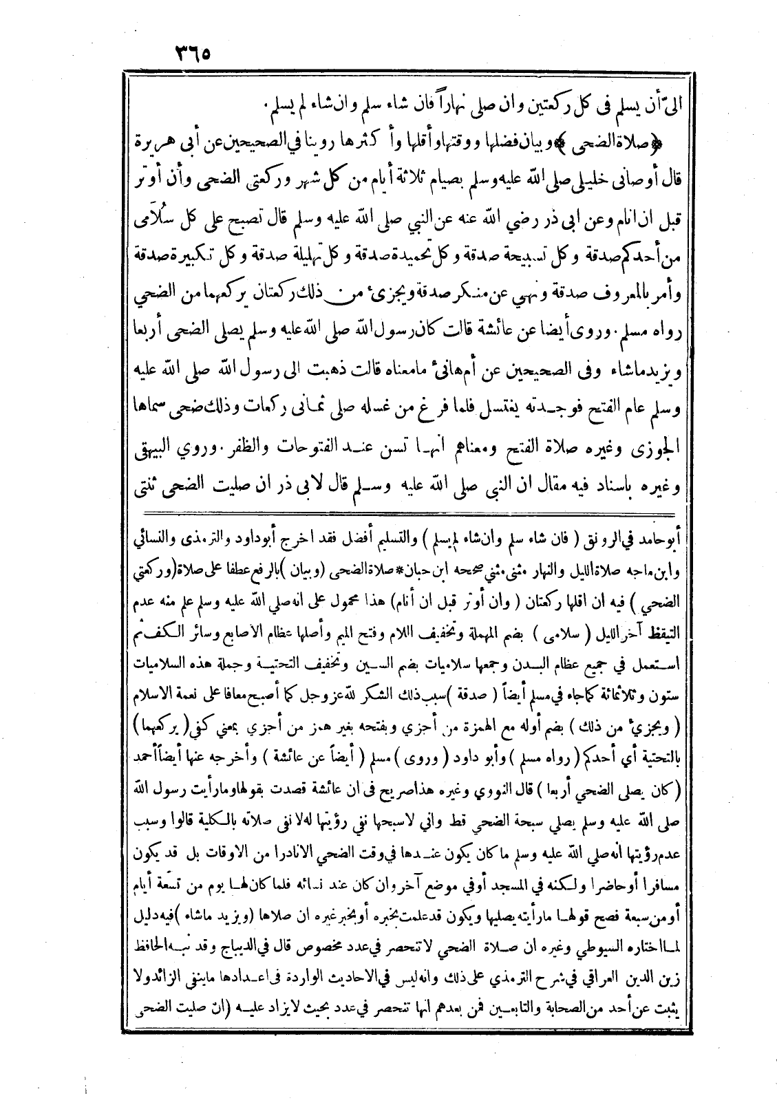 (صلاة الضحى) وبيان فضلها ووقتها وأقلها وأكثرها روينا في الصحيحين عن أبى هريرة قال أوصانى خليلى صلى الله عليه وسلم بصيام ثلاثة أيام من كل شهر وركعتى الضحى وأن أوتر قبل ان انام وعن ابى ذر رضي الله عنه عن النبي صلى الله عليه وسلم قال تصبح على كل سلامى من أحدكم صدقة وكل تسبيحة صدقة وكل تحميدة صدقة وكل تهليلة صدقة وكل تكبيرة صدقة وأمر بالمعروف صدقة ونهي عن منكر صدقة ويجزئ من ذلك ركعتان يركعهما من الضحي رواه مسلم. وروى أيضا عن عائشة قالت كان رسول الله صلى الله عليه وسلم يصلى الضحى أربعا ويزيد ما شاء وفي الصحيحين عن أم هانئ ما معناه قالت ذهبت الى رسول الله صلى الله عليه وسلم عام الفتح فوجدته يغتسل فلما فرغ من غسله صلى ثمانى ركعات وذلك ضحى سماها الجوزى وغيره صلاة الفتح ومعناهم انها تسن عند الفتوحات والظفر. وروي البيهقى وغيره باسناد فيه مقال ان النبى صلى الله عليه وسلم قال لابى ذر ان صليت الضحى ثنتى أبو حامد في الرونق (فان شاء سلم وان شاء لم يسلم) والتسليم أفضل فقد اخرج أبو داود والترمذى والنسائي وابن ماجه صلاة الليل والنهار مثنى مثني صححه ابن حبان* صلاة الضحى (وبيان) بالرفع عطفا على صلاة (وركعتي الضحي) فيه ان اقلها ركعتان (وان أوتر قبل ان أنام) هذا محمول على انه صلى الله عليه وسلم علم منه عدم التيقظ آخر الليل (سلامى) بضم المهملة وتخفيف اللام وفتح الميم وأصلها عظام الاصابع وسائر الكف ثم استعمل في جميع عظام البدن وجمعها سلاميات بضم السين وتخفيف التحتية وجملة هذه السلاميات ستون وثلاثمائة كما جاء في مسلم أيضا (صدقة) سبب ذلك الشكر لله عز وجل كما أصبح معافا على نعمة الاسلام (ويجزيء من ذلك) بضم أوله مع الهمزة من أجزي وبفتحه بغير همز من أجزي بمعنى كفي (يركعهما) بالتحتية أي أحدكم (رواه مسلم) وأبو داود (وروى) مسلم (أيضا عن عائشة) وأخرجه عنها أيضا أحمد (كان يصلى الضحي أربعا) قال النووي وغيره هذا صريح في ان عائشة قصدت بقولها وما رأيت رسول الله صلى الله عليه وسلم يصلي سبحة الضحي قط واني لا سبحها نفي رؤيتها له لا نفي صلاته بالكلية قالوا وسبب عدم رؤيتها انه صلى الله عليه وسلم ما كان يكون عندها في وقت الضحي الا نادرا من الاوقات بل قد يكون مسافرا أو حاضرا ولكنه في المسجد أو في موضع آخر وان كان عند نسائه فلما كان لها يوم من تسعة أيام أو من سبعة فصح قولها ما رأيته يصليها ويكون قد علمت بخبره أو بخبر غيره ان صلاها (ويزيد ما شاء) فيه دليل لما اختاره السيوطي وغيره ان صلاة الضحي لا تنحصر في عدد مخصوص قال في الديباج وقد نبه الحافظ زين الدين العراقي في شرح الترمذي على ذلك وانه ليس في الاحاديث الواردة في اعدادها ما ينفي الزائد ولا يثبت عن أحد من الصحابة والتابعين فمن بعدهم انها تنحصر في عدد بحيث لا يزاد عليه (ان صليت الضحى