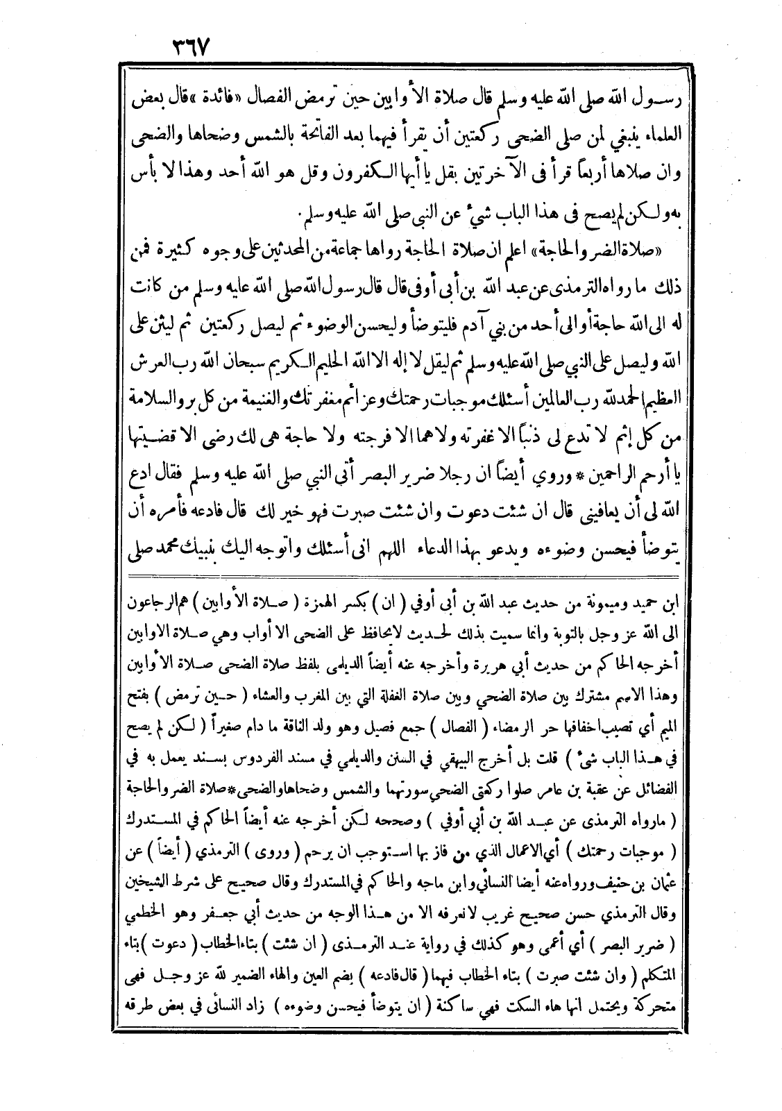 «صلاة الضر والحاجة» اعلم ان صلاة الحاجة رواها جماعة من المحدثين على وجوه كثيرة فمن ذلك ما رواه الترمذى عن عبد الله بن أبى أوفي قال قال رسول الله صلى الله عليه وسلم من كانت له الى الله حاجة أو الى أحد من بني آدم فليتوضأ وليحسن الوضوء ثم ليصل ركعتين ثم ليثن على الله وليصل على النبي صلى الله عليه وسلم ثم ليقل لا إله الا الله الحليم الكريم سبحان الله رب العرش العظيم الحمد لله رب العالمين أسئلك موجبات رحمتك وعزائم مغفرتك والغنيمة من كل بر والسلامة من كل إثم لا تدع لى ذنبا الا غفرته ولا هما الا فرجته ولا حاجة هى لك رضى الا قضيتها يا أرحم الراحمين* وروي أيضا ان رجلا ضرير البصر أتى النبي صلى الله عليه وسلم فقال ادع الله لى أن يعافينى قال ان شئت دعوت وان شئت صبرت فهو خير لك قال فادعه فأمره أن يتوضأ فيحسن وضوءه ويدعو بهذا الدعاء اللهم انى أسئلك واتوجه اليك بنبيك محمد صلى ابن حميد وميمونة من حديث عبد الله بن أبى أوفي (ان) بكسر الهمزة (صلاة الأوابين) هم الرجاعون الى الله عز وجل بالتوبة وانما سميت بذلك لحديث لا يحافظ على الضحى الا أواب وهي صلاة الاوابين أخرجه الحاكم من حديث أبي هريرة وأخرجه عنه أيضا الديلمى بلفظ صلاة الضحى صلاة الأوابين وهذا الاسم مشترك بين صلاة الضحي وبين صلاة الغفلة التي بين المغرب والعشاء (حين ترمض) بفتح الميم أي تصيب اخفافها حر الرمضاء (الفصال) جمع فصيل وهو ولد الناقة ما دام صغيرا (لكن لم يصح في هذا الباب شيء) قلت بل أخرج البيهقي في السنن والديلمي في مسند الفردوس بسند يعمل به في الفضائل عن عقبة بن عامر صلوا ركعتى الضحى سورتهما والشمس وضحاها والضحى* صلاة الضر والحاجة (ما رواه الترمذى عن عبد الله بن أبي أوفي) وصححه لكن أخرجه عنه أيضا الحاكم في المستدرك (موجبات رحمتك) أي الاعمال الذي من فاز بها استوجب ان يرحم (وروى) الترمذي (أيضا) عن عثمان بن حنيف ورواه عنه أيضا النسائي وابن ماجه والحاكم في المستدرك وقال صحيح على شرط الشيخين وقال الترمذي حسن صحيح غريب لا نعرفه الا من هذا الوجه من حديث أبي جعفر وهو الخطمي (ضرير البصر) أي أعمى وهو كذلك في رواية عند الترمذى (ان شئت) بتاء الخطاب (دعوت) بتاء المتكلم (وان شئت صبرت) بتاء الخطاب فيهما (قال فادعه) بضم العين والهاء الضمير لله عز وجل فهى متحركة ويحتمل انها هاء السكت فهي ساكنة (ان يتوضأ فيحسن وضوءه) زاد النسائى في بعض طرقه