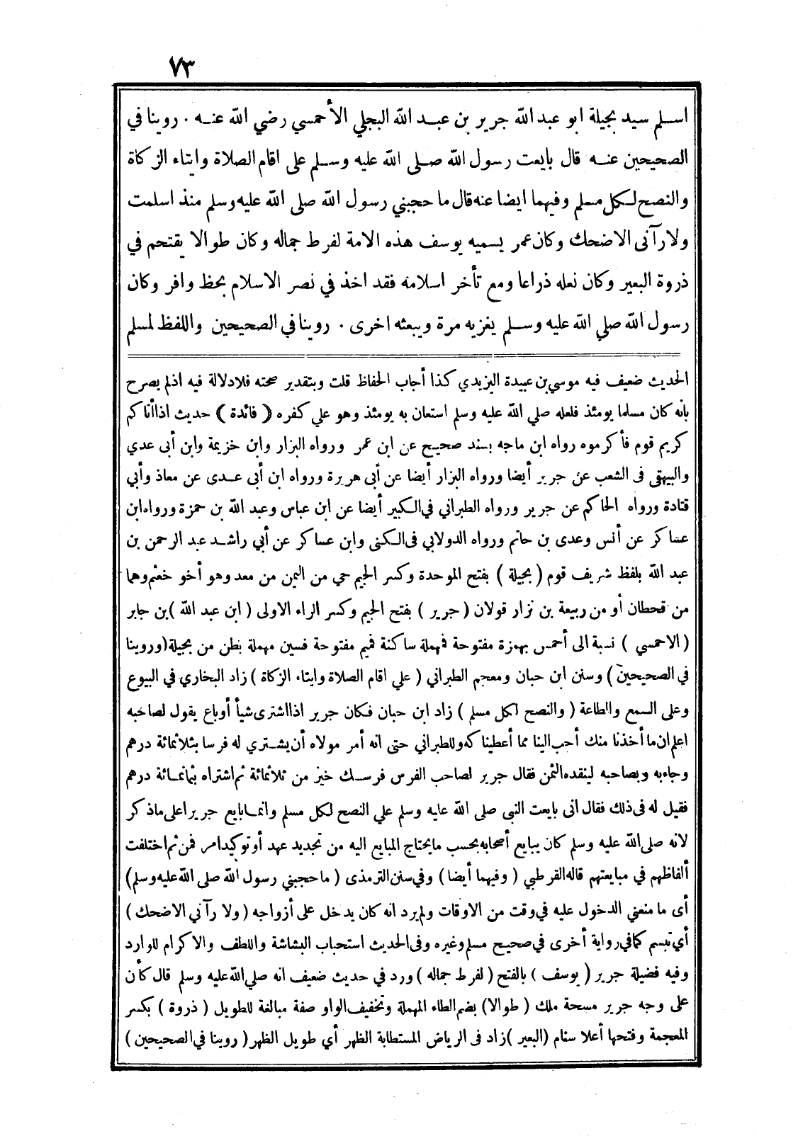 اسلم سيد بجيلة ابو عبد الله جرير بن عبد الله البجلي الأحمسي رضي الله عنه. روينا في الصحيحين عنه قال بايعت رسول الله صلى الله عليه وسلم على اقام الصلاة وايتاء الزكاة والنصح لكل مسلم وفيهما ايضا عنه قال ما حجبني رسول الله صلى الله عليه وسلم منذ اسلمت ولا رآنى الاضحك وكان عمر يسميه يوسف هذه الامة لفرط جماله وكان طوالا يقتحم في ذروة البعير وكان نعله ذراعا ومع تأخر اسلامه فقد اخذ في نصر الاسلام بحظ وافر وكان رسول الله صلى الله عليه وسلم يغزيه مرة ويبعثه اخرى. روينا في الصحيحين واللفظ لمسلم الحديث ضعيف فيه موسي بن عبيدة اليزيدي كذا أجاب الحفاظ قلت وبتقدير صحته فلا دلالة فيه اذ لم يصرح بانه كان مسلما يومئذ فلعله صلى الله عليه وسلم استعان به يومئذ وهو علي كفره (فائدة) حديث اذا أتاكم كريم قوم فأكرموه رواه ابن ماجه بسند صحيح عن ابن عمر ورواه البزار وابن خزيمة وابن أبى عدي والبيهقى في الشعب عن جرير أيضا ورواه البزار أيضا عن أبى هريرة ورواه ابن أبى عدى عن معاذ وأبي قتادة ورواه الحاكم عن جرير ورواه الطبراني في الكبير أيضا عن ابن عباس وعبد الله بن حمزة ورواه ابن عساكر عن أنس وعدى بن حاتم ورواه الدولابي في الكنى وابن عساكر عن أبي راشد عبد الرحمن بن عبد الله بلفظ شريف قوم (بجيلة) بفتح الموحدة وكسر الجيم حي من اليمن من معد وهو أخو خعثم وهما من قحطان أو من ربيعة بن نزار قولان (جرير) بفتح الجيم وكسر الراء الاولى (ابن عبد الله) بن جابر (الاحمسي) نسبة الى أحمس بهمزة مفتوحة فمهملة ساكنة فميم مفتوحة فسين مهملة بظن من بجيلة (وروينا في الصحيحين) وسنن ابن حبان ومعجم الطبراني (علي اقام الصلاة وايتاء الزكاة) زاد البخاري في البيوع وعلى السمع والطاعة (والنصح لكل مسلم) زاد ابن حبان فكان جرير اذا اشترى شيأ أو باع يقول لصاحبه اعلم ان ما أخذنا منك أحب الينا مما أعطيناكه وللطبراني حتى انه أمر مولاه أن يشتري له فرسا بثلاثمائة درهم وجاء به وبصاحبه لينقده الثمن فقال جرير لصاحب الفرس فرسك خير من ثلاثمائة ثم اشتراه بثمانمائة درهم فقيل له في ذلك فقال انى بايعت النبى صلى الله عليه وسلم علي النصح لكل مسلم وانما بايع جريرا على ما ذكر لانه صلى الله عليه وسلم كان يبايع أصحابه بحسب ما يحتاج المبايع اليه من تجديد عهد أو توكيد امر فمن ثم اختلفت ألفاظهم في مبايعتهم قاله القرطبي (وفيهما أيضا) وفي سنن الترمذى (ما حجبني رسول الله صلى الله عليه وسلم) أى ما منعني الدخول عليه في وقت من الاوقات ولم يرد انه كان يدخل على أزواجه (ولا رآني الاضحك) أي تبسم كما في رواية أخرى في صحيح مسلم وغيره وفي الحديث استحباب البشاشة واللطف والاكرام للوارد وفيه فضيلة جرير (يوسف) بالفتح (لفرط جماله) ورد في حديث ضعيف انه صلى الله عليه وسلم قال كان على وجه جرير مسحة ملك (طوالا) بضم الطاء المهملة وتخفيف الواو صفة مبالغة للطويل (ذروة) بكسر المعجمة وفتحها أعلا سنام (البعير) زاد في الرياض المستطابة الظهر أي طويل الظهر (روينا في الصحيحين)