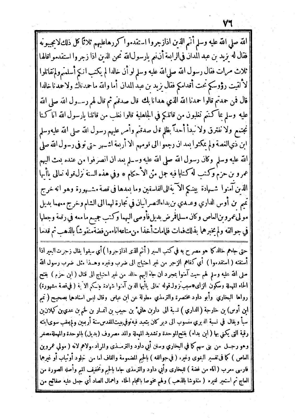 وفي هذه السنة نزل قوله تعالى يا أَيُّهَا الَّذِينَ آمَنُوا شَهادَةُ بَيْنِكُمْ الآية الى الْفاسِقِينَ وما بعدها في قصة مشهورة وهو انه خرج تميم بن أوس الداري وعدي بن بداء النصرانيان في تجارة لهما الى الشام وخرج معهما بديل مولى عمرو بن العاص وكان مسلما فمرض بديل فأوصى اليهما وكتب جميع ما معه في رقعة وجعلها في جوالقه ولم يخبرهما بذلك فمات فلما مات أخذا من متاعه اناء من فضة منقوشا بالذهب ثم قدما حتى جاءهم خالد كما هو مصرح به في كتب السير (أنتم الذى اذا زجروا) أي سيقوا يقال زجرت البعير اذا أستقته (استقدموا) أي كفاهم الزجر من غير احتياج الى ضرب وغيره وهذا مثل ضرب رسول الله صلى الله عليه وسلم لهم حيث آمنوا بمجرد ان جاء اليهم خالد من غير احتياج الى قتال (ابن حزم) بفتح الحاء المهملة وسكون الزاى* سبب نزول قوله تعالى يا أَيُّهَا الَّذِينَ آمَنُوا شَهادَةُ بَيْنِكُمْ الآية (في قصة مشهورة) رواها البخاري وأبو داود مختصرة والترمذي مطولة عن ابن عباس وقال ليس اسنادهما بصحيح (تميم ابن أوس) بن خارجة (الداري) نسبة الى دار بن هانيء بن حبيب بن انمار بن لخم بن عدي بن كهلان بن سبأ ويقال في نسبة الديري منسوب الى دير كان يتعبد فيه توفي ببيت المقدس سنة أربعين ولم يعقب سوى ابنته رقية التى يكني بها (ابن بداء) بفتح الموحدة وتشديد المهملة والمد مصروف (بديل) بالموحدة والمهملة مصغر وهو رجل من بنى سهم كما في البخاري وسنن أبي داود والترمذى والمراد مولاهم لانه (مولي عمرو بن العاص) كما في تفسير البغوى وغيره (في جوالقه) بالجيم المضمومة والقاف اما من جلود أو ثياب أو غيرهما فارسى معرب (اناء من فضة) للبخارى وأبي داود والترمذى جاما بالجيم وتخفيف الميم وأصله الصورة من العاج ثم استعير لغيره (منقوشا بالذهب) ولهم مخوصا باعجام الخاء واهمال الصاد أي جعل عليه صفائح من
