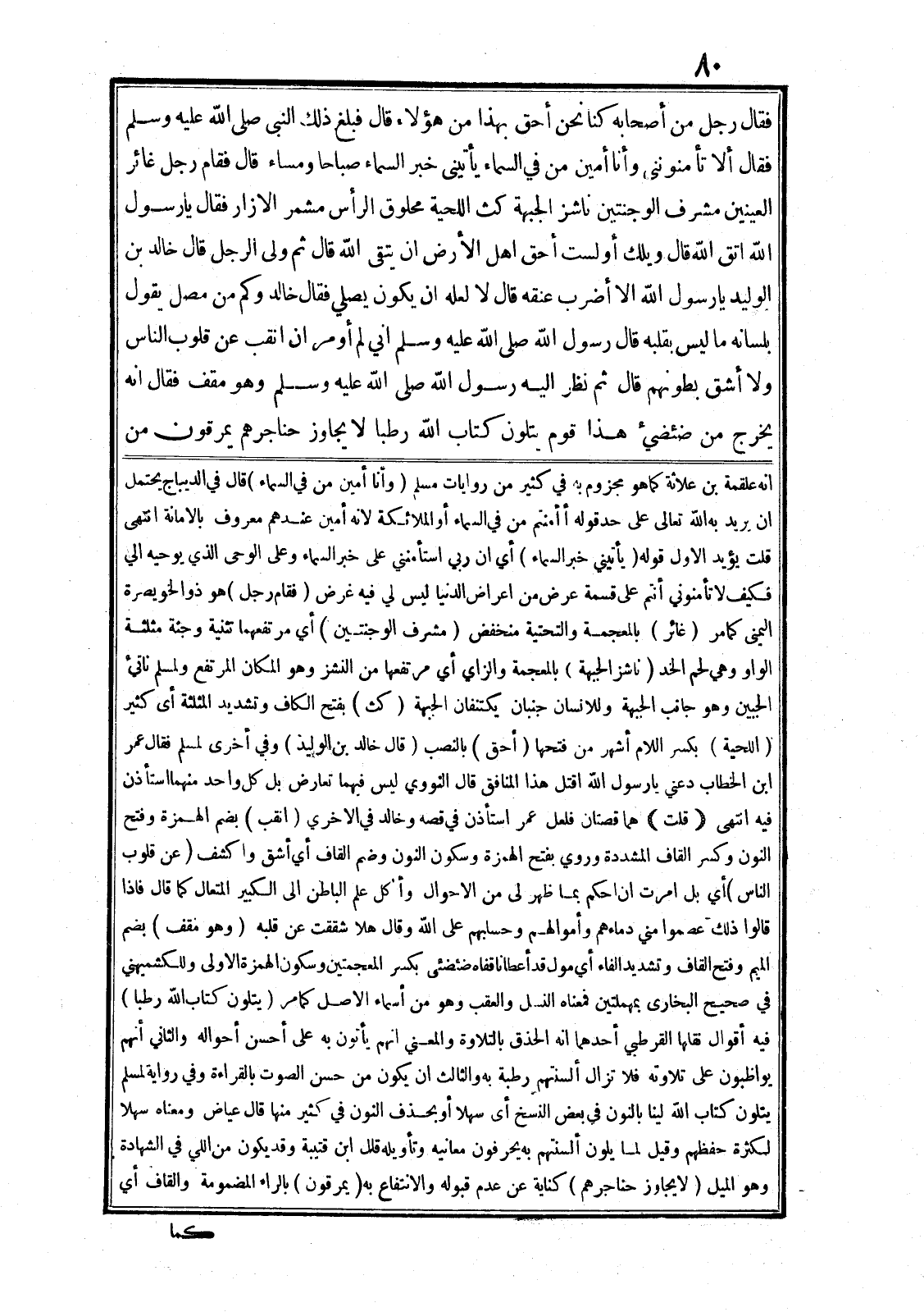 فقال رجل من أصحابه كنا نحن أحق بهذا من هؤلاء قال فبلغ ذلك النبي صلى الله عليه وسلم فقال ألا تأمنوننى وأنا أمين من في السماء يأتينى خبر السماء صباحا ومساء قال فقام رجل غائر العينين مشرف الوجنتين ناشز الجبهة كث اللحية محلوق الرأس مشمر الازار فقال يا رسول الله اتق الله قال ويلك أو لست أحق اهل الأرض ان يتقى الله قال ثم ولى الرجل قال خالد بن الوليد يا رسول الله الا أضرب عنقه قال لا لعله ان يكون يصلي فقال خالد وكم من مصل يقول بلسانه ما ليس بقلبه قال رسول الله صلى الله عليه وسلم اني لم أومر ان انقب عن قلوب الناس ولا أشق بطونهم قال ثم نظر اليه رسول الله صلى الله عليه وسلم وهو مقف فقال انه يخرج من ضئضيء هذا قوم يتلون كتاب الله رطبا لا يجاوز حناجرهم يمرقون من انه علقمة بن علاثة كما هو مجزوم به في كثير من روايات مسلم (وأنا أمين من في السماء) قال في الديباج يحتمل ان يريد به الله تعالى على حد قوله أَأَمِنْتُمْ مَنْ فِي السَّماءِ أو الملائكة لانه أمين عندهم معروف بالامانة انتهى قلت يؤيد الاول قوله (يأتيني خبر السماء) أي ان ربي استأمنني على خبر السماء وعلى الوحى الذي يوحيه الي فكيف لا تأمنوني أنتم على قسمة عرض من اعراض الدنيا ليس لي فيه غرض (فقام رجل) هو ذو الخويصرة اليمنى كما مر (غائر) بالمعجمة والتحتية منخفض (مشرف الوجنتين) أي مرتفعهما تثنية وجنة مثلثة الواو وهي لحم الخد (ناشز الجبهة) بالمعجمة والزاي أي مرتفعها من النشز وهو المكان المرتفع ولمسلم ناتيء الجبين وهو جانب الجبهة وللانسان جنبان يكتنفان الجبهة (كث) بفتح الكاف وتشديد المثلثة أى كثير (اللحية) بكسر اللام أشهر من فتحها (أحق) بالنصب (قال خالد بن الوليد) وفي أخرى لمسلم فقال عمر ابن الخطاب دعني يا رسول الله اقتل هذا المنافق قال النووي ليس فيهما تعارض بل كل واحد منهما استأذن فيه انتهى (قلت) هما قصتان فلعل عمر استأذن في قصه وخالد في الاخري (انقب) بضم الهمزة وفتح النون وكسر القاف المشددة وروي بفتح الهمزة وسكون النون وضم القاف أي أشق واكشف (عن قلوب الناس) أي بل امرت ان احكم بما ظهر لى من الاحوال وأكل علم الباطن الى الكبير المتعال كما قال فاذا قالوا ذلك عصموا مني دماءهم وأموالهم وحسابهم على الله وقال هلا شققت عن قلبه (وهو مقف) بضم الميم وفتح القاف وتشديد الفاء أي مول قد أعطانا قفاه ضئضئى بكسر المعجمتين وسكون الهمزة الاولى وللكشميهني في صحيح البخارى بمهملتين فمعناه النسل والعقب وهو من أسماء الاصل كما مر (يتلون كتاب الله رطبا) فيه أقوال نقلها القرطبي أحدهما انه الحذق بالتلاوة والمعني انهم يأتون به على أحسن أحواله والثاني أنهم يواظبون على تلاوته فلا تزال ألسنتهم رطبة به والثالث ان يكون من حسن الصوت بالقراءة وفي رواية لمسلم يتلون كتاب الله لينا بالنون في بعض النسخ أى سهلا أو بحذف النون في كثير منها قال عياض ومعناه سهلا لكثرة حفظهم وقيل لما يلون ألسنتهم به يحرفون معانيه وتأويله قال ابن قتيبة وقد يكون من اللي في الشهادة وهو الميل (لا يجاوز حناجرهم) كناية عن عدم قبوله والانتفاع به (يمرقون) بالراء المضمومة والقاف أي