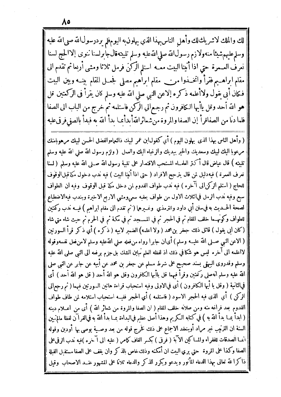 لك والملك لا شريك لك وأهل الناس بهذا الذي يهلون به اليوم فلم يرد رسول الله صلى الله عليه وسلم عليهم شيئا منه ولازم رسول الله صلى الله عليه وسلم تلبيته قال جابر لسناننوى إلا الحج لسنا نعرف العمرة حتى اذا أتينا البيت معه استلم الركن فرمل ثلاثا ومشى أربعا ثم تقدم الى مقام ابراهيم فقرأ واتخذوا من مقام ابراهيم مصلى فجعل المقام بينه وبين البيت فكان أبى يقول ولا أعلمه ذكره إلا عن النبي صلى الله عليه وسلم كان يقرأ في الركعتين قل هو الله أحد وقل يا أيها الكافرون ثم رجع الى الركن فاستلمه ثم خرج من الباب الى الصفا فلما دنا من الصفا قرأ إن الصفا والمروة من شعائر الله أبد أبما بدأ الله به فبدأ بالصفي فرقى عليه (وأهل الناس بهذا الذى يهلون اليوم) أي كقول ابن عمر لبيك ذا النعماء والفضل الحسن لبيك مرهوبا منك مرعوبا اليك لبيك وسعديك والخير بيديك والرغباء اليك والعمل (ولزم رسول الله صلى الله عليه وسلم تلبيته) قال عياض قال أكثر العلماء المستحب الاقتصار على تلبية رسول الله صلى الله عليه وسلم (لسنا نعرف العمرة) فيه دليل لمن قال يترجح الافراد (حتى اذا أتينا البيت) فيه ندب دخول مكة قبل الوقوف للحاج (استلم الركن الى آخره) فيه ندب طواف القدوم لمن دخل مكة قبل الوقوف وفيه ان الطواف سبع وفيه ندب الرمل في الثلاث الاول من طواف يعقبه سعي ومشي الاربع الاخيرة ويندب فيه الاضطباع لصحة الحديث به في سنن أبي داود والترمذي وغيرهما (ثم تقدم الى مقام ابراهيم) فيه ندب ركعتين للطواف وكونهما خلف المقام ثم في الحجر ثم في المسجد ثم في مكة ثم في الحرم ثم حيث شاء متي شاء (كان ابى يقول) قائل ذلك جعفر بن محمد (ولا اعلمه) الضمير لابيه (ذكره) أي ذكر قرأ السورتين (الا عن النبي صلى الله عليه وسلم) أى ان جابرا رواه من فعله صلى الله عليه وسلم لا من فعل نفسه وقوله لا اعلمه الى آخره ليس هو شكا في ذلك اذ لفظه العلم تباين الشك بل جزم برفعه الى النبى صلى الله عليه وسلم وقد روى البيهقى بسند صحيح على شرط مسلم عن جعفر بن محمد عن أبيه عن جابر عن النبي صلى الله عليه وسلم انه صلى ركعتين وقرأ فيهما قُلْ يا أَيُّهَا الْكافِرُونَ وقُلْ هُوَ اللَّهُ أَحَدٌ (قُلْ هُوَ اللَّهُ أَحَدٌ) أى في الثانية (قُلْ يا أَيُّهَا الْكافِرُونَ) أى في الاولى وفيه استحباب قراءة هاتين السورتين فيهما (ثم رجع الى الركن) أي الذى فيه الحجر الاسود (فاستلمه) أي الحجر ففيه استحباب استلامه لمن طاف طواف القدوم بعد فراغه منه ومن صلاته خلف المقام (إِنَّ الصَّفا وَالْمَرْوَةَ مِنْ شَعائِرِ اللَّهِ) أي من اعلام دينه (ابدأ بما بدأ الله به) في كتابه الكريم وهذا أصل عظيم في البداءة بما بدأ الله به في القرآن لفظا ما لم تبين السنة ان الترتيب غير مراد أو ينعقد الاجماع على ذلك فخرج قوله مِنْ بَعْدِ وَصِيَّةٍ يُوصِي بِها أَوْ دَيْنٍ وقوله إِنَّمَا الصَّدَقاتُ لِلْفُقَراءِ وَالْمَساكِينِ الآية (فرقى) بكسر القاف كما مر (عليه الى آخره) فيه ندب الرقى على الصفا وكذا على المروة حتى يري البيت ان أمكنه وذلك خاص بالذكر وان يقف على الصفا مستقبل القبلة ذاكر الله تعالى بهذا الدعاء المأثور ويدعو ويكرر الذكر والدعاء ثلاثا على المشهور عند الاصحاب وقيل