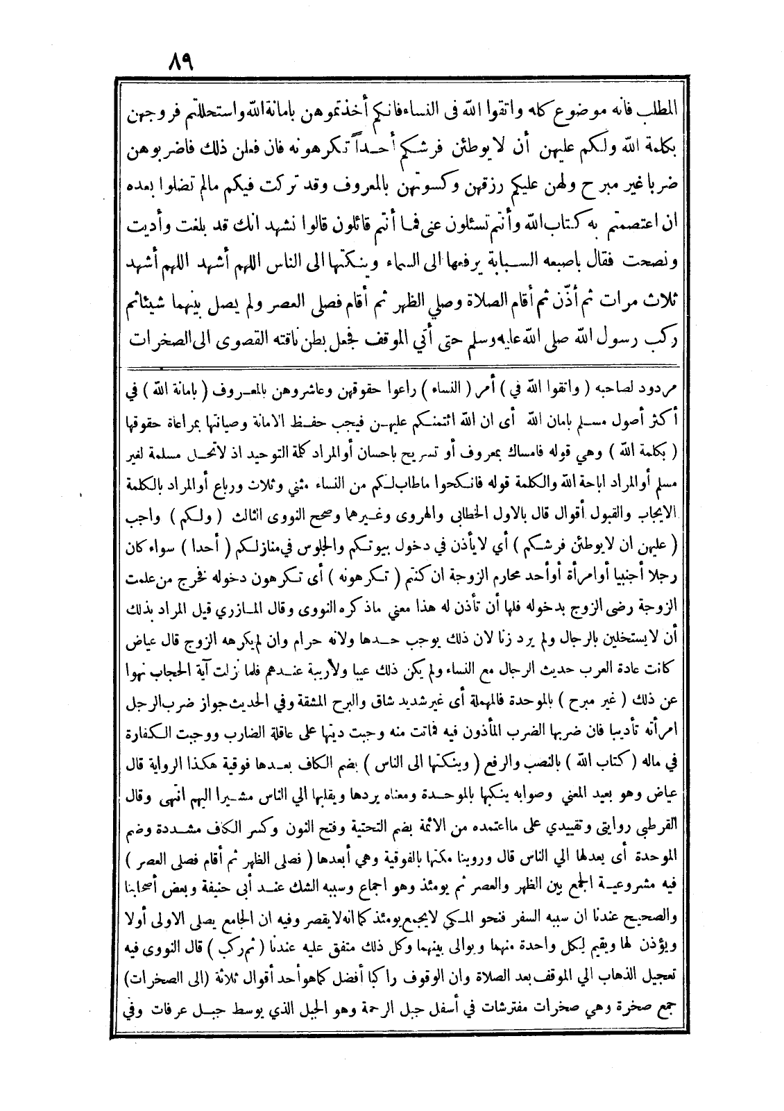 المطلب فانه موضوع كله واتقوا الله في النساء فانكم أخذتموهن بامانة الله واستحللتم فروجهن بكلمة الله ولكم عليهن أن لا يوطئن فرشكم أحدا تكرهونه فان فعلن ذلك فاضربوهن ضربا غير مبرح ولهن عليكم رزقهن وكسوتهن بالمعروف وقد تركت فيكم ما لم تضلوا بعده ان اعتصمتم به كتاب الله وأنتم تسئلون عنى فما أنتم قائلون قالوا نشهد انك قد بلغت وأديت ونصحت فقال باصبعه السبابة يرفعها الى السماء وينكتها الى الناس اللهم أشهد اللهم أشهد ثلاث مرات ثم أذّن ثم أقام الصلاة وصلى الظهر ثم أقام فصلى العصر ولم يصل بينهما شيئا ثم ركب رسول الله صلى الله عليه وسلم حتى أتي الموقف فجعل بطن ناقته القصوى الى الصخرات مردود لصاحبه (واتقوا الله في) أمر (النساء) راعوا حقوقهن وعاشروهن بالمعروف (بامانة الله) في أكثر أصول مسلم بامان الله أى ان الله ائتمنكم عليهن فيجب حفظ الامانة وصيانتها بمراعاة حقوقها (بكلمة الله) وهي قوله فَإِمْساكٌ بِمَعْرُوفٍ أَوْ تَسْرِيحٌ بِإِحْسانٍ أو المراد كلمة التوحيد اذ لا تحل مسلمة لغير مسلم أو المراد اباحة الله والكلمة قوله فَانْكِحُوا ما طابَ لَكُمْ مِنَ النِّساءِ مَثْنى وَثُلاثَ وَرُباعَ أو المراد بالكلمة الايجاب والقبول أقوال قال بالاول الخطابى والهروى وغيرهما وصحح النووى الثالث (ولكم) واجب (عليهن ان لا يوطئن فرشكم) أي لا يأذن في دخول بيوتكم والجلوس في منازلكم (أحدا) سواء كان رجلا أجنبيا أو امرأة أو أحد محارم الزوجة ان كنتم (تكرهونه) أى تكرهون دخوله فخرج من علمت الزوجة رضى الزوج بدخوله فلها أن تأذن له هذا معني ما ذكره النووى وقال المازري قيل المراد بذلك أن لا يستخلين بالرجال ولم يرد زنا لان ذلك يوجب حدها ولانه حرام وان لم يكرهه الزوج قال عياض كانت عادة العرب حديث الرجال مع النساء ولم يكن ذلك عيبا ولا ريبة عندهم فلما نزلت آية الحجاب نهوا عن ذلك (غير مبرح) بالموحدة فالمهملة أى غير شديد شاق والبرح المشقة وفي الحديث جواز ضرب الرجل امرأته تأديبا فان ضربها الضرب المأذون فيه فماتت منه وجبت ديتها على عاقلة الضارب ووجبت الكفارة في ماله (كتاب الله) بالنصب والرفع (وينكتها الى الناس) بضم الكاف بعدها فوقية هكذا الرواية قال عياض وهو بعيد المعني وصوابه ينكبها بالموحدة ومعناه يردها ويقلبها الي الناس مشيرا اليهم انتهى وقال القرطبى روايتى وتقييدي على ما اعتمده من الائمة بضم التحتية وفتح النون وكسر الكاف مشددة وضم الموحدة أى يعدلها الي الناس قال وروينا مكتها بالفوقية وهي أبعدها (فصلى الظهر ثم أقام فصلى العصر) فيه مشروعية الجمع بين الظهر والعصر ثم يومئذ وهو اجماع وسببه الشك عند أبى حنيفة وبعض أصحابنا والصحيح عندنا ان سببه السفر فنحو المكي لا يجمع يومئذ كما انه لا يقصر وفيه ان الجامع يصلى الاولى أولا ويؤذن لها ويقيم لكل واحدة منهما ويوالى بينهما وكل ذلك متفق عليه عندنا (ثم ركب) قال النووى فيه تعجيل الذهاب الي الموقف بعد الصلاة وان الوقوف راكبا أفضل كما هو أحد أقوال ثلاثة (الى الصخرات) جمع صخرة وهي صخرات مفترشات في أسفل جبل الرحمة وهو الجبل الذي يوسط جبل عرفات وفي