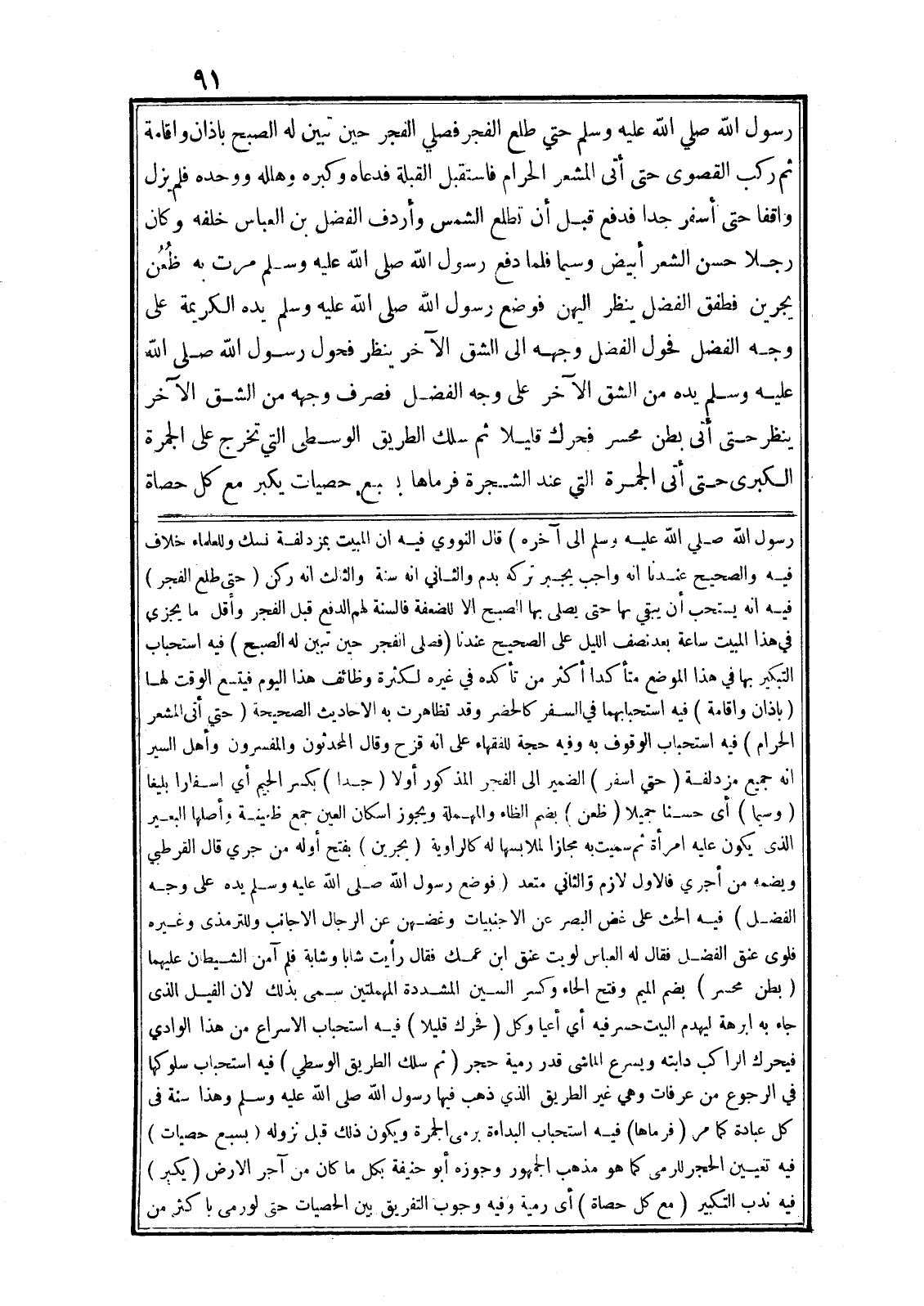 رسول الله صلى الله عليه وسلم حتى طلع الفجر فصلي الفجر حين تبين له الصبح باذان واقامة ثم ركب القصوى حتى أتى المشعر الحرام فاستقبل القبلة فدعاه وكبره وهلله ووحده فلم يزل واقفا حتى أسفر جدا فدفع قبل أن تطلع الشمس وأردف الفضل بن العباس خلفه وكان رجلا حسن الشعر أبيض وسيما فلما دفع رسول الله صلى الله عليه وسلم مرت به ظعن يجرين فطفق الفضل ينظر اليهن فوضع رسول الله صلى الله عليه وسلم يده الكريمة على وجه الفضل فحول الفضل وجهه الى الشق الآخر ينظر فحول رسول الله صلى الله عليه وسلم يده من الشق الآخر على وجه الفضل فصرف وجهه من الشق الآخر ينظر حتى أتى بطن محسر فحرك قليلا ثم سلك الطريق الوسطى التي تخرج على الجمرة الكبرى حتى أتى الجمرة التي عند الشجرة فرماها بسبع حصيات يكبر مع كل حصاة رسول الله صلى الله عليه وسلم الى آخره) قال النووي فيه ان المبيت بمزدلفة نسك وللعلماء خلاف فيه والصحيح عندنا انه واجب يجبر تركه بدم والثاني انه سنة والثالث انه ركن (حتى طلع الفجر) فيه انه يستحب أن يبقي بها حتى يصلى بها الصبح الا للضعفة فالسنة لهم الدفع قبل الفجر وأقل ما يجزي في هذا المبيت ساعة بعد نصف الليل على الصحيح عندنا (فصلى الفجر حين تبين له الصبح) فيه استحباب التبكير بها في هذا الموضع متأكدا أكثر من تأكده في غيره لكثرة وظائف هذا اليوم فيتسع الوقت لها (باذان واقامة) فيه استحبابهما في السفر كالحضر وقد تظاهرت به الاحاديث الصحيحة (حتى أتى المشعر الحرام) فيه استحباب الوقوف به وفيه حجة للفقهاء على انه قزح وقال المحدثون والمفسرون وأهل السير انه جميع مزدلفة (حتى اسفر) الضمير الى الفجر المذكور أولا (جدا) بكسر الجيم أي اسفارا بليغا (وسيما) أى حسنا جميلا (ظعن) بضم الظاء والمهملة ويجوز اسكان العين جمع ظعينة وأصلها البعير الذى يكون عليه امرأة ثم سميت به مجازا لملابسها له كالراوية (يجرين) بفتح أوله من جري قال القرطبي ويضمه من أجري فالاول لازم والثاني متعد (فوضع رسول الله صلى الله عليه وسلم يده على وجه الفضل) فيه الحث على غض البصر عن الاجنبيات وغضهن عن الرجال الاجانب وللترمذى وغيره فلوى عنق الفضل فقال له العباس لويت عنق ابن عمك فقال رأيت شابا وشابة فلم آمن الشيطان عليهما (بطن محسر) بضم الميم وفتح الحاء وكسر السين المشددة المهملتين سمى بذلك لان الفيل الذى جاء به ابرهة ليهدم البيت حسر فيه أي أعيا وكل (فحرك قليلا) فيه استحباب الاسراع من هذا الوادي فيحرك الراكب دابته ويسرع الماشى قدر رمية حجر (ثم سلك الطريق الوسطي) فيه استحباب سلوكها في الرجوع من عرفات وهي غير الطريق الذي ذهب فيها رسول الله صلى الله عليه وسلم وهذا سنة في كل عبادة كما مر (فرماها) فيه استحباب البداءة برمى الجمرة ويكون ذلك قبل نزوله (بسبع حصيات) فيه تعيين الحجر للرمى كما هو مذهب الجمهور وجوزه أبو حنيفة بكل ما كان من آجر الارض (يكبر) فيه ندب التكبير (مع كل حصاة) أى رمية وفيه وجوب التفريق بين الحصيات حتى لورمى باكثر من