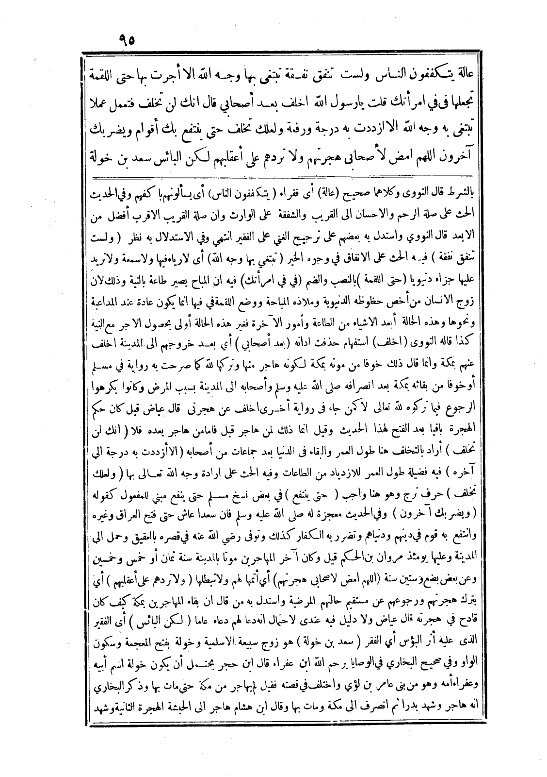 عالة يتكففون الناس ولست تنفق نفقة تبتغى بها وجه الله الا أجرت بها حتى اللقمة تجعلها في في امرأتك قلت يا رسول الله اخلف بعد أصحابي قال انك لن تخلف فتعمل عملا تبتغى به وجه الله الا ازددت به درجة ورفعة ولعلك تخلف حتى ينتفع بك أقوام ويضربك آخرون اللهم امض لأصحابى هجرتهم ولا تردهم على أعقابهم لكن البائس سعد بن خولة بالشرط قال النووى وكلاهما صحيح (عالة) أي فقراء (يتكففون الناس) أي يسألونهم باكفهم وفي الحديث الحث على صلة الرحم والاحسان الى القريب والشفقة على الوارث وان صلة القريب الاقرب أفضل من الابعد قال النووي واستدل به بعضهم على ترجيح الغني على الفقير انتهي وفي الاستدلال به نظر (ولست تنفق نفقة) فيه الحث على الانفاق في وجوه الخير (تبتغي بها وجه الله) أي لا رياء فيها ولا سمعة ولا تريد عليها جزاء دنيويا (حتى اللقمة) بالنصب والضم (في في امرأتك) فيه ان المباح يصير طاعة بالنية وذلك لان زوج الانسان من أخص حظوظه الدنيوية وملاذه المباحة ووضع اللقمة في فيها انما يكون عادة عند المداعبة ونحوها وهذه الحالة أبعد الاشياء من الطاعة وأمور الآخرة فغير هذه الحالة أولى بحصول الاجر مع النية كذا قاله النووى (اخلف) استفهام حذفت ادانه (بعد أصحابي) أي بعد خروجهم الى المدينة اخلف عنهم بمكة وانما قال ذلك خوفا من موته بمكة لكونه هاجر منها وتركها لله كما صرحت به رواية في مسلم أو خوفا من بقائه بمكة بعد انصرافه صلى الله عليه وسلم وأصحابه الى المدينة بسبب المرض وكانوا يكرهوا الرجوع فيما تركوه لله تعالى لا كمن جاء في رواية أخرى اخلف عن هجرتى قال عياض قيل كان حكم الهجرة باقيا بعد الفتح لهذا الحديث وقيل انما ذلك لمن هاجر قبل فاما من هاجر يعده فلا (انك لن تخلف) أراد بالتخلف هنا طول العمر والبقاء في الدنيا بعد جماعات من أصحابه (الا أزددت به درجة الى آخره) فيه فضيلة طول العمر للازدياد من الطاعات وفيه الحث على ارادة وجه الله تعالى بها (ولعلك تخلف) حرف ترج وهو هنا واجب (حتى ينتفع) في بعض نسخ مسلم حتى ينفع مبني للمفعول كقوله (ويضربك آخرون) وفي الحديث معجزة له صلى الله عليه وسلم فان سعدا عاش حتى فتح العراق وغيره وانتفع به قوم في دينهم ودنياهم وتضرر به الكفار كذلك وتوفي رضي الله عنه في قصره بالعقيق وحمل الى المدينة وعليها يومئذ مروان بن الحكم قيل وكان آخر المهاجرين موتا بالمدينة سنة ثمان أو خمس وخمسين وعن بعض بضع وستين سنة (اللهم امض لاصحابى هجرتهم) أي أتمها لهم ولا تبطلها (ولا تردهم على أعقابهم) أي بترك هجرتهم ورجوعهم عن مستقيم حالتهم المرضية واستدل به من قال ان بقاء المهاجرين بمكة كيف كان قادح في هجرته قال عياض ولا دليل فيه عندى لاحتمال انه دعا لهم دعاء عاما (لكن البائس) أى الفقير الذى عليه أثر البؤس أي الفقر (سعد بن خولة) هو زوج سبيعة الا سليمة وخولة بفتح المعجمة وسكون الواو وفي صحيح البخاري في الوصايا يرحم الله ابن عفراء قال ابن حجر يحتمل أن يكون خولة اسم أبيه وعفراء أمه وهو من بنى عامر بن لؤي واختلف في قصته فقيل لم يهاجر من مكة حتى مات بها وذكر البخاري انه هاجر وشهد بدرا ثم انصرف الى مكة ومات بها وقال ابن هشام هاجر الى الحبشة الهجرة الثانية وشهد