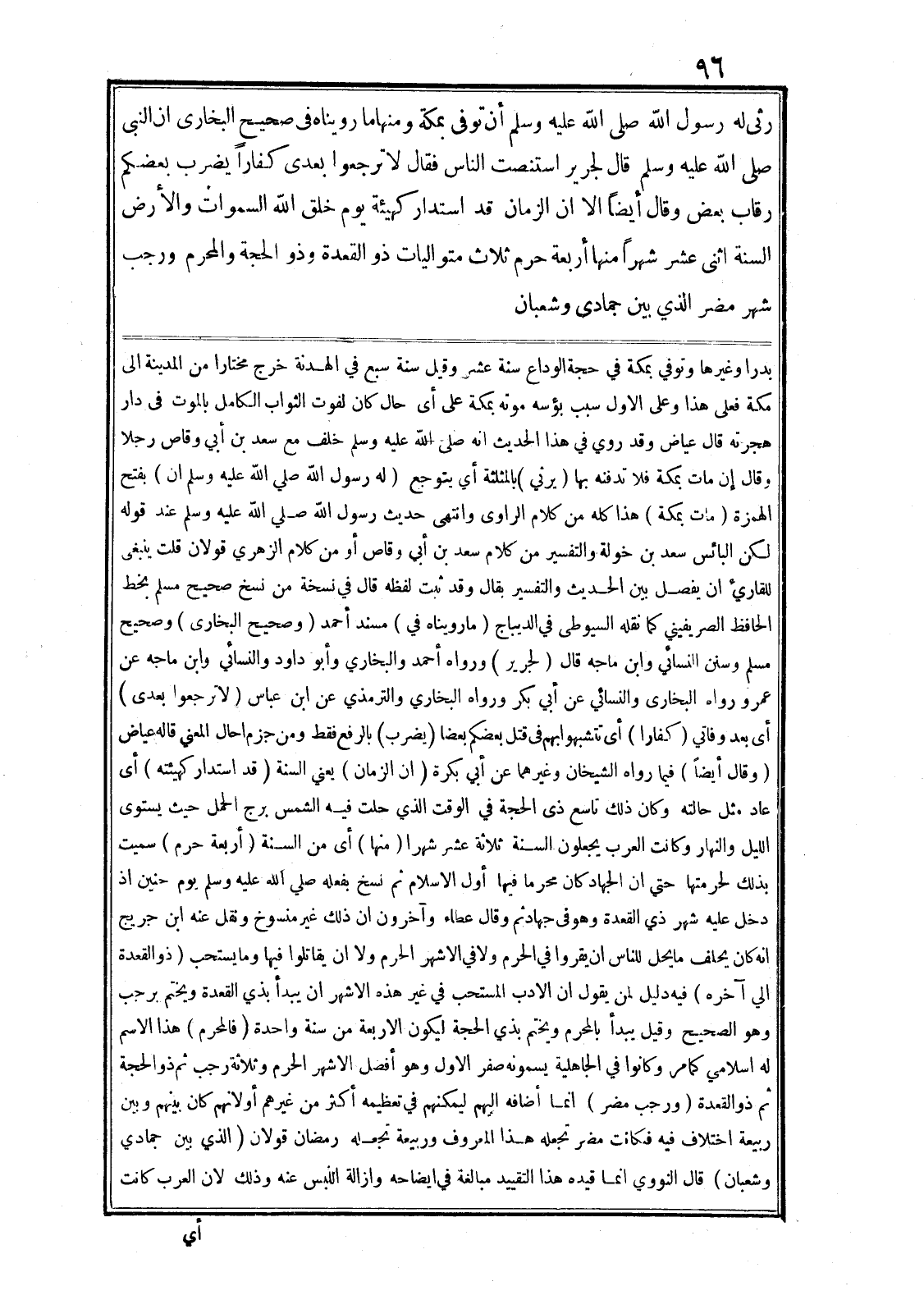 رثى له رسول الله صلى الله عليه وسلم أن توفي بمكة ومنها ما رويناه في صحيح البخارى ان النبى صلى الله عليه وسلم قال لجرير استنصت الناس فقال لا ترجعوا بعدى كفارا يضرب بعضكم رقاب بعض وقال أيضا الا ان الزمان قد استدار كهيئة يوم خلق الله السموات والأرض السنة اثنى عشر شهرا منها أربعة حرم ثلاث متواليات ذو القعدة وذو الحجة والمحرم ورجب شهر مضر الذي بين جمادى وشعبان بدرا وغيرها وتوفي بمكة في حجة الوداع سنة عشر وقيل سنة سبع في الهدنة خرج مختارا من المدينة الى مكة فعلى هذا وعلى الاول سبب بؤسه موته بمكة على أى حال كان لفوت الثواب الكامل بالموت في دار هجرته قال عياض وقد روي في هذا الحديث انه صلى الله عليه وسلم خلف مع سعد بن أبي وقاص رجلا وقال إن مات بمكة فلا تدفنه بها (يرني) بالمثلثة أي يتوجع (له رسول الله صلى الله عليه وسلم ان) بفتح الهمزة (مات بمكة) هذا كله من كلام الراوى وانتهى حديث رسول الله صلى الله عليه وسلم عند قوله لكن البائس سعد بن خولة والتفسير من كلام سعد بن أبي وقاص أو من كلام الزهري قولان قلت ينبغى للقاريء ان يفصل بين الحديث والتفسير بقال وقد ثبت لفظه قال في نسخة من نسخ صحيح مسلم بخط الحافظ الصريفيني كما نقله السيوطى في الديباج (ما رويناه في) مسند أحمد (وصحيح البخارى) وصحيح مسلم وسنن النسائي وابن ماجه قال (لجرير) ورواه أحمد والبخاري وأبو داود والنسائي وابن ماجه عن عمرو رواه البخارى والنسائي عن أبي بكر ورواه البخاري والترمذي عن ابن عباس (لا ترجعوا بعدى) أى بعد وفاتي (كفارا) أى تتشبهوا بهم في قتل بعضكم بعضا (يضرب) بالرفع فقط ومن جزم احال المعني قاله عياض (وقال أيضا) فيما رواه الشيخان وغيرهما عن أبي بكرة (ان الزمان) يعني السنة (قد استدار كهيئته) أى عاد مثل حالته وكان ذلك تاسع ذى الحجة في الوقت الذي حلت فيه الشمس برج الحمل حيث يستوى الليل والنهار وكانت العرب يجعلون السنة ثلاثة عشر شهرا (منها) أى من السنة (أربعة حرم) سميت بذلك لحرمتها حتى ان الجهاد كان محرما فيها أول الاسلام ثم نسخ بفعله صلى الله عليه وسلم يوم حنين اذ دخل عليه شهر ذي القعدة وهو في جهاد ثم وقال عطاء وآخرون ان ذلك غير منسوخ ونقل عنه ابن جريج انه كان يحلف ما يحل للناس ان يقروا في الحرم ولا في الاشهر الحرم ولا ان يقاتلوا فيها وما يستحب (ذو القعدة الي آخره) فيه دليل لمن يقول ان الادب المستحب في غير هذه الاشهر ان يبدأ بذي القعدة ويختم برجب وهو الصحيح وقيل يبدأ بالمحرم ويختم بذي الحجة ليكون الاربعة من سنة واحدة (فالمحرم) هذا الاسم له اسلامي كما مر وكانوا في الجاهلية يسمونه صفر الاول وهو أفضل الاشهر الحرم وثلاثة رجب ثم ذو الحجة ثم ذو القعدة (ورجب مضر) انما أضافه اليهم ليمكنهم في تعظيمه أكثر من غيرهم أو لانهم كان بينهم وبين ربيعة اختلاف فيه فكانت مضر تجعله هذا المعروف وربيعة تجعله رمضان قولان (الذي بين جمادي وشعبان) قال النووي انما قيده هذا التقييد مبالغة في ايضاحه وازالة اللبس عنه وذلك لان العرب كانت