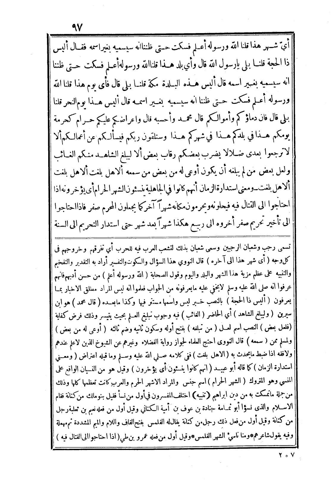 أيّ شهر هذا قلنا الله ورسوله أعلم فسكت حتى ظننا انه سيسميه بغير اسمه فقال أليس ذا الحجة قلنا بلى يا رسول الله قال وأي بلد هذا قلنا الله ورسوله أعلم فسكت حتى ظننا انه سيسميه بغير اسمه قال أليس هذه البلدة مكة قلنا بلى قال فأى يوم هذا قلنا الله ورسوله أعلم فسكت حتى ظننا انه سيسميه بغير اسمه قال أليس هذا يوم النحر قلنا بلى قال فان دماؤكم وأموالكم قال محمد وأحسبه قال واعراضكم عليكم حرام كحرمة يومكم هذا في بلدكم هذا في شهركم هذا وستلقون ربكم فيسألكم عن أعمالكم ألا لا ترجعوا بعدى ضلالا يضرب بعضكم رقاب بعض ألا ليبلغ الشاهد منكم الغائب ولعل بعض من لم يبلغه أن يكون أوعى له من بعض من سمعه ألا هل بلغت ألا هل بلغت ألا هل بلغت- ومعنى استدارة الزمان أنهم كانوا في الجاهلية ينسئون الشهر الحرام أى يؤخرونه اذا احتاجوا الى القتال فيه فيحلونه ويحرمون مكانه شهرا آخركما يجعلون المحرم صفر فاذا احتاجوا الى تأخير تحريم صفر أخروه الى ربيع هكذا شهرا بعد شهر حتى استدار التحريم الى السنة تسمى رجب وشعبان الرجبين وسمى شعبان بذلك نتشعب العرب فيه للحرب أي تفرقهم وخروجهم في كل وجه (أى شهر هذا الى آخره) قال النووي هذا السؤال والسكوت والتفسير أراد به التقدير والتفخيم والتنبيه على عظم مزية هذا الشهر والبلد واليوم وقول الصحابة (الله ورسوله أعلم) من حسن أدبهم فانهم عرفوا انه صلى الله عليه وسلم لا يخفي عليه ما يعرفونه من الجواب فعلموا انه ليس المراد مطلق الاخبار بما يعرفون (أليس ذا الحجة) بالنصب خبر ليس واسمها مستتر فيها وكذا ما بعده (قال محمد) هو ابن سيرين (وليبلغ الشاهد) أي الحاضر (الغائب) فيه وجوب تبليغ العلم بحيث يتيسر وذلك فرض كفاية (فلعل بعض) النصب اسم لعل (من تبلغه) بفتح أوله وسكون ثانيه وضم ثالثه (أوعى له من بعض) ولمسلم ممن (سمعه) قال النووى احتج العلماء لجواز رواية الفضلاء وغيرهم عن الشيوخ الذين لا علم عندهم ولا فقه اذا ضبط ما يحدث به (الاهل بلغت) ففي كلامه صلى الله عليه وسلم وما قبله اعتراض (ومعني استدارة الزمان) كما قاله أبو عبيد (انهم كانوا ينسئون أى يؤخرون) وقيل هو من النسيان الواقع على المنسي وهو المتروك (الشهر الحرام) اسم جنس والمراد الاشهر الحرم والعرب كانت تعظمها كلها وذلك من جملة ما تمسكت به من دين ابراهيم (تنبيه) اختلف المفسرون في أول من نسأ فقيل بنو مالك من كنانة فقام الاسلام والذى نسؤا أبو ثمامة جنادة بن عوف بن أمية الكناني وقيل أول من فعله نعيم بن ثعلبة رجل من كنانة وقيل أول من فعل ذلك رجل من كنانة يقال له القلمس بفتح القاف واللام والميم المشددة ثم مهملة وفيه يقول شاعرهم* ومنا ناسيء الشهر القلمس* وقيل أول من فعله عمرو بن طي (اذا احتاجوا الى القتال فيه)