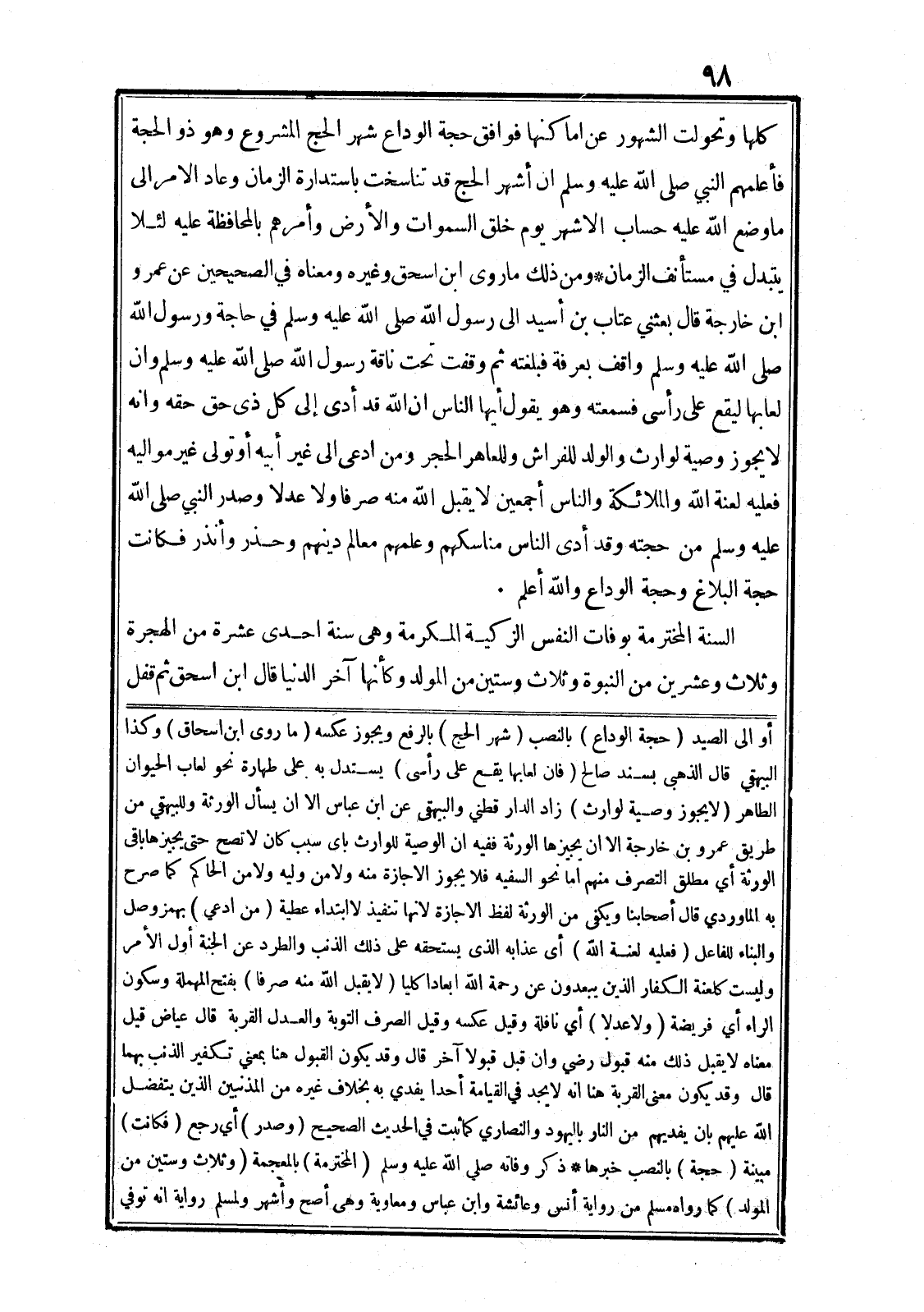 السنة المخترمة بوفات النفس الزكية المكرمة وهى سنة احدى عشرة من الهجرة وثلاث وعشرين من النبوة وثلاث وستين من المولد وكأنها آخر الدنيا قال ابن اسحق ثم قفل أو الى الصيد (حجة الوداع) بالنصب (شهر الحج) بالرفع ويجوز عكسه (ما روى ابن اسحاق) وكذا البيهقي قال الذهبي بسند صالح (فان لعابها يقع على رأسى) يستدل به على طهارة نحو لعاب الحيوان الطاهر (لا يجوز وصية لوارث) زاد الدارقطني والبيهقى عن ابن عباس الا ان يسأل الورثة وللبيهقي من طريق عمرو بن خارجة الا ان يجيزها الورثة ففيه ان الوصية للوارث باى سبب كان لا تصح حتى يجيزها باقى الورثة أي مطلق التصرف منهم اما نحو السفيه فلا يجوز الاجازة منه ولا من وليه ولا من الحاكم كما صرح به الماوردي قال أصحابنا ويكفي من الورثة لفظ الاجازة لانها تنفيذ لا ابتداء عطية (من ادعي) بهمز وصل والبناء للفاعل (فعليه لعنة الله) أى عذابه الذى يستحقه على ذلك الذنب والطرد عن الجنة أول الأمر وليست كلعنة الكفار الذين يبعدون عن رحمة الله ابعادا كليا (لا يقبل الله منه صرفا) بفتح المهملة وسكون الراء أي فريضة (ولا عدلا) أي نافلة وقيل عكسه وقيل الصرف التوبة والعدل القربة قال عياض قيل معناه لا يقبل ذلك منه قبول رضي وان قبل قبولا آخر قال وقد يكون القبول هنا بمعني تكفير الذنب بهما قال وقد يكون معنى القربة هنا انه لا يجد في القيامة أحدا يفدي به بخلاف غيره من المذنبين الذين يتفضل الله عليهم بان يفديهم من النار باليهود والنصاري كما ثبت في الحديث الصحيح (وصدر) أي رجع (فكانت) مبينة (حجة) بالنصب خبرها* ذكر وفاته صلى الله عليه وسلم (المخترمة) بالمعجمة (وثلاث وستين من المولد) كما رواه مسلم من رواية أنس وعائشة وابن عباس ومعاوية وهى أصح وأشهر ولمسلم رواية انه توفي
