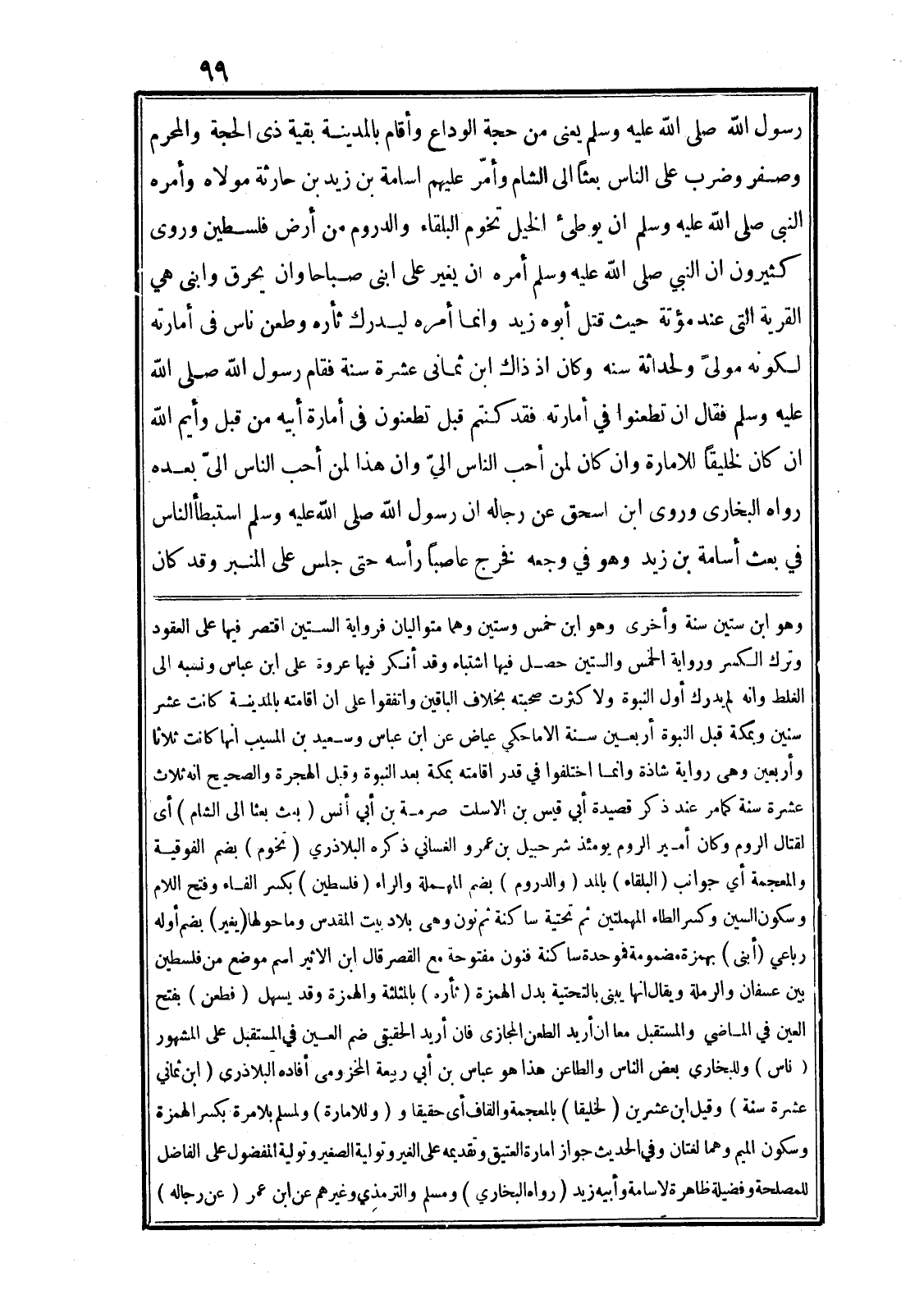 رواه البخارى وروى ابن اسحق عن رجاله ان رسول الله صلى الله عليه وسلم استبطأ الناس في بعث أسامة بن زيد وهو في وجعه فخرج عاصبا رأسه حتى جلس على المنبر وقد كان وهو ابن ستين سنة وأخرى وهو ابن خمس وستين وهما متواليان فرواية الستين اقتصر فيها على العقود وترك الكسر ورواية الخمس والستين حصل فيها اشتباه وقد أنكر فيها عروة على ابن عباس ونسبه الى الغلط وانه لم يدرك أول النبوة ولا كثرت صحبته بخلاف الباقين واتفقوا على ان اقامته بالمدينة كانت عشر سنين وبمكة قبل النبوة أربعين سنة الا ما حكي عياض عن ابن عباس وسعيد بن المسيب انها كانت ثلاثا وأربعين وهى رواية شاذة وانما اختلفوا في قدر اقامته بمكة بعد النبوة وقبل الهجرة والصحيح انه ثلاث عشرة سنة كما مر عند ذكر قصيدة أبي قيس بن الاسلت صرمة بن أبي أنس (بعث بعثا الى الشام) أى لقتال الروم وكان أمير الروم يومئذ شرحبيل بن عمرو الغساني ذكره البلاذري (تخوم) بضم الفوقية والمعجمة أي جوانب (البلقاء) بالمد (والدروم) بضم المهملة والراء (فلسطين) بكسر الفاء وفتح اللام وسكون السين وكسر الطاء المهملتين ثم تحتية ساكنة ثم نون وهى بلاد بيت المقدس وما حولها (يغير) بضم أوله رباعي (أبنى) بهمزة مضمومة فموحدة ساكنة فنون مفتوحة مع القصر قال ابن الاثير اسم موضع من فلسطين بين عسفان والرملة ويقال انها يبنى بالتحتية بدل الهمزة (ثأره) بالمثلثة والهمزة وقد يسهل (فطعن) بفتح العين في الماضي والمستقبل معا ان أريد الطعن المجازى فان أريد الحقيقى ضم العين في المستقبل على المشهور (ناس) وللبخاري بعض الناس والطاعن هذا هو عباس بن أبي ربيعة المخزومى أفاده البلاذرى (ابن ثماني عشرة سنة) وقيل ابن عشرين (لخليقا) بالمعجمة والقاف أى حقيقا و (وللامارة) ولمسلم بلا مرة بكسر الهمزة وسكون الميم وهما لغتان وفي الحديث جواز امارة العتيق وتقديمه على الغير وتولية الصغير وتولية المفضول على الفاضل للمصلحة وفضيلة ظاهرة لاسامة وأبيه زيد (رواه البخاري) ومسلم والترمذي وغيرهم عن ابن عمر (عن رجاله)