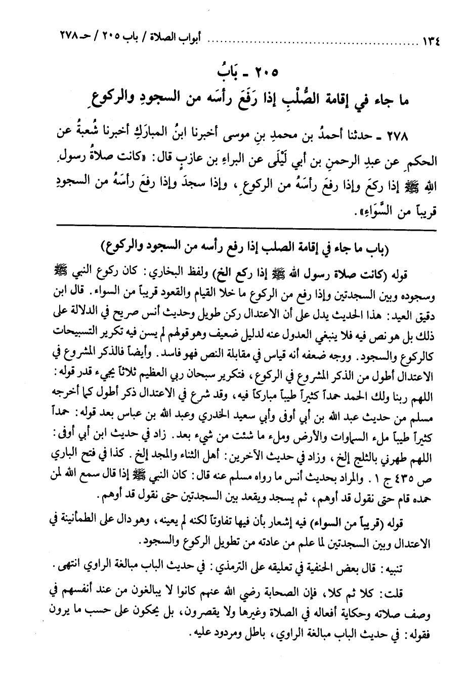 وَالرُّكُوعِ [279] قَوْلُهُ (كَانَتْ صَلَاةُ رَسُولِ اللَّهِ صَلَّى اللَّهُ عَلَيْهِ وسلم إِذَا رَكَعَ إِلَخْ) وَلَفْظُ الْبُخَارِيِّ كَانَ رُكُوعُ النَّبِيِّ صَلَّى اللَّهُ عَلَيْهِ وَسَلَّمَ وَسُجُودُهُ وَبَيْنَ السجدتين وإذا رفع من الركوع ماخلا القيام والقعود قريبا من السواء قال بن دَقِيقِ الْعِيدِ هَذَا الْحَدِيثُ يَدُلُّ عَلَى أَنَّ الِاعْتِدَالَ رُكْنٌ طَوِيلٌ وَحَدِيثُ أَنَسٍ صَرِيحٌ فِي الدَّلَالَةِ عَلَى ذَلِكَ بَلْ هُوَ نَصٌّ فِيهِ فَلَا يَنْبَغِي الْعُدُولُ عَنْهُ لِدَلِيلٍ ضَعِيفٍ وَهُوَ قَوْلُهُمْ لَمْ يُسَنَّ فِيهِ تَكْرِيرُ التَّسْبِيحَاتِ كَالرُّكُوعِ والسجود
