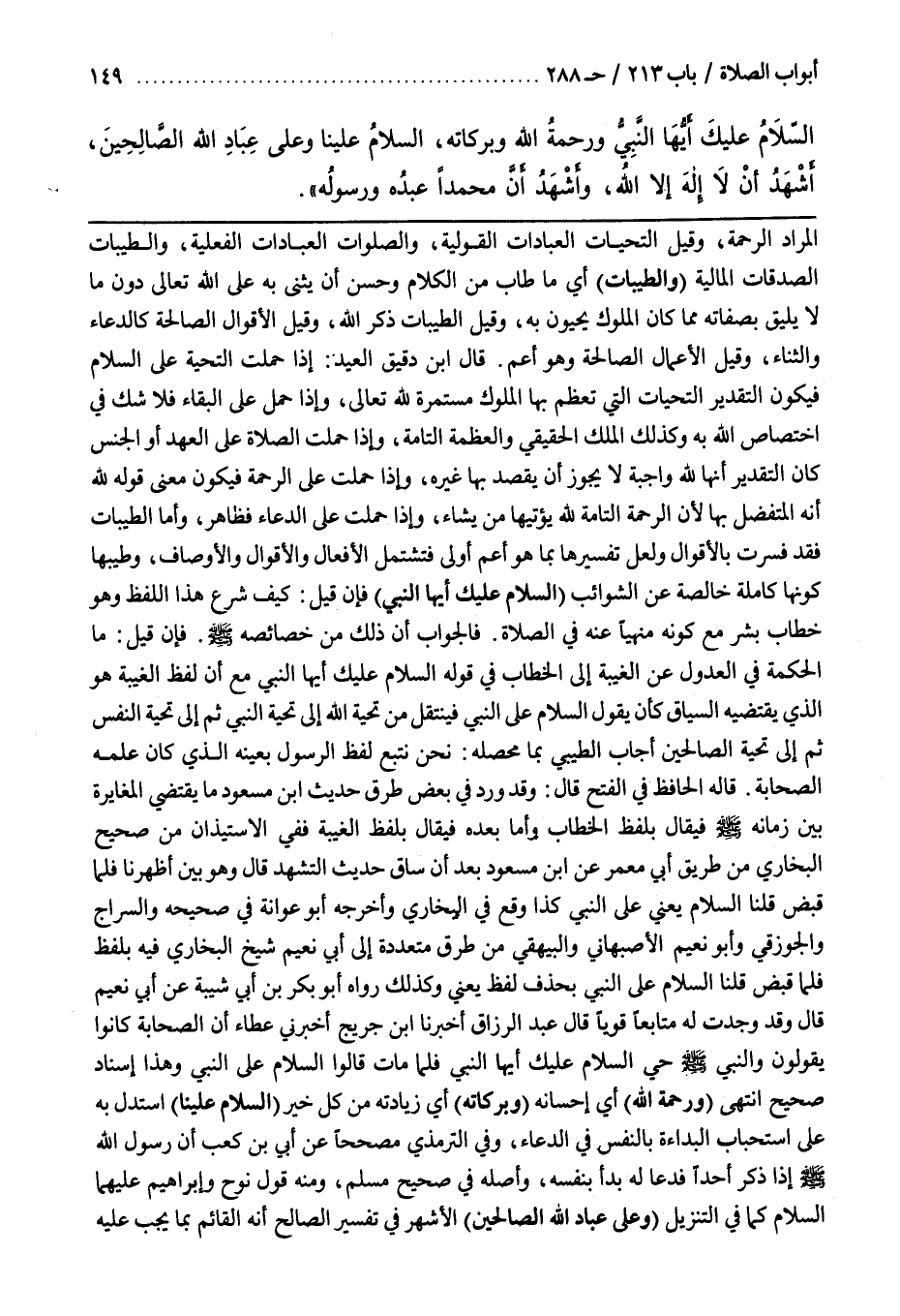 فَإِنْ قِيلَ مَا الْحِكْمَةُ فِي الْعُدُولِ عَنِ الغَيْبَةِ إِلَى الْخِطَابِ فِي قَوْلِهِ عَلَيْكَ أَيُّهَا النَّبِيُّ مَعَ أَنَّ لَفْظَ الْغَيْبَةِ هُوَ الَّذِي يَقْتَضِيهِ السِّيَاقُ كَأَنْ يَقُولَ السَّلَامُ عَلَى النَّبِيِّ فَيَنْتَقِلُ مِنْ تَحِيَّةِ اللَّهِ إِلَى تَحِيَّةِ النَّبِيِّ ثُمَّ إِلَى تَحِيَّةِ النَّفْسِ ثُمَّ إِلَى تَحِيَّةِ الصَّالِحِينَ أَجَابَ الطِّيبِيُّ بِمَا مُحَصَّلُهُ نَحْنُ نَتَّبِعُ لَفْظَ الرَّسُولِ بِعَيْنِهِ الَّذِي كَانَ عَلَّمَهُ الصَّحَابَةَ